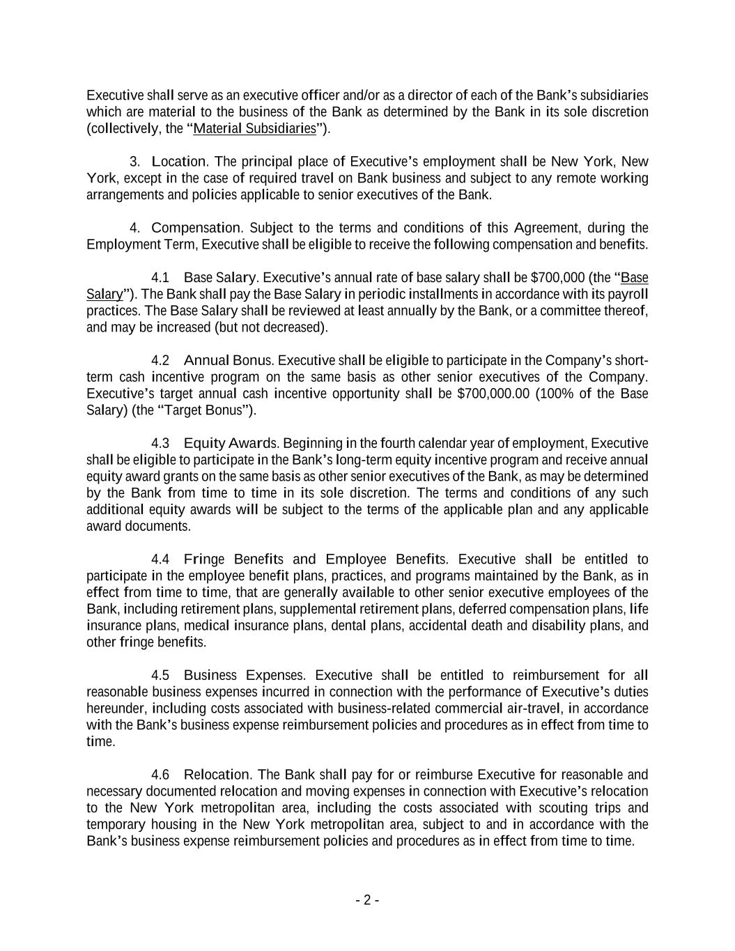 - 2 - Executive shall serve as an executive officer and/or as a director of each of the Bank’s subsidiaries which are material to the business of the Bank as determined by the Bank in its sole discretion (collectively, the “Material Subsidiaries”). 3. Location. The principal place of Executive’s employment shall be New York, New York, except in the case of required travel on Bank business and subject to any remote working arrangements and policies applicable to senior executives of the Bank. 4. Compensation. Subject to the terms and conditions of this Agreement, during the Employment Term, Executive shall be eligible to receive the following compensation and benefits. 4.1 Base Salary. Executive’s annual rate of base salary shall be $700,000 (the “Base Salary”). The Bank shall pay the Base Salary in periodic installments in accordance with its payroll practices. The Base Salary shall be reviewed at least annually by the Bank, or a committee thereof, and may be increased (but not decreased). 4.2 Annual Bonus. Executive shall be eligible to participate in the Company’s short- term cash incentive program on the same basis as other senior executives of the Company. Executive’s target annual cash incentive opportunity shall be $700,000.00 (100% of the Base Salary) (the “Target Bonus”). 4.3 Equity Awards. Beginning in the fourth calendar year of employment, Executive shall be eligible to participate in the Bank’s long-term equity incentive program and receive annual equity award grants on the same basis as other senior executives of the Bank, as may be determined by the Bank from time to time in its sole discretion. The terms and conditions of any such additional equity awards will be subject to the terms of the applicable plan and any applicable award documents. 4.4 Fringe Benefits and Employee Benefits. Executive shall be entitled to participate in the employee benefit plans, practices, and programs maintained by the Bank, as in effect from time to time, that are generally available to other senior executive employees of the Bank, including retirement plans, supplemental retirement plans, deferred compensation plans, life insurance plans, medical insurance plans, dental plans, accidental death and disability plans, and other fringe benefits. 4.5 Business Expenses. Executive shall be entitled to reimbursement for all reasonable business expenses incurred in connection with the performance of Executive’s duties hereunder, including costs associated with business-related commercial air-travel, in accordance with the Bank’s business expense reimbursement policies and procedures as in effect from time to time. 4.6 Relocation. The Bank shall pay for or reimburse Executive for reasonable and necessary documented relocation and moving expenses in connection with Executive’s relocation to the New York metropolitan area, including the costs associated with scouting trips and temporary housing in the New York metropolitan area, subject to and in accordance with the Bank’s business expense reimbursement policies and procedures as in effect from time to time.