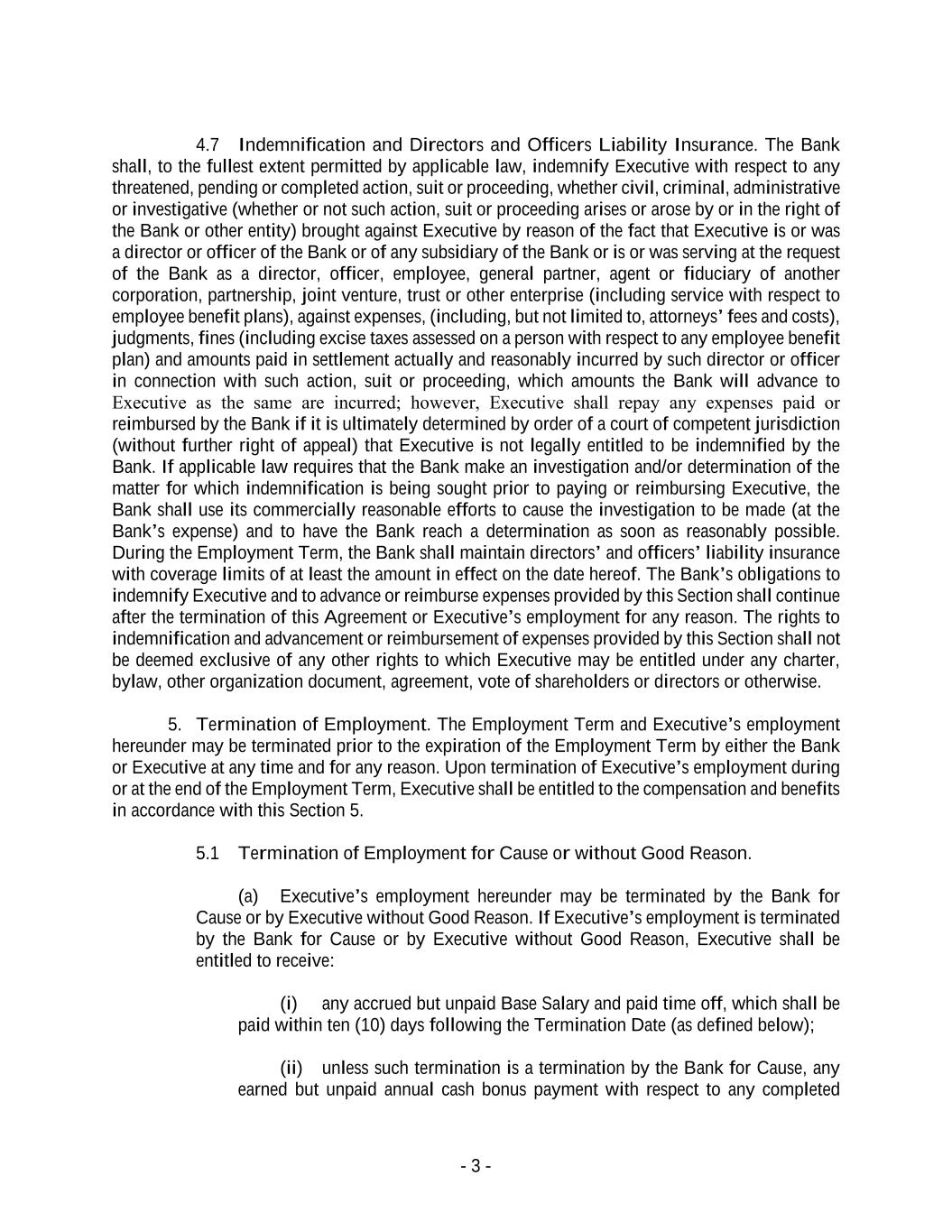 - 3 - 4.7 Indemnification and Directors and Officers Liability Insurance. The Bank shall, to the fullest extent permitted by applicable law, indemnify Executive with respect to any threatened, pending or completed action, suit or proceeding, whether civil, criminal, administrative or investigative (whether or not such action, suit or proceeding arises or arose by or in the right of the Bank or other entity) brought against Executive by reason of the fact that Executive is or was a director or officer of the Bank or of any subsidiary of the Bank or is or was serving at the request of the Bank as a director, officer, employee, general partner, agent or fiduciary of another corporation, partnership, joint venture, trust or other enterprise (including service with respect to employee benefit plans), against expenses, (including, but not limited to, attorneys’ fees and costs), judgments, fines (including excise taxes assessed on a person with respect to any employee benefit plan) and amounts paid in settlement actually and reasonably incurred by such director or officer in connection with such action, suit or proceeding, which amounts the Bank will advance to Executive as the same are incurred; however, Executive shall repay any expenses paid or reimbursed by the Bank if it is ultimately determined by order of a court of competent jurisdiction (without further right of appeal) that Executive is not legally entitled to be indemnified by the Bank. If applicable law requires that the Bank make an investigation and/or determination of the matter for which indemnification is being sought prior to paying or reimbursing Executive, the Bank shall use its commercially reasonable efforts to cause the investigation to be made (at the Bank’s expense) and to have the Bank reach a determination as soon as reasonably possible. During the Employment Term, the Bank shall maintain directors’ and officers’ liability insurance with coverage limits of at least the amount in effect on the date hereof. The Bank’s obligations to indemnify Executive and to advance or reimburse expenses provided by this Section shall continue after the termination of this Agreement or Executive’s employment for any reason. The rights to indemnification and advancement or reimbursement of expenses provided by this Section shall not be deemed exclusive of any other rights to which Executive may be entitled under any charter, bylaw, other organization document, agreement, vote of shareholders or directors or otherwise. 5. Termination of Employment. The Employment Term and Executive’s employment hereunder may be terminated prior to the expiration of the Employment Term by either the Bank or Executive at any time and for any reason. Upon termination of Executive’s employment during or at the end of the Employment Term, Executive shall be entitled to the compensation and benefits in accordance with this Section 5. 5.1 Termination of Employment for Cause or without Good Reason. (a) Executive’s employment hereunder may be terminated by the Bank for Cause or by Executive without Good Reason. If Executive’s employment is terminated by the Bank for Cause or by Executive without Good Reason, Executive shall be entitled to receive: (i) any accrued but unpaid Base Salary and paid time off, which shall be paid within ten (10) days following the Termination Date (as defined below); (ii) unless such termination is a termination by the Bank for Cause, any earned but unpaid annual cash bonus payment with respect to any completed