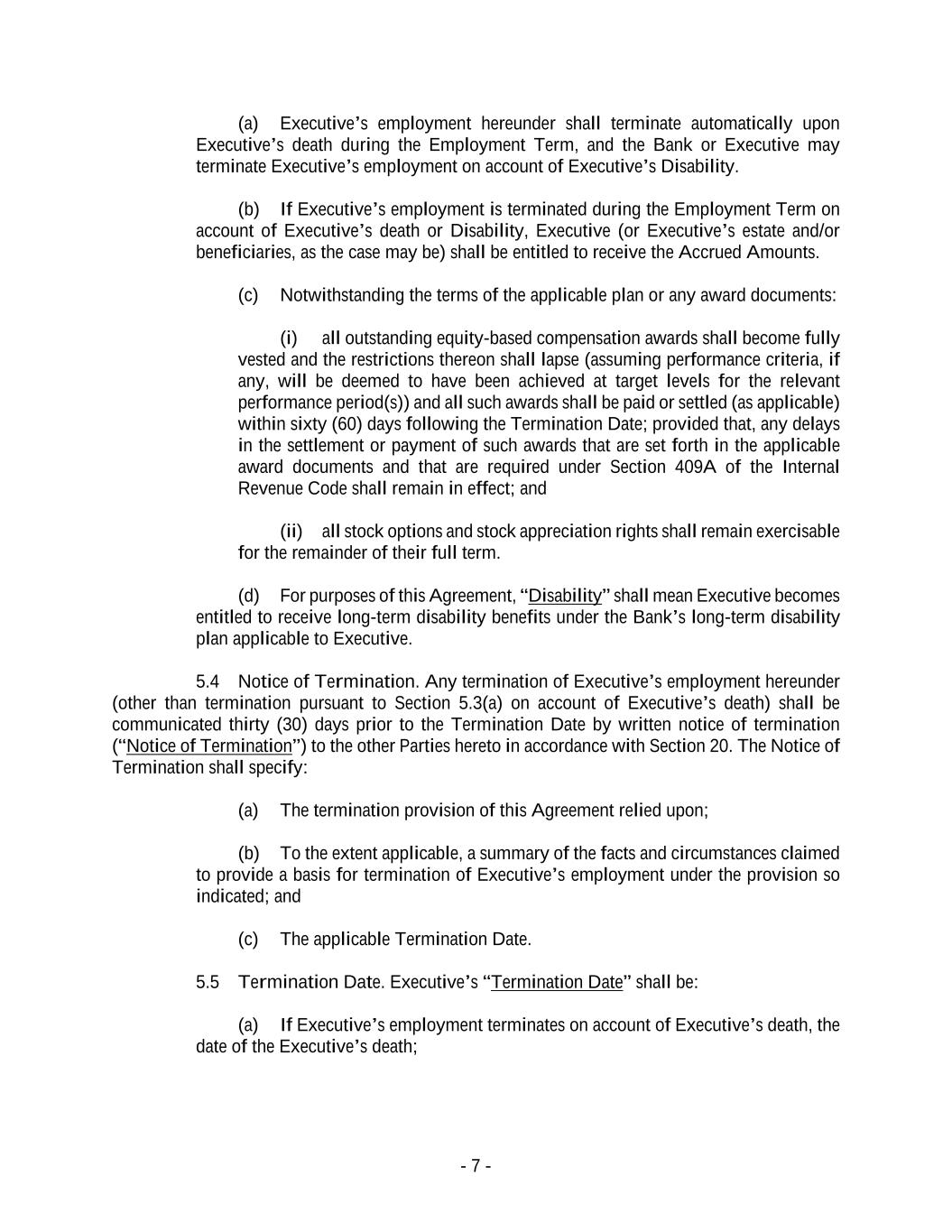 - 7 - (a) Executive’s employment hereunder shall terminate automatically upon Executive’s death during the Employment Term, and the Bank or Executive may terminate Executive’s employment on account of Executive’s Disability. (b) If Executive’s employment is terminated during the Employment Term on account of Executive’s death or Disability, Executive (or Executive’s estate and/or beneficiaries, as the case may be) shall be entitled to receive the Accrued Amounts. (c) Notwithstanding the terms of the applicable plan or any award documents: (i) all outstanding equity-based compensation awards shall become fully vested and the restrictions thereon shall lapse (assuming performance criteria, if any, will be deemed to have been achieved at target levels for the relevant performance period(s)) and all such awards shall be paid or settled (as applicable) within sixty (60) days following the Termination Date; provided that, any delays in the settlement or payment of such awards that are set forth in the applicable award documents and that are required under Section 409A of the Internal Revenue Code shall remain in effect; and (ii) all stock options and stock appreciation rights shall remain exercisable for the remainder of their full term. (d) For purposes of this Agreement, “Disability” shall mean Executive becomes entitled to receive long-term disability benefits under the Bank’s long-term disability plan applicable to Executive. 5.4 Notice of Termination. Any termination of Executive’s employment hereunder (other than termination pursuant to Section 5.3(a) on account of Executive’s death) shall be communicated thirty (30) days prior to the Termination Date by written notice of termination (“Notice of Termination”) to the other Parties hereto in accordance with Section 20. The Notice of Termination shall specify: (a) The termination provision of this Agreement relied upon; (b) To the extent applicable, a summary of the facts and circumstances claimed to provide a basis for termination of Executive’s employment under the provision so indicated; and (c) The applicable Termination Date. 5.5 Termination Date. Executive’s “Termination Date” shall be: (a) If Executive’s employment terminates on account of Executive’s death, the date of the Executive’s death;