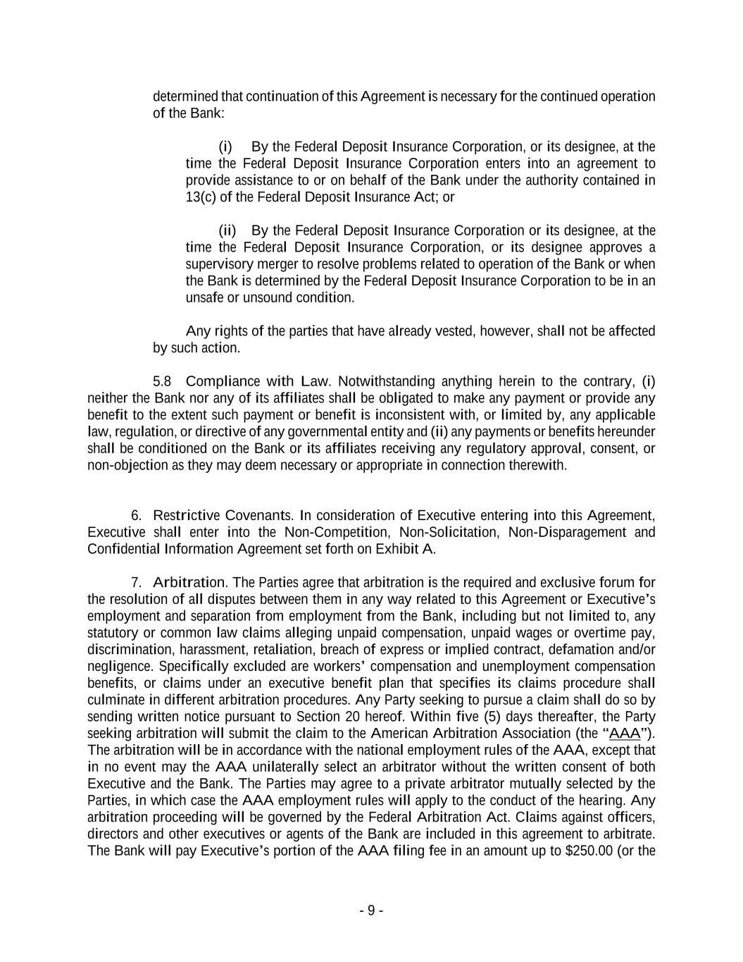 - 9 - determined that continuation of this Agreement is necessary for the continued operation of the Bank: (i) By the Federal Deposit Insurance Corporation, or its designee, at the time the Federal Deposit Insurance Corporation enters into an agreement to provide assistance to or on behalf of the Bank under the authority contained in 13(c) of the Federal Deposit Insurance Act; or (ii) By the Federal Deposit Insurance Corporation or its designee, at the time the Federal Deposit Insurance Corporation, or its designee approves a supervisory merger to resolve problems related to operation of the Bank or when the Bank is determined by the Federal Deposit Insurance Corporation to be in an unsafe or unsound condition. Any rights of the parties that have already vested, however, shall not be affected by such action. 5.8 Compliance with Law. Notwithstanding anything herein to the contrary, (i) neither the Bank nor any of its affiliates shall be obligated to make any payment or provide any benefit to the extent such payment or benefit is inconsistent with, or limited by, any applicable law, regulation, or directive of any governmental entity and (ii) any payments or benefits hereunder shall be conditioned on the Bank or its affiliates receiving any regulatory approval, consent, or non-objection as they may deem necessary or appropriate in connection therewith. 6. Restrictive Covenants. In consideration of Executive entering into this Agreement, Executive shall enter into the Non-Competition, Non-Solicitation, Non-Disparagement and Confidential Information Agreement set forth on Exhibit A. 7. Arbitration. The Parties agree that arbitration is the required and exclusive forum for the resolution of all disputes between them in any way related to this Agreement or Executive’s employment and separation from employment from the Bank, including but not limited to, any statutory or common law claims alleging unpaid compensation, unpaid wages or overtime pay, discrimination, harassment, retaliation, breach of express or implied contract, defamation and/or negligence. Specifically excluded are workers’ compensation and unemployment compensation benefits, or claims under an executive benefit plan that specifies its claims procedure shall culminate in different arbitration procedures. Any Party seeking to pursue a claim shall do so by sending written notice pursuant to Section 20 hereof. Within five (5) days thereafter, the Party seeking arbitration will submit the claim to the American Arbitration Association (the “AAA”). The arbitration will be in accordance with the national employment rules of the AAA, except that in no event may the AAA unilaterally select an arbitrator without the written consent of both Executive and the Bank. The Parties may agree to a private arbitrator mutually selected by the Parties, in which case the AAA employment rules will apply to the conduct of the hearing. Any arbitration proceeding will be governed by the Federal Arbitration Act. Claims against officers, directors and other executives or agents of the Bank are included in this agreement to arbitrate. The Bank will pay Executive’s portion of the AAA filing fee in an amount up to $250.00 (or the