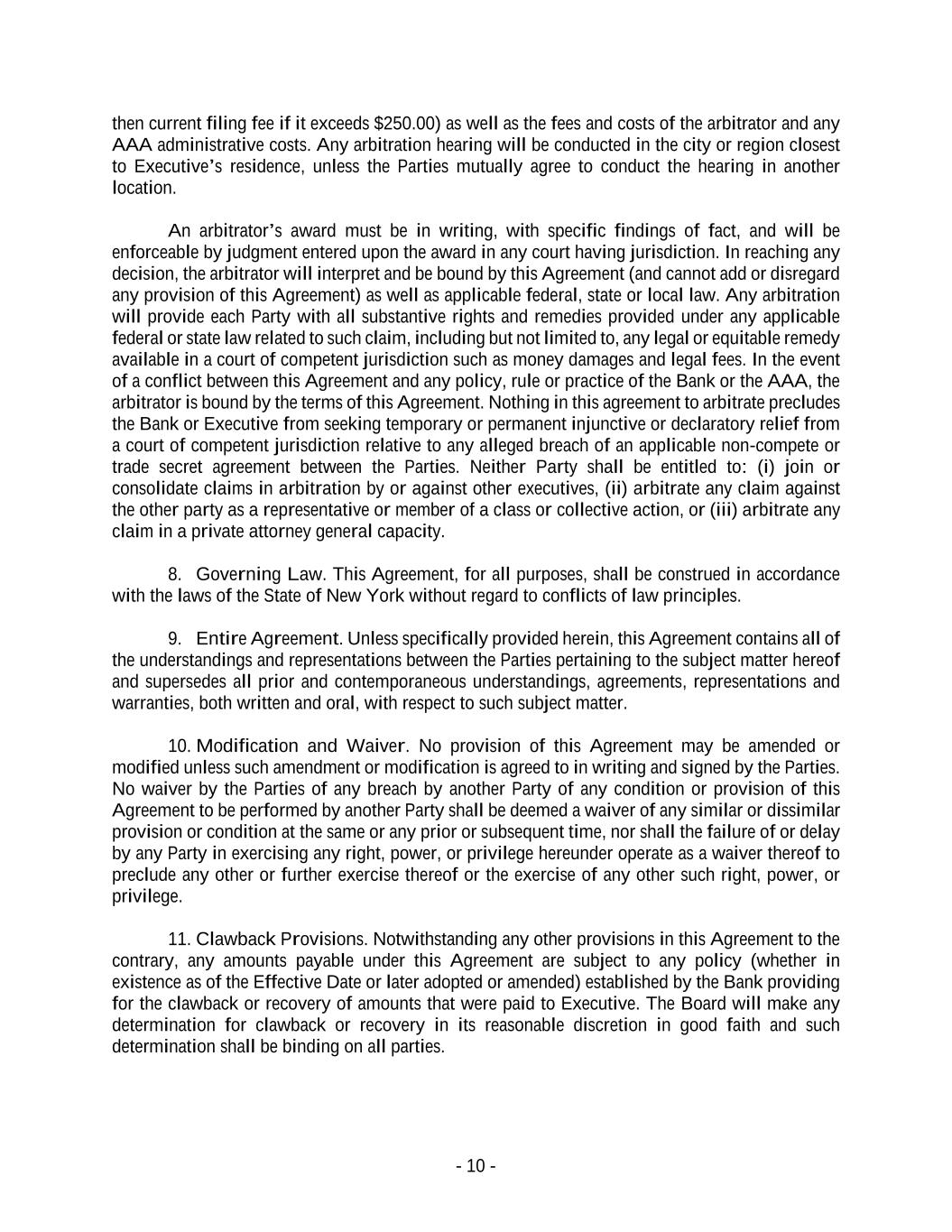 - 10 - then current filing fee if it exceeds $250.00) as well as the fees and costs of the arbitrator and any AAA administrative costs. Any arbitration hearing will be conducted in the city or region closest to Executive’s residence, unless the Parties mutually agree to conduct the hearing in another location. An arbitrator’s award must be in writing, with specific findings of fact, and will be enforceable by judgment entered upon the award in any court having jurisdiction. In reaching any decision, the arbitrator will interpret and be bound by this Agreement (and cannot add or disregard any provision of this Agreement) as well as applicable federal, state or local law. Any arbitration will provide each Party with all substantive rights and remedies provided under any applicable federal or state law related to such claim, including but not limited to, any legal or equitable remedy available in a court of competent jurisdiction such as money damages and legal fees. In the event of a conflict between this Agreement and any policy, rule or practice of the Bank or the AAA, the arbitrator is bound by the terms of this Agreement. Nothing in this agreement to arbitrate precludes the Bank or Executive from seeking temporary or permanent injunctive or declaratory relief from a court of competent jurisdiction relative to any alleged breach of an applicable non-compete or trade secret agreement between the Parties. Neither Party shall be entitled to: (i) join or consolidate claims in arbitration by or against other executives, (ii) arbitrate any claim against the other party as a representative or member of a class or collective action, or (iii) arbitrate any claim in a private attorney general capacity. 8. Governing Law. This Agreement, for all purposes, shall be construed in accordance with the laws of the State of New York without regard to conflicts of law principles. 9. Entire Agreement. Unless specifically provided herein, this Agreement contains all of the understandings and representations between the Parties pertaining to the subject matter hereof and supersedes all prior and contemporaneous understandings, agreements, representations and warranties, both written and oral, with respect to such subject matter. 10. Modification and Waiver. No provision of this Agreement may be amended or modified unless such amendment or modification is agreed to in writing and signed by the Parties. No waiver by the Parties of any breach by another Party of any condition or provision of this Agreement to be performed by another Party shall be deemed a waiver of any similar or dissimilar provision or condition at the same or any prior or subsequent time, nor shall the failure of or delay by any Party in exercising any right, power, or privilege hereunder operate as a waiver thereof to preclude any other or further exercise thereof or the exercise of any other such right, power, or privilege. 11. Clawback Provisions. Notwithstanding any other provisions in this Agreement to the contrary, any amounts payable under this Agreement are subject to any policy (whether in existence as of the Effective Date or later adopted or amended) established by the Bank providing for the clawback or recovery of amounts that were paid to Executive. The Board will make any determination for clawback or recovery in its reasonable discretion in good faith and such determination shall be binding on all parties.