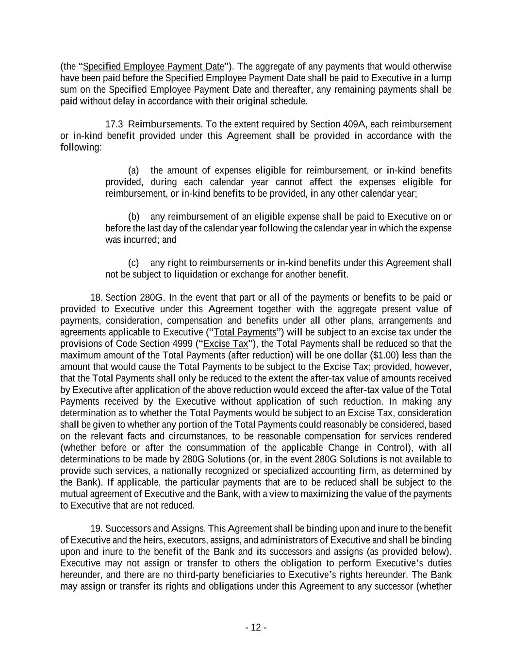 - 12 - (the “Specified Employee Payment Date”). The aggregate of any payments that would otherwise have been paid before the Specified Employee Payment Date shall be paid to Executive in a lump sum on the Specified Employee Payment Date and thereafter, any remaining payments shall be paid without delay in accordance with their original schedule. 17.3 Reimbursements. To the extent required by Section 409A, each reimbursement or in-kind benefit provided under this Agreement shall be provided in accordance with the following: (a) the amount of expenses eligible for reimbursement, or in-kind benefits provided, during each calendar year cannot affect the expenses eligible for reimbursement, or in-kind benefits to be provided, in any other calendar year; (b) any reimbursement of an eligible expense shall be paid to Executive on or before the last day of the calendar year following the calendar year in which the expense was incurred; and (c) any right to reimbursements or in-kind benefits under this Agreement shall not be subject to liquidation or exchange for another benefit. 18. Section 280G. In the event that part or all of the payments or benefits to be paid or provided to Executive under this Agreement together with the aggregate present value of payments, consideration, compensation and benefits under all other plans, arrangements and agreements applicable to Executive (“Total Payments”) will be subject to an excise tax under the provisions of Code Section 4999 (“Excise Tax”), the Total Payments shall be reduced so that the maximum amount of the Total Payments (after reduction) will be one dollar ($1.00) less than the amount that would cause the Total Payments to be subject to the Excise Tax; provided, however, that the Total Payments shall only be reduced to the extent the after-tax value of amounts received by Executive after application of the above reduction would exceed the after-tax value of the Total Payments received by the Executive without application of such reduction. In making any determination as to whether the Total Payments would be subject to an Excise Tax, consideration shall be given to whether any portion of the Total Payments could reasonably be considered, based on the relevant facts and circumstances, to be reasonable compensation for services rendered (whether before or after the consummation of the applicable Change in Control), with all determinations to be made by 280G Solutions (or, in the event 280G Solutions is not available to provide such services, a nationally recognized or specialized accounting firm, as determined by the Bank). If applicable, the particular payments that are to be reduced shall be subject to the mutual agreement of Executive and the Bank, with a view to maximizing the value of the payments to Executive that are not reduced. 19. Successors and Assigns. This Agreement shall be binding upon and inure to the benefit of Executive and the heirs, executors, assigns, and administrators of Executive and shall be binding upon and inure to the benefit of the Bank and its successors and assigns (as provided below). Executive may not assign or transfer to others the obligation to perform Executive’s duties hereunder, and there are no third-party beneficiaries to Executive’s rights hereunder. The Bank may assign or transfer its rights and obligations under this Agreement to any successor (whether