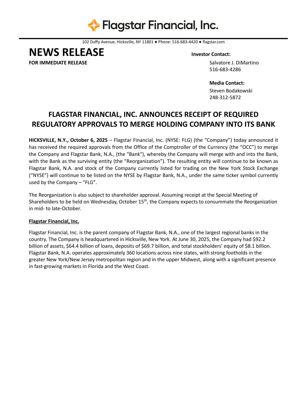 102 Duffy Avenue, Hicksville, NY 11801 ● Phone: 516-683-4420 ● flagstar.com NEWS RELEASE Investor Contact: FOR IMMEDIATE RELEASE Salvatore J. DiMartino 516-683-4286 Media Contact: Steven Bodakowski 248-312-5872 FLAGSTAR FINANCIAL, INC. ANNOUNCES RECEIPT OF REQUIRED REGULATORY APPROVALS TO MERGE HOLDING COMPANY INTO ITS BANK HICKSVILLE, N.Y., October 6, 2025 – Flagstar Financial, Inc. (NYSE: FLG) (the “Company”) today announced it has received the required approvals from the Office of the Comptroller of the Currency (the “OCC”) to merge the Company and Flagstar Bank, N.A., (the "Bank"), whereby the Company will merge with and into the Bank, with the Bank as the surviving entity (the “Reorganization”). The resulting entity will continue to be known as Flagstar Bank, N.A. and stock of the Company currently listed for trading on the New York Stock Exchange (“NYSE”) will continue to be listed on the NYSE by Flagstar Bank, N.A., under the same ticker symbol currently used by the Company – “FLG”. The Reorganization is also subject to shareholder approval. Assuming receipt at the Special Meeting of Shareholders to be held on Wednesday, October 15th, the Company expects to consummate the Reorganization in mid- to late-October. Flagstar Financial, Inc. Flagstar Financial, Inc. is the parent company of Flagstar Bank, N.A., one of the largest regional banks in the country. The Company is headquartered in Hicksville, New York. At June 30, 2025, the Company had $92.2 billion of assets, $64.4 billion of loans, deposits of $69.7 billion, and total stockholders' equity of $8.1 billion. Flagstar Bank, N.A. operates approximately 360 locations across nine states, with strong footholds in the greater New York/New Jersey metropolitan region and in the upper Midwest, along with a significant presence in fast-growing markets in Florida and the West Coast.