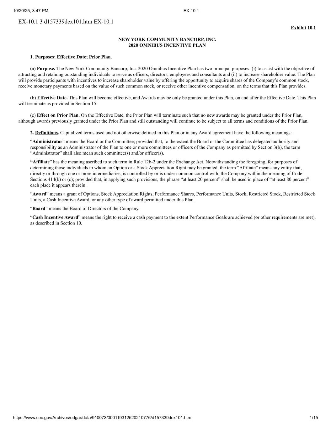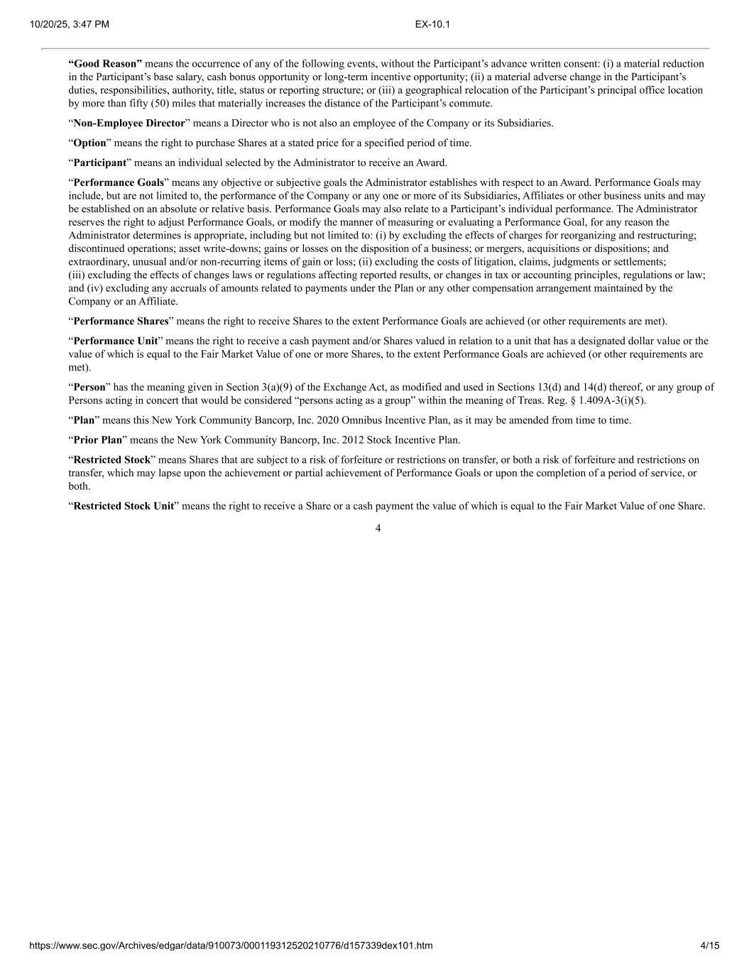 “Good Reason” means the occurrence of any of the following events, without the Participant’s advance written consent: (i) a material reduction in the Participant’s base salary, cash bonus opportunity or long-term incentive opportunity; (ii) a material adverse change in the Participant’s duties, responsibilities, authority, title, status or reporting structure; or (iii) a geographical relocation of the Participant’s principal office location by more than fifty (50) miles that materially increases the distance of the Participant’s commute. “Non-Employee Director” means a Director who is not also an employee of the Company or its Subsidiaries. “Option” means the right to purchase Shares at a stated price for a specified period of time. “Participant” means an individual selected by the Administrator to receive an Award. “Performance Goals” means any objective or subjective goals the Administrator establishes with respect to an Award. Performance Goals may include, but are not limited to, the performance of the Company or any one or more of its Subsidiaries, Affiliates or other business units and may be established on an absolute or relative basis. Performance Goals may also relate to a Participant’s individual performance. The Administrator reserves the right to adjust Performance Goals, or modify the manner of measuring or evaluating a Performance Goal, for any reason the Administrator determines is appropriate, including but not limited to: (i) by excluding the effects of charges for reorganizing and restructuring; discontinued operations; asset write-downs; gains or losses on the disposition of a business; or mergers, acquisitions or dispositions; and extraordinary, unusual and/or non-recurring items of gain or loss; (ii) excluding the costs of litigation, claims, judgments or settlements; (iii) excluding the effects of changes laws or regulations affecting reported results, or changes in tax or accounting principles, regulations or law; and (iv) excluding any accruals of amounts related to payments under the Plan or any other compensation arrangement maintained by the Company or an Affiliate. “Performance Shares” means the right to receive Shares to the extent Performance Goals are achieved (or other requirements are met). “Performance Unit” means the right to receive a cash payment and/or Shares valued in relation to a unit that has a designated dollar value or the value of which is equal to the Fair Market Value of one or more Shares, to the extent Performance Goals are achieved (or other requirements are met). “Person” has the meaning given in Section 3(a)(9) of the Exchange Act, as modified and used in Sections 13(d) and 14(d) thereof, or any group of Persons acting in concert that would be considered “persons acting as a group” within the meaning of Treas. Reg. § 1.409A-3(i)(5). “Plan” means this New York Community Bancorp, Inc. 2020 Omnibus Incentive Plan, as it may be amended from time to time. “Prior Plan” means the New York Community Bancorp, Inc. 2012 Stock Incentive Plan. “Restricted Stock” means Shares that are subject to a risk of forfeiture or restrictions on transfer, or both a risk of forfeiture and restrictions on transfer, which may lapse upon the achievement or partial achievement of Performance Goals or upon the completion of a period of service, or both. “Restricted Stock Unit” means the right to receive a Share or a cash payment the value of which is equal to the Fair Market Value of one Share. 4 10/20/25, 3:47 PM EX-10.1 https://www.sec.gov/Archives/edgar/data/910073/000119312520210776/d157339dex101.htm 4/15