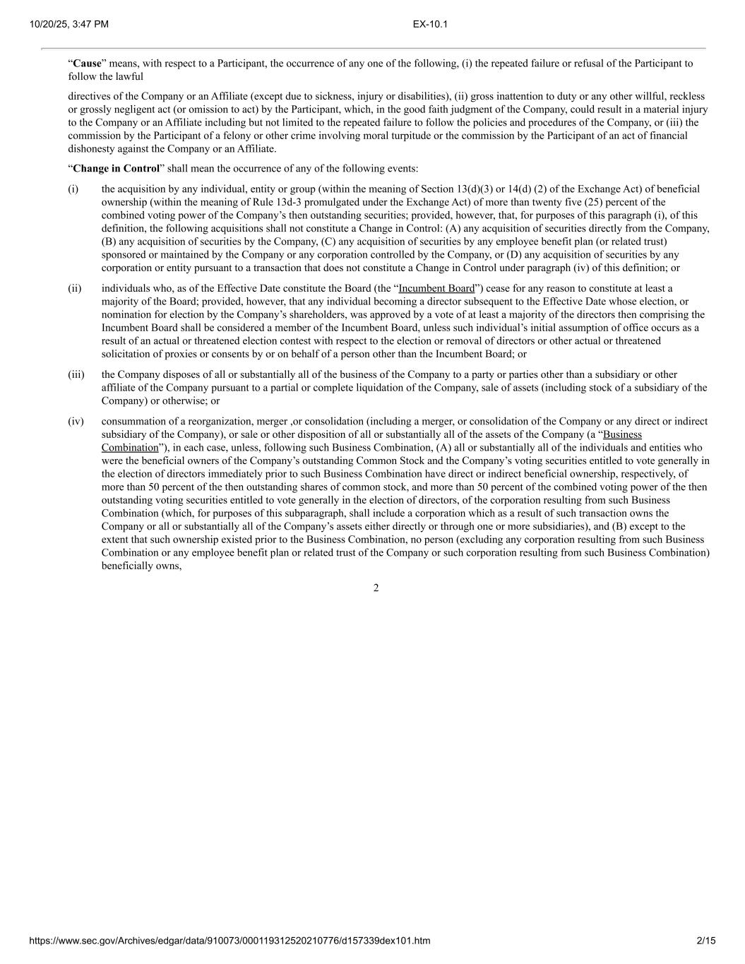 “Cause” means, with respect to a Participant, the occurrence of any one of the following, (i) the repeated failure or refusal of the Participant to follow the lawful directives of the Company or an Affiliate (except due to sickness, injury or disabilities), (ii) gross inattention to duty or any other willful, reckless or grossly negligent act (or omission to act) by the Participant, which, in the good faith judgment of the Company, could result in a material injury to the Company or an Affiliate including but not limited to the repeated failure to follow the policies and procedures of the Company, or (iii) the commission by the Participant of a felony or other crime involving moral turpitude or the commission by the Participant of an act of financial dishonesty against the Company or an Affiliate. “Change in Control” shall mean the occurrence of any of the following events: (i) the acquisition by any individual, entity or group (within the meaning of Section 13(d)(3) or 14(d) (2) of the Exchange Act) of beneficial ownership (within the meaning of Rule 13d-3 promulgated under the Exchange Act) of more than twenty five (25) percent of the combined voting power of the Company’s then outstanding securities; provided, however, that, for purposes of this paragraph (i), of this definition, the following acquisitions shall not constitute a Change in Control: (A) any acquisition of securities directly from the Company, (B) any acquisition of securities by the Company, (C) any acquisition of securities by any employee benefit plan (or related trust) sponsored or maintained by the Company or any corporation controlled by the Company, or (D) any acquisition of securities by any corporation or entity pursuant to a transaction that does not constitute a Change in Control under paragraph (iv) of this definition; or (ii) individuals who, as of the Effective Date constitute the Board (the “Incumbent Board”) cease for any reason to constitute at least a majority of the Board; provided, however, that any individual becoming a director subsequent to the Effective Date whose election, or nomination for election by the Company’s shareholders, was approved by a vote of at least a majority of the directors then comprising the Incumbent Board shall be considered a member of the Incumbent Board, unless such individual’s initial assumption of office occurs as a result of an actual or threatened election contest with respect to the election or removal of directors or other actual or threatened solicitation of proxies or consents by or on behalf of a person other than the Incumbent Board; or (iii) the Company disposes of all or substantially all of the business of the Company to a party or parties other than a subsidiary or other affiliate of the Company pursuant to a partial or complete liquidation of the Company, sale of assets (including stock of a subsidiary of the Company) or otherwise; or (iv) consummation of a reorganization, merger ,or consolidation (including a merger, or consolidation of the Company or any direct or indirect subsidiary of the Company), or sale or other disposition of all or substantially all of the assets of the Company (a “Business Combination”), in each case, unless, following such Business Combination, (A) all or substantially all of the individuals and entities who were the beneficial owners of the Company’s outstanding Common Stock and the Company’s voting securities entitled to vote generally in the election of directors immediately prior to such Business Combination have direct or indirect beneficial ownership, respectively, of more than 50 percent of the then outstanding shares of common stock, and more than 50 percent of the combined voting power of the then outstanding voting securities entitled to vote generally in the election of directors, of the corporation resulting from such Business Combination (which, for purposes of this subparagraph, shall include a corporation which as a result of such transaction owns the Company or all or substantially all of the Company’s assets either directly or through one or more subsidiaries), and (B) except to the extent that such ownership existed prior to the Business Combination, no person (excluding any corporation resulting from such Business Combination or any employee benefit plan or related trust of the Company or such corporation resulting from such Business Combination) beneficially owns, 2 10/20/25, 3:47 PM EX-10.1 https://www.sec.gov/Archives/edgar/data/910073/000119312520210776/d157339dex101.htm 2/15