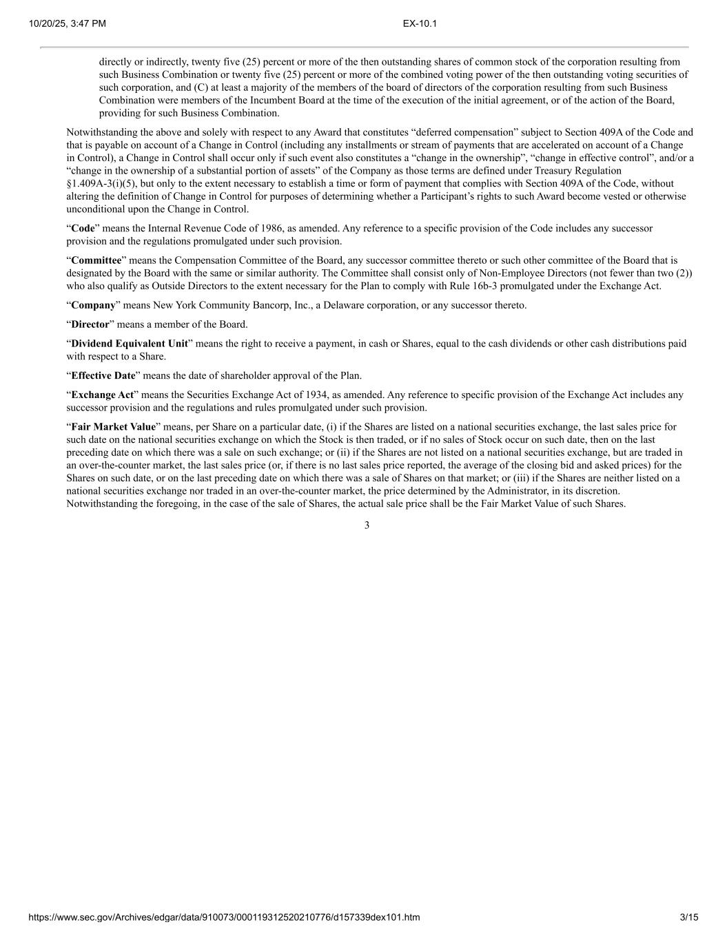 directly or indirectly, twenty five (25) percent or more of the then outstanding shares of common stock of the corporation resulting from such Business Combination or twenty five (25) percent or more of the combined voting power of the then outstanding voting securities of such corporation, and (C) at least a majority of the members of the board of directors of the corporation resulting from such Business Combination were members of the Incumbent Board at the time of the execution of the initial agreement, or of the action of the Board, providing for such Business Combination. Notwithstanding the above and solely with respect to any Award that constitutes “deferred compensation” subject to Section 409A of the Code and that is payable on account of a Change in Control (including any installments or stream of payments that are accelerated on account of a Change in Control), a Change in Control shall occur only if such event also constitutes a “change in the ownership”, “change in effective control”, and/or a “change in the ownership of a substantial portion of assets” of the Company as those terms are defined under Treasury Regulation §1.409A-3(i)(5), but only to the extent necessary to establish a time or form of payment that complies with Section 409A of the Code, without altering the definition of Change in Control for purposes of determining whether a Participant’s rights to such Award become vested or otherwise unconditional upon the Change in Control. “Code” means the Internal Revenue Code of 1986, as amended. Any reference to a specific provision of the Code includes any successor provision and the regulations promulgated under such provision. “Committee” means the Compensation Committee of the Board, any successor committee thereto or such other committee of the Board that is designated by the Board with the same or similar authority. The Committee shall consist only of Non-Employee Directors (not fewer than two (2)) who also qualify as Outside Directors to the extent necessary for the Plan to comply with Rule 16b-3 promulgated under the Exchange Act. “Company” means New York Community Bancorp, Inc., a Delaware corporation, or any successor thereto. “Director” means a member of the Board. “Dividend Equivalent Unit” means the right to receive a payment, in cash or Shares, equal to the cash dividends or other cash distributions paid with respect to a Share. “Effective Date” means the date of shareholder approval of the Plan. “Exchange Act” means the Securities Exchange Act of 1934, as amended. Any reference to specific provision of the Exchange Act includes any successor provision and the regulations and rules promulgated under such provision. “Fair Market Value” means, per Share on a particular date, (i) if the Shares are listed on a national securities exchange, the last sales price for such date on the national securities exchange on which the Stock is then traded, or if no sales of Stock occur on such date, then on the last preceding date on which there was a sale on such exchange; or (ii) if the Shares are not listed on a national securities exchange, but are traded in an over-the-counter market, the last sales price (or, if there is no last sales price reported, the average of the closing bid and asked prices) for the Shares on such date, or on the last preceding date on which there was a sale of Shares on that market; or (iii) if the Shares are neither listed on a national securities exchange nor traded in an over-the-counter market, the price determined by the Administrator, in its discretion. Notwithstanding the foregoing, in the case of the sale of Shares, the actual sale price shall be the Fair Market Value of such Shares. 3 10/20/25, 3:47 PM EX-10.1 https://www.sec.gov/Archives/edgar/data/910073/000119312520210776/d157339dex101.htm 3/15