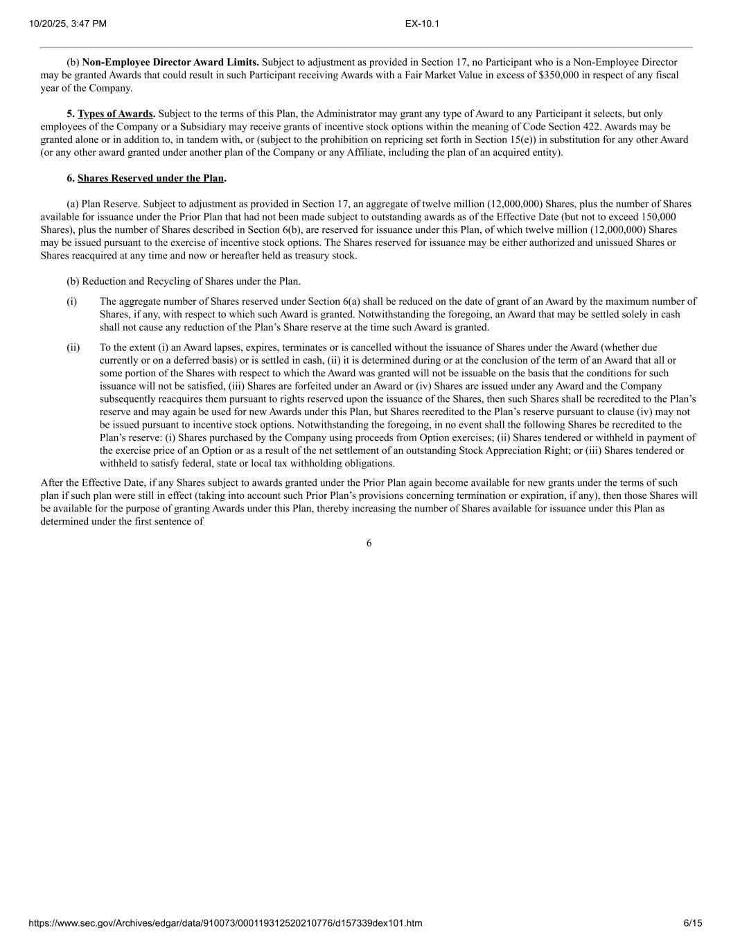 (b) Non-Employee Director Award Limits. Subject to adjustment as provided in Section 17, no Participant who is a Non-Employee Director may be granted Awards that could result in such Participant receiving Awards with a Fair Market Value in excess of $350,000 in respect of any fiscal year of the Company. 5. Types of Awards. Subject to the terms of this Plan, the Administrator may grant any type of Award to any Participant it selects, but only employees of the Company or a Subsidiary may receive grants of incentive stock options within the meaning of Code Section 422. Awards may be granted alone or in addition to, in tandem with, or (subject to the prohibition on repricing set forth in Section 15(e)) in substitution for any other Award (or any other award granted under another plan of the Company or any Affiliate, including the plan of an acquired entity). 6. Shares Reserved under the Plan. (a) Plan Reserve. Subject to adjustment as provided in Section 17, an aggregate of twelve million (12,000,000) Shares, plus the number of Shares available for issuance under the Prior Plan that had not been made subject to outstanding awards as of the Effective Date (but not to exceed 150,000 Shares), plus the number of Shares described in Section 6(b), are reserved for issuance under this Plan, of which twelve million (12,000,000) Shares may be issued pursuant to the exercise of incentive stock options. The Shares reserved for issuance may be either authorized and unissued Shares or Shares reacquired at any time and now or hereafter held as treasury stock. (b) Reduction and Recycling of Shares under the Plan. (i) The aggregate number of Shares reserved under Section 6(a) shall be reduced on the date of grant of an Award by the maximum number of Shares, if any, with respect to which such Award is granted. Notwithstanding the foregoing, an Award that may be settled solely in cash shall not cause any reduction of the Plan’s Share reserve at the time such Award is granted. (ii) To the extent (i) an Award lapses, expires, terminates or is cancelled without the issuance of Shares under the Award (whether due currently or on a deferred basis) or is settled in cash, (ii) it is determined during or at the conclusion of the term of an Award that all or some portion of the Shares with respect to which the Award was granted will not be issuable on the basis that the conditions for such issuance will not be satisfied, (iii) Shares are forfeited under an Award or (iv) Shares are issued under any Award and the Company subsequently reacquires them pursuant to rights reserved upon the issuance of the Shares, then such Shares shall be recredited to the Plan’s reserve and may again be used for new Awards under this Plan, but Shares recredited to the Plan’s reserve pursuant to clause (iv) may not be issued pursuant to incentive stock options. Notwithstanding the foregoing, in no event shall the following Shares be recredited to the Plan’s reserve: (i) Shares purchased by the Company using proceeds from Option exercises; (ii) Shares tendered or withheld in payment of the exercise price of an Option or as a result of the net settlement of an outstanding Stock Appreciation Right; or (iii) Shares tendered or withheld to satisfy federal, state or local tax withholding obligations. After the Effective Date, if any Shares subject to awards granted under the Prior Plan again become available for new grants under the terms of such plan if such plan were still in effect (taking into account such Prior Plan’s provisions concerning termination or expiration, if any), then those Shares will be available for the purpose of granting Awards under this Plan, thereby increasing the number of Shares available for issuance under this Plan as determined under the first sentence of 6 10/20/25, 3:47 PM EX-10.1 https://www.sec.gov/Archives/edgar/data/910073/000119312520210776/d157339dex101.htm 6/15