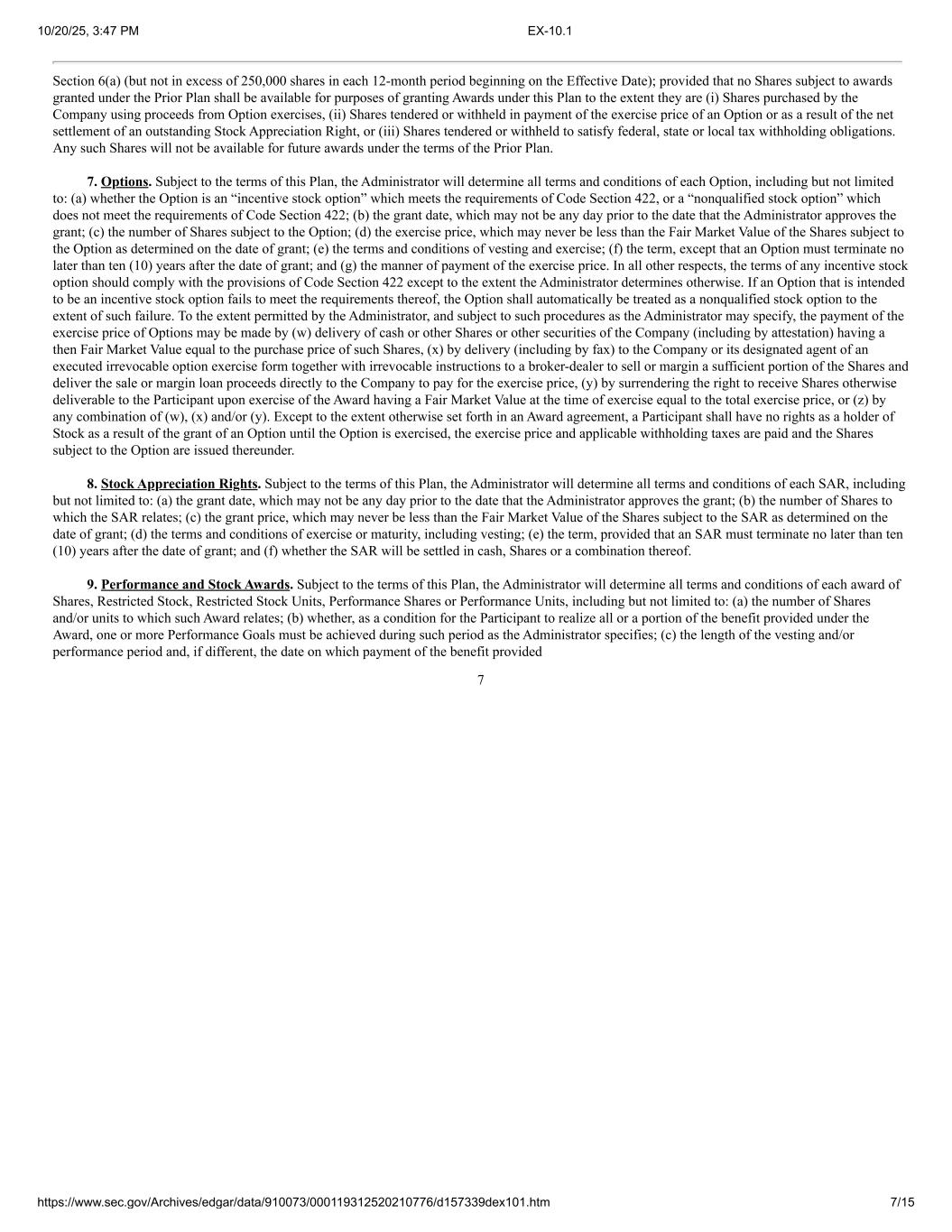 Section 6(a) (but not in excess of 250,000 shares in each 12-month period beginning on the Effective Date); provided that no Shares subject to awards granted under the Prior Plan shall be available for purposes of granting Awards under this Plan to the extent they are (i) Shares purchased by the Company using proceeds from Option exercises, (ii) Shares tendered or withheld in payment of the exercise price of an Option or as a result of the net settlement of an outstanding Stock Appreciation Right, or (iii) Shares tendered or withheld to satisfy federal, state or local tax withholding obligations. Any such Shares will not be available for future awards under the terms of the Prior Plan. 7. Options. Subject to the terms of this Plan, the Administrator will determine all terms and conditions of each Option, including but not limited to: (a) whether the Option is an “incentive stock option” which meets the requirements of Code Section 422, or a “nonqualified stock option” which does not meet the requirements of Code Section 422; (b) the grant date, which may not be any day prior to the date that the Administrator approves the grant; (c) the number of Shares subject to the Option; (d) the exercise price, which may never be less than the Fair Market Value of the Shares subject to the Option as determined on the date of grant; (e) the terms and conditions of vesting and exercise; (f) the term, except that an Option must terminate no later than ten (10) years after the date of grant; and (g) the manner of payment of the exercise price. In all other respects, the terms of any incentive stock option should comply with the provisions of Code Section 422 except to the extent the Administrator determines otherwise. If an Option that is intended to be an incentive stock option fails to meet the requirements thereof, the Option shall automatically be treated as a nonqualified stock option to the extent of such failure. To the extent permitted by the Administrator, and subject to such procedures as the Administrator may specify, the payment of the exercise price of Options may be made by (w) delivery of cash or other Shares or other securities of the Company (including by attestation) having a then Fair Market Value equal to the purchase price of such Shares, (x) by delivery (including by fax) to the Company or its designated agent of an executed irrevocable option exercise form together with irrevocable instructions to a broker-dealer to sell or margin a sufficient portion of the Shares and deliver the sale or margin loan proceeds directly to the Company to pay for the exercise price, (y) by surrendering the right to receive Shares otherwise deliverable to the Participant upon exercise of the Award having a Fair Market Value at the time of exercise equal to the total exercise price, or (z) by any combination of (w), (x) and/or (y). Except to the extent otherwise set forth in an Award agreement, a Participant shall have no rights as a holder of Stock as a result of the grant of an Option until the Option is exercised, the exercise price and applicable withholding taxes are paid and the Shares subject to the Option are issued thereunder. 8. Stock Appreciation Rights. Subject to the terms of this Plan, the Administrator will determine all terms and conditions of each SAR, including but not limited to: (a) the grant date, which may not be any day prior to the date that the Administrator approves the grant; (b) the number of Shares to which the SAR relates; (c) the grant price, which may never be less than the Fair Market Value of the Shares subject to the SAR as determined on the date of grant; (d) the terms and conditions of exercise or maturity, including vesting; (e) the term, provided that an SAR must terminate no later than ten (10) years after the date of grant; and (f) whether the SAR will be settled in cash, Shares or a combination thereof. 9. Performance and Stock Awards. Subject to the terms of this Plan, the Administrator will determine all terms and conditions of each award of Shares, Restricted Stock, Restricted Stock Units, Performance Shares or Performance Units, including but not limited to: (a) the number of Shares and/or units to which such Award relates; (b) whether, as a condition for the Participant to realize all or a portion of the benefit provided under the Award, one or more Performance Goals must be achieved during such period as the Administrator specifies; (c) the length of the vesting and/or performance period and, if different, the date on which payment of the benefit provided 7 10/20/25, 3:47 PM EX-10.1 https://www.sec.gov/Archives/edgar/data/910073/000119312520210776/d157339dex101.htm 7/15