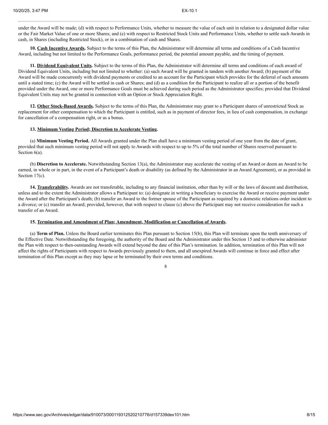 under the Award will be made; (d) with respect to Performance Units, whether to measure the value of each unit in relation to a designated dollar value or the Fair Market Value of one or more Shares; and (e) with respect to Restricted Stock Units and Performance Units, whether to settle such Awards in cash, in Shares (including Restricted Stock), or in a combination of cash and Shares. 10. Cash Incentive Awards. Subject to the terms of this Plan, the Administrator will determine all terms and conditions of a Cash Incentive Award, including but not limited to the Performance Goals, performance period, the potential amount payable, and the timing of payment. 11. Dividend Equivalent Units. Subject to the terms of this Plan, the Administrator will determine all terms and conditions of each award of Dividend Equivalent Units, including but not limited to whether: (a) such Award will be granted in tandem with another Award; (b) payment of the Award will be made concurrently with dividend payments or credited to an account for the Participant which provides for the deferral of such amounts until a stated time; (c) the Award will be settled in cash or Shares; and (d) as a condition for the Participant to realize all or a portion of the benefit provided under the Award, one or more Performance Goals must be achieved during such period as the Administrator specifies; provided that Dividend Equivalent Units may not be granted in connection with an Option or Stock Appreciation Right. 12. Other Stock-Based Awards. Subject to the terms of this Plan, the Administrator may grant to a Participant shares of unrestricted Stock as replacement for other compensation to which the Participant is entitled, such as in payment of director fees, in lieu of cash compensation, in exchange for cancellation of a compensation right, or as a bonus. 13. Minimum Vesting Period; Discretion to Accelerate Vesting. (a) Minimum Vesting Period. All Awards granted under the Plan shall have a minimum vesting period of one year from the date of grant, provided that such minimum vesting period will not apply to Awards with respect to up to 5% of the total number of Shares reserved pursuant to Section 6(a). (b) Discretion to Accelerate. Notwithstanding Section 13(a), the Administrator may accelerate the vesting of an Award or deem an Award to be earned, in whole or in part, in the event of a Participant’s death or disability (as defined by the Administrator in an Award Agreement), or as provided in Section 17(c). 14. Transferability. Awards are not transferable, including to any financial institution, other than by will or the laws of descent and distribution, unless and to the extent the Administrator allows a Participant to: (a) designate in writing a beneficiary to exercise the Award or receive payment under the Award after the Participant’s death; (b) transfer an Award to the former spouse of the Participant as required by a domestic relations order incident to a divorce; or (c) transfer an Award; provided, however, that with respect to clause (c) above the Participant may not receive consideration for such a transfer of an Award. 15. Termination and Amendment of Plan; Amendment, Modification or Cancellation of Awards. (a) Term of Plan. Unless the Board earlier terminates this Plan pursuant to Section 15(b), this Plan will terminate upon the tenth anniversary of the Effective Date. Notwithstanding the foregoing, the authority of the Board and the Administrator under this Section 15 and to otherwise administer the Plan with respect to then-outstanding Awards will extend beyond the date of this Plan’s termination. In addition, termination of this Plan will not affect the rights of Participants with respect to Awards previously granted to them, and all unexpired Awards will continue in force and effect after termination of this Plan except as they may lapse or be terminated by their own terms and conditions. 8 10/20/25, 3:47 PM EX-10.1 https://www.sec.gov/Archives/edgar/data/910073/000119312520210776/d157339dex101.htm 8/15