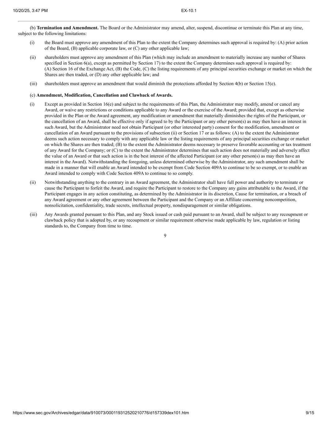 (b) Termination and Amendment. The Board or the Administrator may amend, alter, suspend, discontinue or terminate this Plan at any time, subject to the following limitations: (i) the Board must approve any amendment of this Plan to the extent the Company determines such approval is required by: (A) prior action of the Board, (B) applicable corporate law, or (C) any other applicable law; (ii) shareholders must approve any amendment of this Plan (which may include an amendment to materially increase any number of Shares specified in Section 6(a), except as permitted by Section 17) to the extent the Company determines such approval is required by: (A) Section 16 of the Exchange Act, (B) the Code, (C) the listing requirements of any principal securities exchange or market on which the Shares are then traded, or (D) any other applicable law; and (iii) shareholders must approve an amendment that would diminish the protections afforded by Section 4(b) or Section 15(e). (c) Amendment, Modification, Cancellation and Clawback of Awards. (i) Except as provided in Section 16(e) and subject to the requirements of this Plan, the Administrator may modify, amend or cancel any Award, or waive any restrictions or conditions applicable to any Award or the exercise of the Award; provided that, except as otherwise provided in the Plan or the Award agreement, any modification or amendment that materially diminishes the rights of the Participant, or the cancellation of an Award, shall be effective only if agreed to by the Participant or any other person(s) as may then have an interest in such Award, but the Administrator need not obtain Participant (or other interested party) consent for the modification, amendment or cancellation of an Award pursuant to the provisions of subsection (ii) or Section 17 or as follows: (A) to the extent the Administrator deems such action necessary to comply with any applicable law or the listing requirements of any principal securities exchange or market on which the Shares are then traded; (B) to the extent the Administrator deems necessary to preserve favorable accounting or tax treatment of any Award for the Company; or (C) to the extent the Administrator determines that such action does not materially and adversely affect the value of an Award or that such action is in the best interest of the affected Participant (or any other person(s) as may then have an interest in the Award). Notwithstanding the foregoing, unless determined otherwise by the Administrator, any such amendment shall be made in a manner that will enable an Award intended to be exempt from Code Section 409A to continue to be so exempt, or to enable an Award intended to comply with Code Section 409A to continue to so comply. (ii) Notwithstanding anything to the contrary in an Award agreement, the Administrator shall have full power and authority to terminate or cause the Participant to forfeit the Award, and require the Participant to restore to the Company any gains attributable to the Award, if the Participant engages in any action constituting, as determined by the Administrator in its discretion, Cause for termination, or a breach of any Award agreement or any other agreement between the Participant and the Company or an Affiliate concerning noncompetition, nonsolicitation, confidentiality, trade secrets, intellectual property, nondisparagement or similar obligations. (iii) Any Awards granted pursuant to this Plan, and any Stock issued or cash paid pursuant to an Award, shall be subject to any recoupment or clawback policy that is adopted by, or any recoupment or similar requirement otherwise made applicable by law, regulation or listing standards to, the Company from time to time. 9 10/20/25, 3:47 PM EX-10.1 https://www.sec.gov/Archives/edgar/data/910073/000119312520210776/d157339dex101.htm 9/15