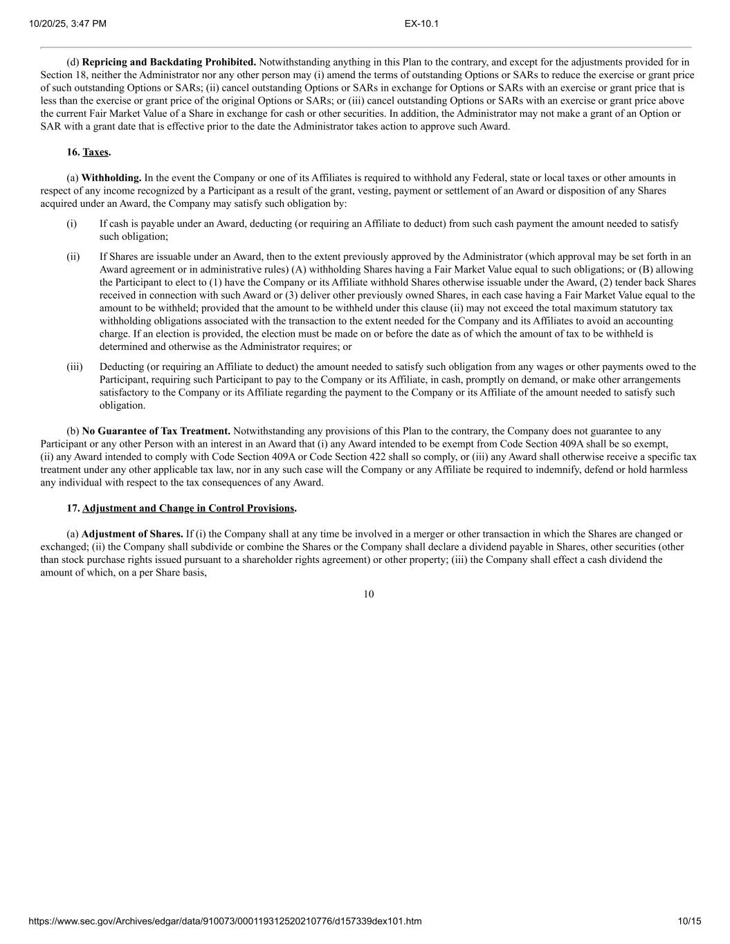 (d) Repricing and Backdating Prohibited. Notwithstanding anything in this Plan to the contrary, and except for the adjustments provided for in Section 18, neither the Administrator nor any other person may (i) amend the terms of outstanding Options or SARs to reduce the exercise or grant price of such outstanding Options or SARs; (ii) cancel outstanding Options or SARs in exchange for Options or SARs with an exercise or grant price that is less than the exercise or grant price of the original Options or SARs; or (iii) cancel outstanding Options or SARs with an exercise or grant price above the current Fair Market Value of a Share in exchange for cash or other securities. In addition, the Administrator may not make a grant of an Option or SAR with a grant date that is effective prior to the date the Administrator takes action to approve such Award. 16. Taxes. (a) Withholding. In the event the Company or one of its Affiliates is required to withhold any Federal, state or local taxes or other amounts in respect of any income recognized by a Participant as a result of the grant, vesting, payment or settlement of an Award or disposition of any Shares acquired under an Award, the Company may satisfy such obligation by: (i) If cash is payable under an Award, deducting (or requiring an Affiliate to deduct) from such cash payment the amount needed to satisfy such obligation; (ii) If Shares are issuable under an Award, then to the extent previously approved by the Administrator (which approval may be set forth in an Award agreement or in administrative rules) (A) withholding Shares having a Fair Market Value equal to such obligations; or (B) allowing the Participant to elect to (1) have the Company or its Affiliate withhold Shares otherwise issuable under the Award, (2) tender back Shares received in connection with such Award or (3) deliver other previously owned Shares, in each case having a Fair Market Value equal to the amount to be withheld; provided that the amount to be withheld under this clause (ii) may not exceed the total maximum statutory tax withholding obligations associated with the transaction to the extent needed for the Company and its Affiliates to avoid an accounting charge. If an election is provided, the election must be made on or before the date as of which the amount of tax to be withheld is determined and otherwise as the Administrator requires; or (iii) Deducting (or requiring an Affiliate to deduct) the amount needed to satisfy such obligation from any wages or other payments owed to the Participant, requiring such Participant to pay to the Company or its Affiliate, in cash, promptly on demand, or make other arrangements satisfactory to the Company or its Affiliate regarding the payment to the Company or its Affiliate of the amount needed to satisfy such obligation. (b) No Guarantee of Tax Treatment. Notwithstanding any provisions of this Plan to the contrary, the Company does not guarantee to any Participant or any other Person with an interest in an Award that (i) any Award intended to be exempt from Code Section 409A shall be so exempt, (ii) any Award intended to comply with Code Section 409A or Code Section 422 shall so comply, or (iii) any Award shall otherwise receive a specific tax treatment under any other applicable tax law, nor in any such case will the Company or any Affiliate be required to indemnify, defend or hold harmless any individual with respect to the tax consequences of any Award. 17. Adjustment and Change in Control Provisions. (a) Adjustment of Shares. If (i) the Company shall at any time be involved in a merger or other transaction in which the Shares are changed or exchanged; (ii) the Company shall subdivide or combine the Shares or the Company shall declare a dividend payable in Shares, other securities (other than stock purchase rights issued pursuant to a shareholder rights agreement) or other property; (iii) the Company shall effect a cash dividend the amount of which, on a per Share basis, 10 10/20/25, 3:47 PM EX-10.1 https://www.sec.gov/Archives/edgar/data/910073/000119312520210776/d157339dex101.htm 10/15