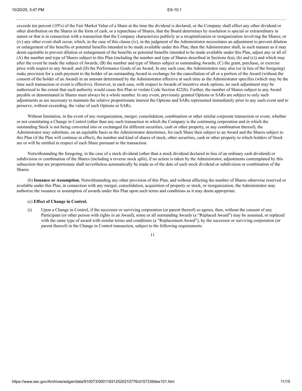 exceeds ten percent (10%) of the Fair Market Value of a Share at the time the dividend is declared, or the Company shall effect any other dividend or other distribution on the Shares in the form of cash, or a repurchase of Shares, that the Board determines by resolution is special or extraordinary in nature or that is in connection with a transaction that the Company characterizes publicly as a recapitalization or reorganization involving the Shares; or (iv) any other event shall occur, which, in the case of this clause (iv), in the judgment of the Administrator necessitates an adjustment to prevent dilution or enlargement of the benefits or potential benefits intended to be made available under this Plan, then the Administrator shall, in such manner as it may deem equitable to prevent dilution or enlargement of the benefits or potential benefits intended to be made available under this Plan, adjust any or all of: (A) the number and type of Shares subject to this Plan (including the number and type of Shares described in Sections 6(a), (b) and (c)) and which may after the event be made the subject of Awards; (B) the number and type of Shares subject to outstanding Awards; (C) the grant, purchase, or exercise price with respect to any Award; and (D) the Performance Goals of an Award. In any such case, the Administrator may also (or in lieu of the foregoing) make provision for a cash payment to the holder of an outstanding Award in exchange for the cancellation of all or a portion of the Award (without the consent of the holder of an Award) in an amount determined by the Administrator effective at such time as the Administrator specifies (which may be the time such transaction or event is effective). However, in each case, with respect to Awards of incentive stock options, no such adjustment may be authorized to the extent that such authority would cause this Plan to violate Code Section 422(b). Further, the number of Shares subject to any Award payable or denominated in Shares must always be a whole number. In any event, previously granted Options or SARs are subject to only such adjustments as are necessary to maintain the relative proportionate interest the Options and SARs represented immediately prior to any such event and to preserve, without exceeding, the value of such Options or SARs. Without limitation, in the event of any reorganization, merger, consolidation, combination or other similar corporate transaction or event, whether or not constituting a Change in Control (other than any such transaction in which the Company is the continuing corporation and in which the outstanding Stock is not being converted into or exchanged for different securities, cash or other property, or any combination thereof), the Administrator may substitute, on an equitable basis as the Administrator determines, for each Share then subject to an Award and the Shares subject to this Plan (if the Plan will continue in effect), the number and kind of shares of stock, other securities, cash or other property to which holders of Stock are or will be entitled in respect of each Share pursuant to the transaction. Notwithstanding the foregoing, in the case of a stock dividend (other than a stock dividend declared in lieu of an ordinary cash dividend) or subdivision or combination of the Shares (including a reverse stock split), if no action is taken by the Administrator, adjustments contemplated by this subsection that are proportionate shall nevertheless automatically be made as of the date of such stock dividend or subdivision or combination of the Shares. (b) Issuance or Assumption. Notwithstanding any other provision of this Plan, and without affecting the number of Shares otherwise reserved or available under this Plan, in connection with any merger, consolidation, acquisition of property or stock, or reorganization, the Administrator may authorize the issuance or assumption of awards under this Plan upon such terms and conditions as it may deem appropriate. (c) Effect of Change in Control. (i) Upon a Change in Control, if the successor or surviving corporation (or parent thereof) so agrees, then, without the consent of any Participant (or other person with rights in an Award), some or all outstanding Awards (a “Replaced Award”) may be assumed, or replaced with the same type of award with similar terms and conditions (a “Replacement Award”), by the successor or surviving corporation (or parent thereof) in the Change in Control transaction, subject to the following requirements: 11 10/20/25, 3:47 PM EX-10.1 https://www.sec.gov/Archives/edgar/data/910073/000119312520210776/d157339dex101.htm 11/15