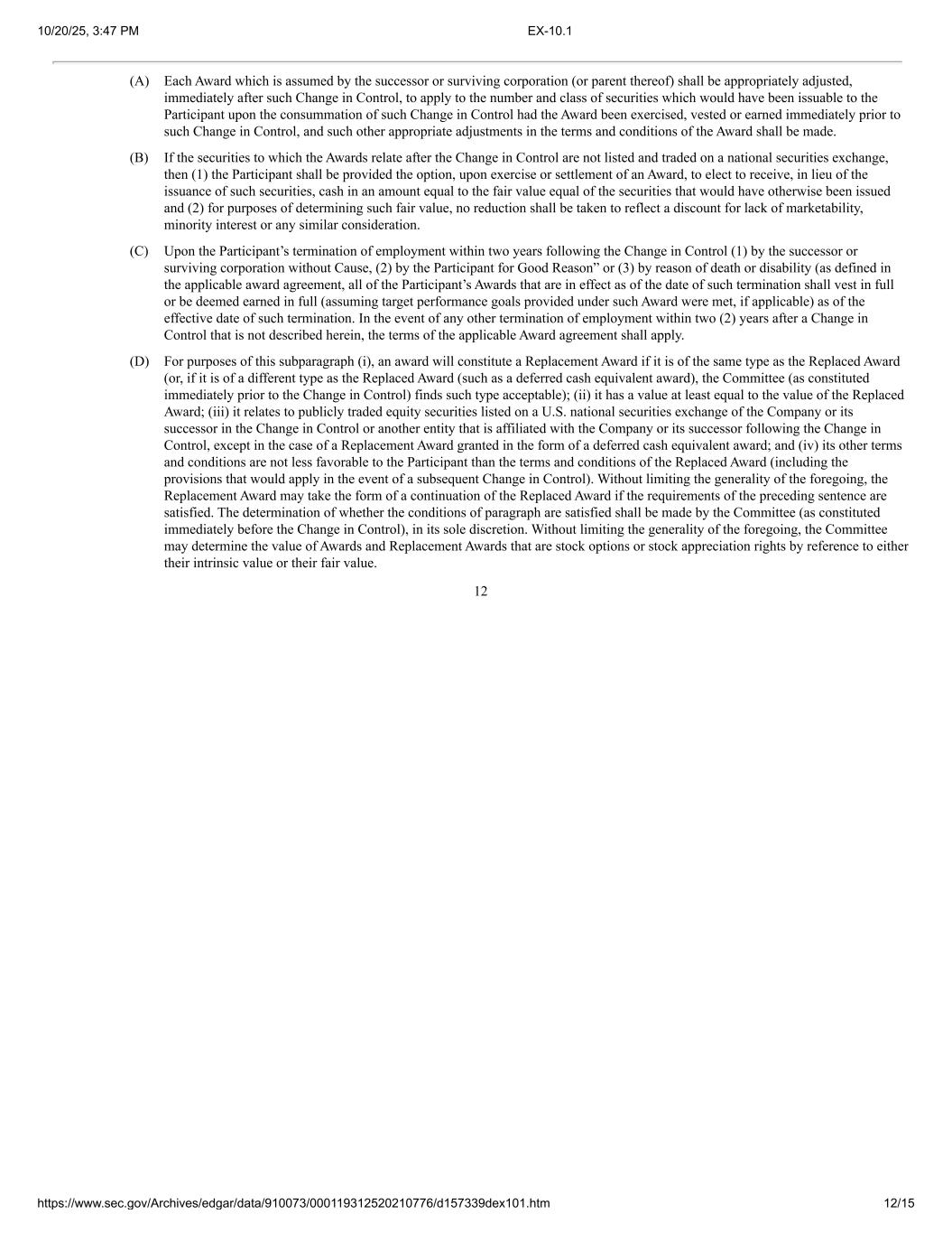 (A) Each Award which is assumed by the successor or surviving corporation (or parent thereof) shall be appropriately adjusted, immediately after such Change in Control, to apply to the number and class of securities which would have been issuable to the Participant upon the consummation of such Change in Control had the Award been exercised, vested or earned immediately prior to such Change in Control, and such other appropriate adjustments in the terms and conditions of the Award shall be made. (B) If the securities to which the Awards relate after the Change in Control are not listed and traded on a national securities exchange, then (1) the Participant shall be provided the option, upon exercise or settlement of an Award, to elect to receive, in lieu of the issuance of such securities, cash in an amount equal to the fair value equal of the securities that would have otherwise been issued and (2) for purposes of determining such fair value, no reduction shall be taken to reflect a discount for lack of marketability, minority interest or any similar consideration. (C) Upon the Participant’s termination of employment within two years following the Change in Control (1) by the successor or surviving corporation without Cause, (2) by the Participant for Good Reason” or (3) by reason of death or disability (as defined in the applicable award agreement, all of the Participant’s Awards that are in effect as of the date of such termination shall vest in full or be deemed earned in full (assuming target performance goals provided under such Award were met, if applicable) as of the effective date of such termination. In the event of any other termination of employment within two (2) years after a Change in Control that is not described herein, the terms of the applicable Award agreement shall apply. (D) For purposes of this subparagraph (i), an award will constitute a Replacement Award if it is of the same type as the Replaced Award (or, if it is of a different type as the Replaced Award (such as a deferred cash equivalent award), the Committee (as constituted immediately prior to the Change in Control) finds such type acceptable); (ii) it has a value at least equal to the value of the Replaced Award; (iii) it relates to publicly traded equity securities listed on a U.S. national securities exchange of the Company or its successor in the Change in Control or another entity that is affiliated with the Company or its successor following the Change in Control, except in the case of a Replacement Award granted in the form of a deferred cash equivalent award; and (iv) its other terms and conditions are not less favorable to the Participant than the terms and conditions of the Replaced Award (including the provisions that would apply in the event of a subsequent Change in Control). Without limiting the generality of the foregoing, the Replacement Award may take the form of a continuation of the Replaced Award if the requirements of the preceding sentence are satisfied. The determination of whether the conditions of paragraph are satisfied shall be made by the Committee (as constituted immediately before the Change in Control), in its sole discretion. Without limiting the generality of the foregoing, the Committee may determine the value of Awards and Replacement Awards that are stock options or stock appreciation rights by reference to either their intrinsic value or their fair value. 12 10/20/25, 3:47 PM EX-10.1 https://www.sec.gov/Archives/edgar/data/910073/000119312520210776/d157339dex101.htm 12/15