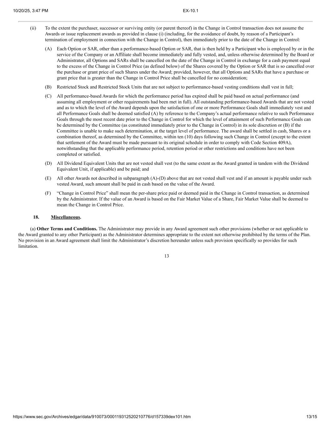 (ii) To the extent the purchaser, successor or surviving entity (or parent thereof) in the Change in Control transaction does not assume the Awards or issue replacement awards as provided in clause (i) (including, for the avoidance of doubt, by reason of a Participant’s termination of employment in connection with the Change in Control), then immediately prior to the date of the Change in Control: (A) Each Option or SAR, other than a performance-based Option or SAR, that is then held by a Participant who is employed by or in the service of the Company or an Affiliate shall become immediately and fully vested, and, unless otherwise determined by the Board or Administrator, all Options and SARs shall be cancelled on the date of the Change in Control in exchange for a cash payment equal to the excess of the Change in Control Price (as defined below) of the Shares covered by the Option or SAR that is so cancelled over the purchase or grant price of such Shares under the Award; provided, however, that all Options and SARs that have a purchase or grant price that is greater than the Change in Control Price shall be cancelled for no consideration; (B) Restricted Stock and Restricted Stock Units that are not subject to performance-based vesting conditions shall vest in full; (C) All performance-based Awards for which the performance period has expired shall be paid based on actual performance (and assuming all employment or other requirements had been met in full). All outstanding performance-based Awards that are not vested and as to which the level of the Award depends upon the satisfaction of one or more Performance Goals shall immediately vest and all Performance Goals shall be deemed satisfied (A) by reference to the Company’s actual performance relative to such Performance Goals through the most recent date prior to the Change in Control for which the level of attainment of such Performance Goals can be determined by the Committee (as constituted immediately prior to the Change in Control) in its sole discretion or (B) if the Committee is unable to make such determination, at the target level of performance. The award shall be settled in cash, Shares or a combination thereof, as determined by the Committee, within ten (10) days following such Change in Control (except to the extent that settlement of the Award must be made pursuant to its original schedule in order to comply with Code Section 409A), notwithstanding that the applicable performance period, retention period or other restrictions and conditions have not been completed or satisfied. (D) All Dividend Equivalent Units that are not vested shall vest (to the same extent as the Award granted in tandem with the Dividend Equivalent Unit, if applicable) and be paid; and (E) All other Awards not described in subparagraph (A)-(D) above that are not vested shall vest and if an amount is payable under such vested Award, such amount shall be paid in cash based on the value of the Award. (F) “Change in Control Price” shall mean the per-share price paid or deemed paid in the Change in Control transaction, as determined by the Administrator. If the value of an Award is based on the Fair Market Value of a Share, Fair Market Value shall be deemed to mean the Change in Control Price. 18. Miscellaneous. (a) Other Terms and Conditions. The Administrator may provide in any Award agreement such other provisions (whether or not applicable to the Award granted to any other Participant) as the Administrator determines appropriate to the extent not otherwise prohibited by the terms of the Plan. No provision in an Award agreement shall limit the Administrator’s discretion hereunder unless such provision specifically so provides for such limitation. 13 10/20/25, 3:47 PM EX-10.1 https://www.sec.gov/Archives/edgar/data/910073/000119312520210776/d157339dex101.htm 13/15