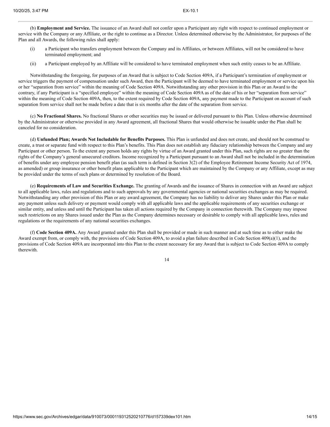 (b) Employment and Service. The issuance of an Award shall not confer upon a Participant any right with respect to continued employment or service with the Company or any Affiliate, or the right to continue as a Director. Unless determined otherwise by the Administrator, for purposes of the Plan and all Awards, the following rules shall apply: (i) a Participant who transfers employment between the Company and its Affiliates, or between Affiliates, will not be considered to have terminated employment; and (ii) a Participant employed by an Affiliate will be considered to have terminated employment when such entity ceases to be an Affiliate. Notwithstanding the foregoing, for purposes of an Award that is subject to Code Section 409A, if a Participant’s termination of employment or service triggers the payment of compensation under such Award, then the Participant will be deemed to have terminated employment or service upon his or her “separation from service” within the meaning of Code Section 409A. Notwithstanding any other provision in this Plan or an Award to the contrary, if any Participant is a “specified employee” within the meaning of Code Section 409A as of the date of his or her “separation from service” within the meaning of Code Section 409A, then, to the extent required by Code Section 409A, any payment made to the Participant on account of such separation from service shall not be made before a date that is six months after the date of the separation from service. (c) No Fractional Shares. No fractional Shares or other securities may be issued or delivered pursuant to this Plan. Unless otherwise determined by the Administrator or otherwise provided in any Award agreement, all fractional Shares that would otherwise be issuable under the Plan shall be canceled for no consideration. (d) Unfunded Plan; Awards Not Includable for Benefits Purposes. This Plan is unfunded and does not create, and should not be construed to create, a trust or separate fund with respect to this Plan’s benefits. This Plan does not establish any fiduciary relationship between the Company and any Participant or other person. To the extent any person holds any rights by virtue of an Award granted under this Plan, such rights are no greater than the rights of the Company’s general unsecured creditors. Income recognized by a Participant pursuant to an Award shall not be included in the determination of benefits under any employee pension benefit plan (as such term is defined in Section 3(2) of the Employee Retirement Income Security Act of 1974, as amended) or group insurance or other benefit plans applicable to the Participant which are maintained by the Company or any Affiliate, except as may be provided under the terms of such plans or determined by resolution of the Board. (e) Requirements of Law and Securities Exchange. The granting of Awards and the issuance of Shares in connection with an Award are subject to all applicable laws, rules and regulations and to such approvals by any governmental agencies or national securities exchanges as may be required. Notwithstanding any other provision of this Plan or any award agreement, the Company has no liability to deliver any Shares under this Plan or make any payment unless such delivery or payment would comply with all applicable laws and the applicable requirements of any securities exchange or similar entity, and unless and until the Participant has taken all actions required by the Company in connection therewith. The Company may impose such restrictions on any Shares issued under the Plan as the Company determines necessary or desirable to comply with all applicable laws, rules and regulations or the requirements of any national securities exchanges. (f) Code Section 409A. Any Award granted under this Plan shall be provided or made in such manner and at such time as to either make the Award exempt from, or comply with, the provisions of Code Section 409A, to avoid a plan failure described in Code Section 409(a)(1), and the provisions of Code Section 409A are incorporated into this Plan to the extent necessary for any Award that is subject to Code Section 409A to comply therewith. 14 10/20/25, 3:47 PM EX-10.1 https://www.sec.gov/Archives/edgar/data/910073/000119312520210776/d157339dex101.htm 14/15