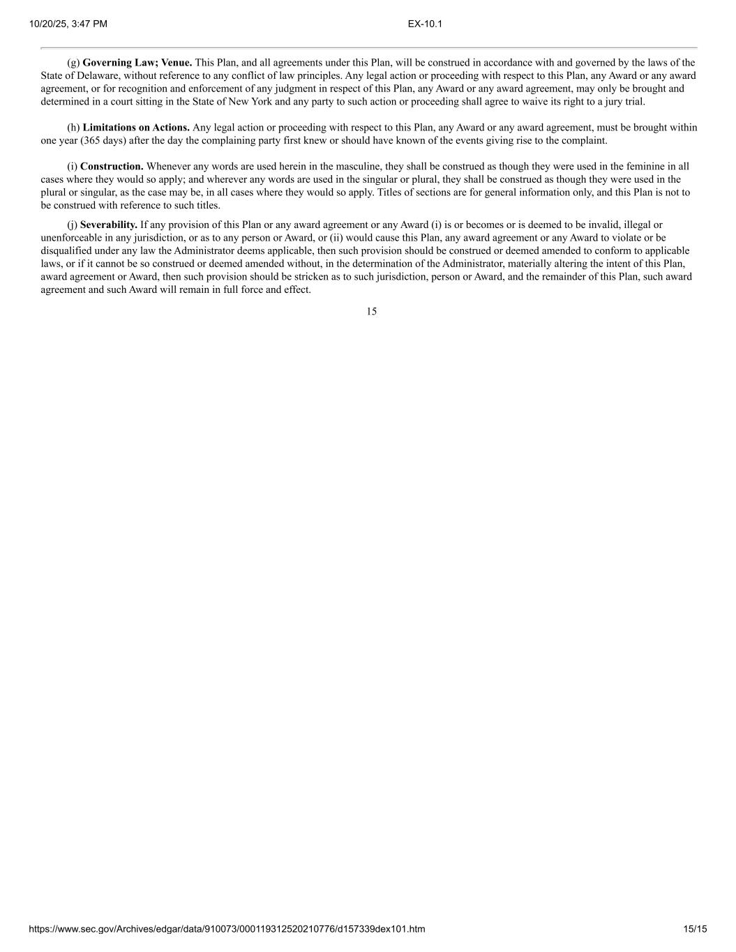 (g) Governing Law; Venue. This Plan, and all agreements under this Plan, will be construed in accordance with and governed by the laws of the State of Delaware, without reference to any conflict of law principles. Any legal action or proceeding with respect to this Plan, any Award or any award agreement, or for recognition and enforcement of any judgment in respect of this Plan, any Award or any award agreement, may only be brought and determined in a court sitting in the State of New York and any party to such action or proceeding shall agree to waive its right to a jury trial. (h) Limitations on Actions. Any legal action or proceeding with respect to this Plan, any Award or any award agreement, must be brought within one year (365 days) after the day the complaining party first knew or should have known of the events giving rise to the complaint. (i) Construction. Whenever any words are used herein in the masculine, they shall be construed as though they were used in the feminine in all cases where they would so apply; and wherever any words are used in the singular or plural, they shall be construed as though they were used in the plural or singular, as the case may be, in all cases where they would so apply. Titles of sections are for general information only, and this Plan is not to be construed with reference to such titles. (j) Severability. If any provision of this Plan or any award agreement or any Award (i) is or becomes or is deemed to be invalid, illegal or unenforceable in any jurisdiction, or as to any person or Award, or (ii) would cause this Plan, any award agreement or any Award to violate or be disqualified under any law the Administrator deems applicable, then such provision should be construed or deemed amended to conform to applicable laws, or if it cannot be so construed or deemed amended without, in the determination of the Administrator, materially altering the intent of this Plan, award agreement or Award, then such provision should be stricken as to such jurisdiction, person or Award, and the remainder of this Plan, such award agreement and such Award will remain in full force and effect. 15 10/20/25, 3:47 PM EX-10.1 https://www.sec.gov/Archives/edgar/data/910073/000119312520210776/d157339dex101.htm 15/15