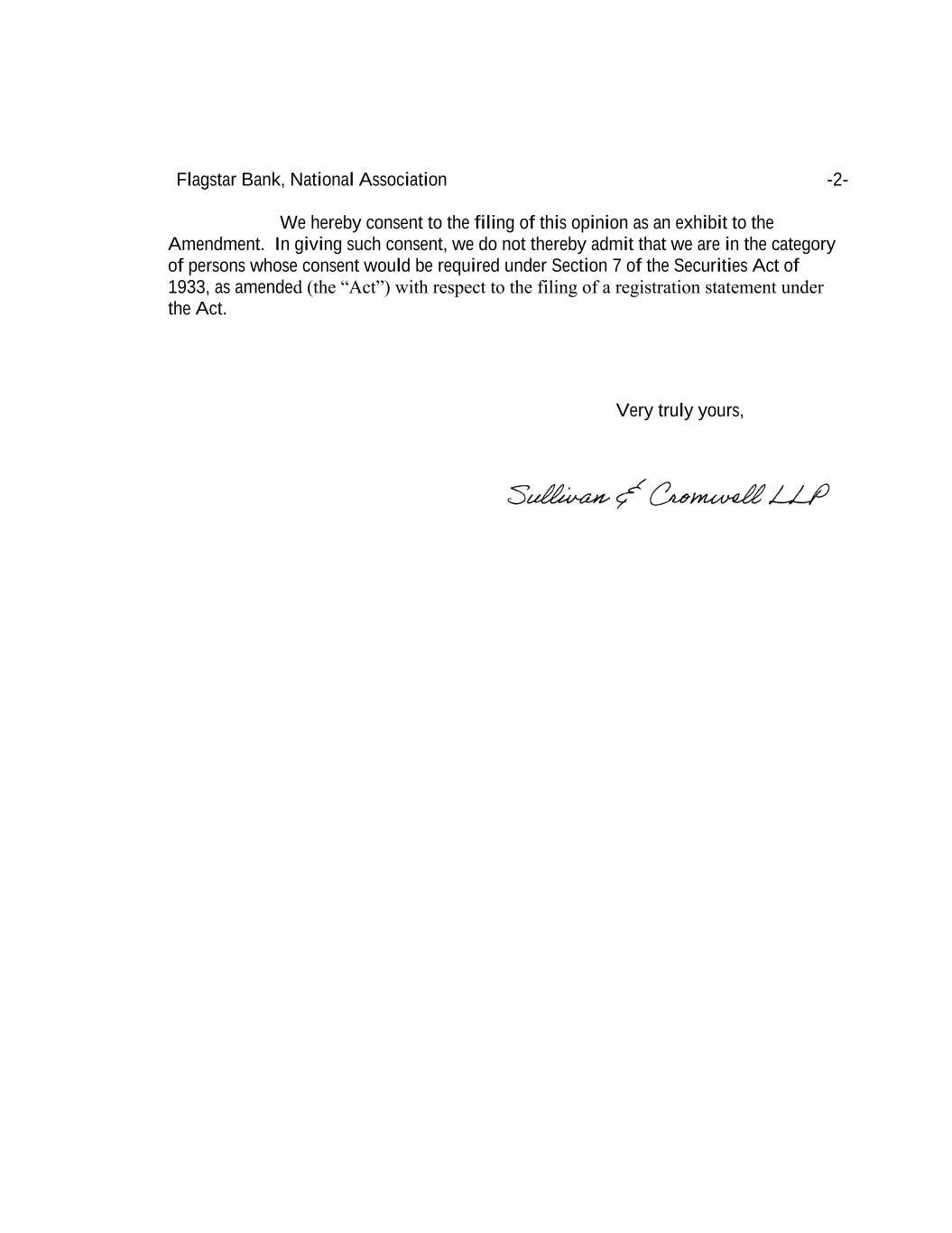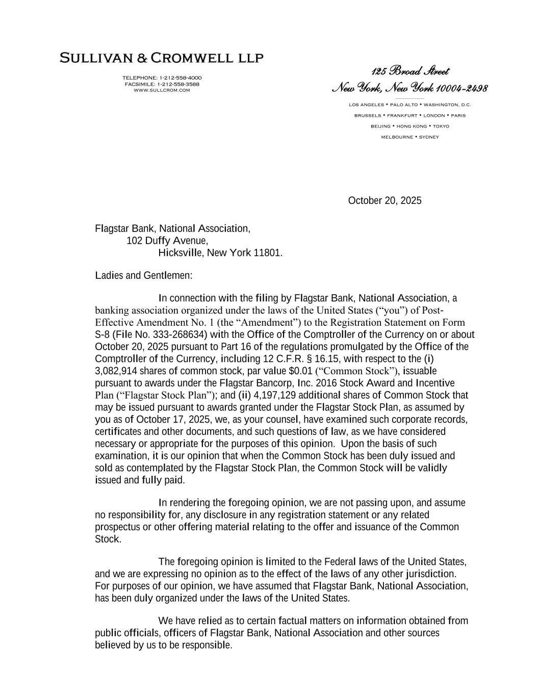 TELEPHONE: 1-212-558-4000 FACSIMILE: 1-212-558-3588 WWW.SULLCROM.COM 125 Broad Street New York, New York 10004-2498 ______________________ LOS ANGELES • PALO ALTO • WASHINGTON, D.C. BRUSSELS • FRANKFURT • LONDON • PARIS BEIJING • HONG KONG • TOKYO MELBOURNE • SYDNEY October 20, 2025 Flagstar Bank, National Association, 102 Duffy Avenue, Hicksville, New York 11801. Ladies and Gentlemen: In connection with the filing by Flagstar Bank, National Association, a banking association organized under the laws of the United States (“you”) of Post- Effective Amendment No. 1 (the “Amendment”) to the Registration Statement on Form S-8 (File No. 333-268634) with the Office of the Comptroller of the Currency on or about October 20, 2025 pursuant to Part 16 of the regulations promulgated by the Office of the Comptroller of the Currency, including 12 C.F.R. § 16.15, with respect to the (i) 3,082,914 shares of common stock, par value $0.01 (“Common Stock”), issuable pursuant to awards under the Flagstar Bancorp, Inc. 2016 Stock Award and Incentive Plan (“Flagstar Stock Plan”); and (ii) 4,197,129 additional shares of Common Stock that may be issued pursuant to awards granted under the Flagstar Stock Plan, as assumed by you as of October 17, 2025, we, as your counsel, have examined such corporate records, certificates and other documents, and such questions of law, as we have considered necessary or appropriate for the purposes of this opinion. Upon the basis of such examination, it is our opinion that when the Common Stock has been duly issued and sold as contemplated by the Flagstar Stock Plan, the Common Stock will be validly issued and fully paid. In rendering the foregoing opinion, we are not passing upon, and assume no responsibility for, any disclosure in any registration statement or any related prospectus or other offering material relating to the offer and issuance of the Common Stock. The foregoing opinion is limited to the Federal laws of the United States, and we are expressing no opinion as to the effect of the laws of any other jurisdiction. For purposes of our opinion, we have assumed that Flagstar Bank, National Association, has been duly organized under the laws of the United States. We have relied as to certain factual matters on information obtained from public officials, officers of Flagstar Bank, National Association and other sources believed by us to be responsible.