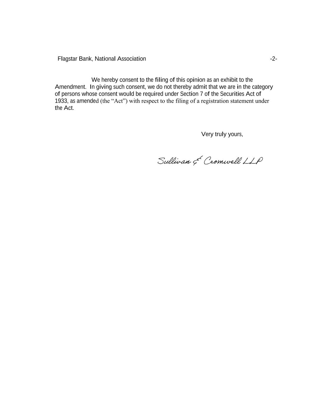 TELEPHONE: 1-212-558-4000 FACSIMILE: 1-212-558-3588 WWW.SULLCROM.COM 125 Broad Street New York, New York 10004-2498 ______________________ LOS ANGELES • PALO ALTO • WASHINGTON, D.C. BRUSSELS • FRANKFURT • LONDON • PARIS BEIJING • HONG KONG • TOKYO MELBOURNE • SYDNEY October 19, 2025 Flagstar Bank, National Association, 102 Duffy Avenue, Hicksville, New York 11801. Ladies and Gentlemen: In connection with the filing by Flagstar Bank, National Association, a banking association organized under the laws of the United States (“you”) of Post- Effective Amendment No. 1 (the “Amendment”) to the Registration Statement on Form S-8 (File No. 333-280396) with the Office of the Comptroller of the Currency on or about October 20, 2025 pursuant to Part 16 of the regulations promulgated by the Office of the Comptroller of the Currency, including 12 C.F.R. § 16.15, with respect to the 53,300,000 shares of common stock, par value $0.01 (“Common Stock”), issuable pursuant to the New York Community Bancorp, Inc. 2020 Omnibus Incentive Plan (the “Incentive Plan”), as assumed by you as of October 17, 2025, we, as your counsel, have examined such corporate records, certificates and other documents, and such questions of law, as we have considered necessary or appropriate for the purposes of this opinion. Upon the basis of such examination, it is our opinion that when the Common Stock has been duly issued and sold as contemplated by the Incentive Plan, the Common Stock will be validly issued and fully paid. In rendering the foregoing opinion, we are not passing upon, and assume no responsibility for, any disclosure in any registration statement or any related prospectus or other offering material relating to the offer and issuance of the Common Stock. The foregoing opinion is limited to the Federal laws of the United States, and we are expressing no opinion as to the effect of the laws of any other jurisdiction. For purposes of our opinion, we have assumed that Flagstar Bank, National Association, has been duly organized under the laws of the United States. We have relied as to certain factual matters on information obtained from public officials, officers of Flagstar Bank, National Association and other sources believed by us to be responsible.