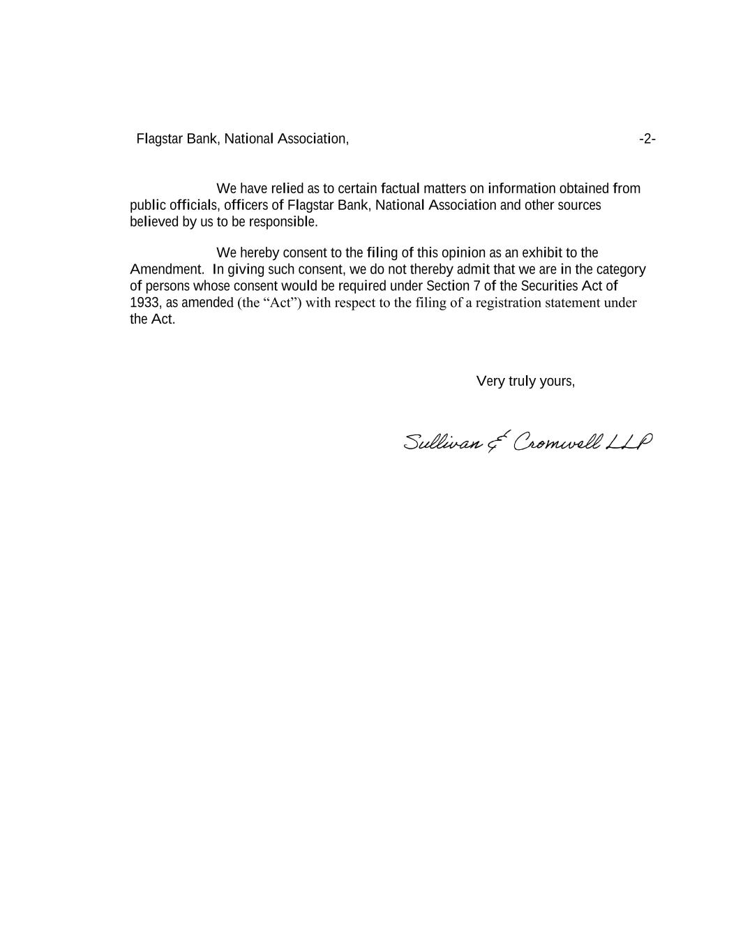 TELEPHONE: 1-212-558-4000 FACSIMILE: 1-212-558-3588 WWW.SULLCROM.COM 125 Broad Street New York, New York 10004-2498 ______________________ LOS ANGELES • PALO ALTO • WASHINGTON, D.C. BRUSSELS • FRANKFURT • LONDON • PARIS BEIJING • HONG KONG • TOKYO MELBOURNE • SYDNEY October 20, 2025 Flagstar Bank, National Association, 102 Duffy Avenue, Hicksville, New York 11801. Ladies and Gentlemen: In connection with the filing by Flagstar Bank, National Association, a banking association organized under the laws of the United States (“you”) of Post- Effective Amendment No. 1 (the “Amendment”) to the Registration Statement on Form S-8 (File No. 333-287353) with the Office of the Comptroller of the Currency on or about October 20, 2025 pursuant to Part 16 of the regulations promulgated by the Office of the Comptroller of the Currency, including 12 C.F.R. § 16.15, with respect to the 9,000,000 shares of common stock, par value $0.01 (“Common Stock”), which may be issuable pursuant to one-time stock options granted as employment inducement awards (collectively, the “Executive Stock Option Grants”), we, as your counsel, have examined such corporate records, certificates and other documents, and such questions of law, as we have considered necessary or appropriate for the purposes of this opinion. Upon the basis of such examination, it is our opinion that when the Common Stock has been duly issued and sold as contemplated by the terms of the Executive Stock Option Grants, the Common Stock will be validly issued and fully paid. In rendering the foregoing opinion, we are not passing upon, and assume no responsibility for, any disclosure in any registration statement or any related prospectus or other offering material relating to the offer and issuance of the Common Stock. The foregoing opinion is limited to the Federal laws of the United States, and we are expressing no opinion as to the effect of the laws of any other jurisdiction. For purposes of our opinion, we have assumed that Flagstar Bank, National Association, has been duly organized under the laws of the United States.
