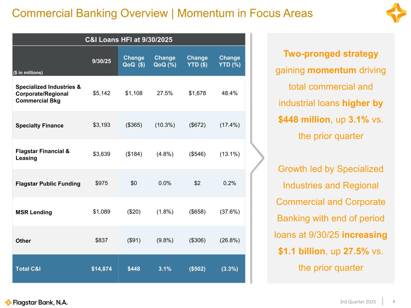 43rd Quarter 2025 Commercial Banking Overview | Momentum in Focus Areas Two-pronged strategy gaining momentum driving total commercial and industrial loans higher by $448 million, up 3.1% vs. the prior quarter Growth led by Specialized Industries and Regional Commercial and Corporate Banking with end of period loans at 9/30/25 increasing $1.1 billion, up 27.5% vs. the prior quarter C&I Loans HFI at 9/30/2025 ($ in millions) 9/30/25 Change QoQ ($) Change QoQ (%) Change YTD ($) Change YTD (%) Specialized Industries & Corporate/Regional Commercial Bkg $5,142 $1,108 27.5% $1,678 48.4% Specialty Finance $3,193 ($365) (10.3%) ($672) (17.4%) Flagstar Financial & Leasing $3,639 ($184) (4.8%) ($546) (13.1%) Flagstar Public Funding $975 $0 0.0% $2 0.2% MSR Lending $1,089 ($20) (1.8%) ($658) (37.6%) Other $837 ($91) (9.8%) ($306) (26.8%) Total C&I $14,874 $448 3.1% ($502) (3.3%)