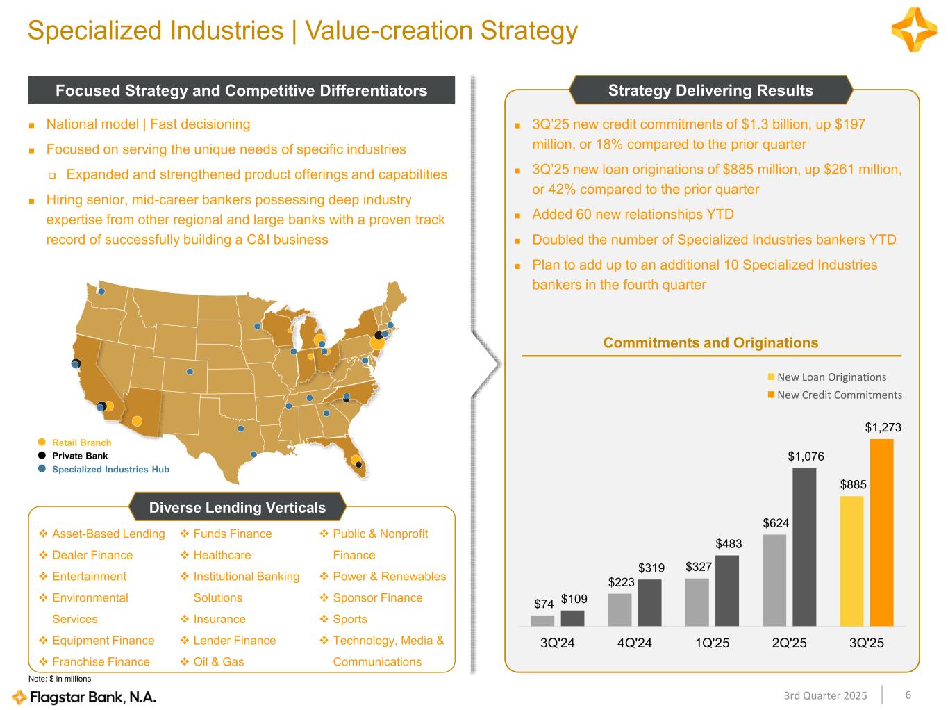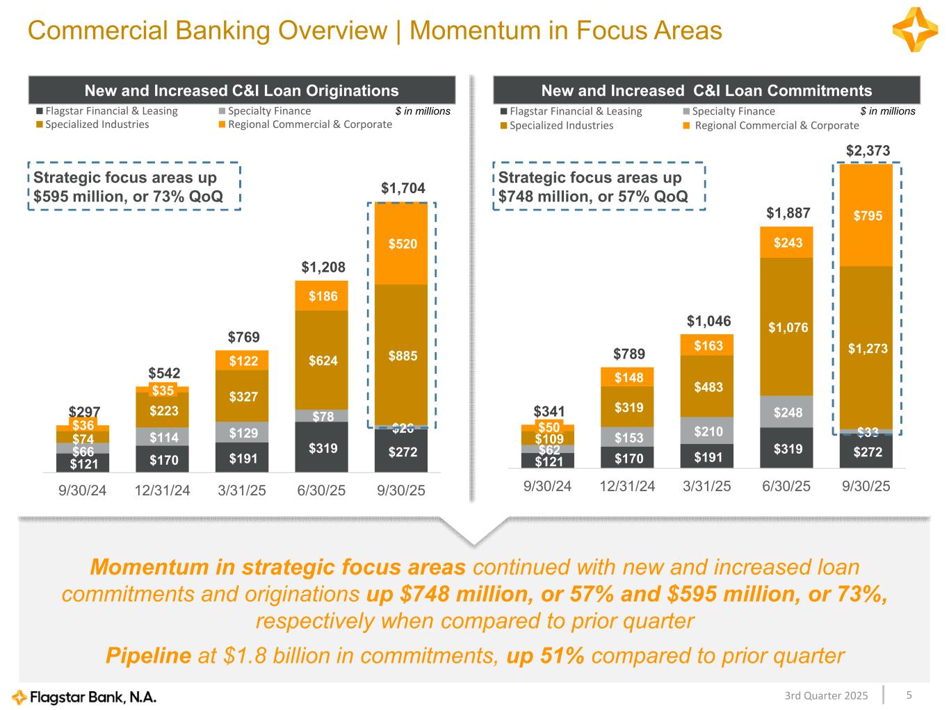53rd Quarter 2025 $121 $170 $191 $319 $272 $66 $114 $129 $78 $26 $74 $223 $327 $624 $885 $122 $186 $520 $297 $542 $769 $1,208 $1,704 9/30/24 12/31/24 3/31/25 6/30/25 9/30/25 Flagstar Financial & Leasing Specialty Finance Specialized Industries Regional Commercial & Corporate Commercial Banking Overview | Momentum in Focus Areas New and Increased C&I Loan Commitments $ in millions New and Increased C&I Loan Originations $ in millions $121 $170 $191 $319 $272 $62 $153 $210 $248 $33 $109 $319 $483 $1,076 $1,273 $148 $163 $243 $795 $341 $789 $1,046 $1,887 $2,373 9/30/24 12/31/24 3/31/25 6/30/25 9/30/25 Flagstar Financial & Leasing Specialty Finance Specialized Industries Regional Commercial & Corporate Strategic focus areas up $595 million, or 73% QoQ Strategic focus areas up $748 million, or 57% QoQ Momentum in strategic focus areas continued with new and increased loan commitments and originations up $748 million, or 57% and $595 million, or 73%, respectively when compared to prior quarter Pipeline at $1.8 billion in commitments, up 51% compared to prior quarter $50$36 $35
