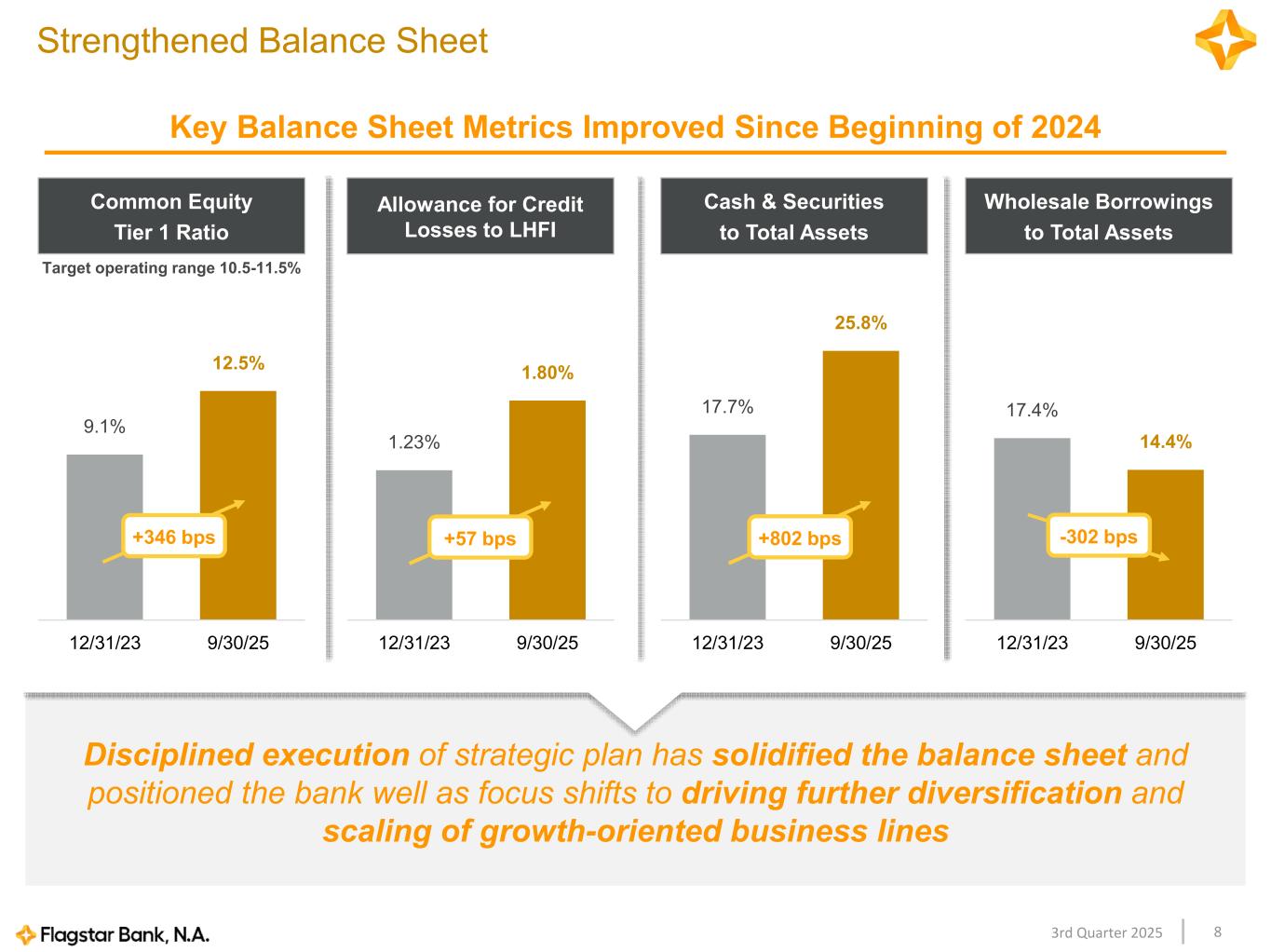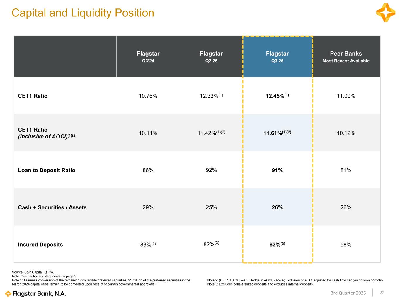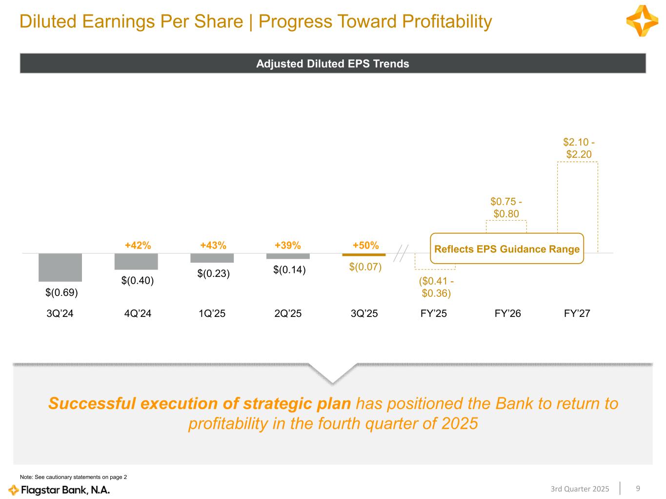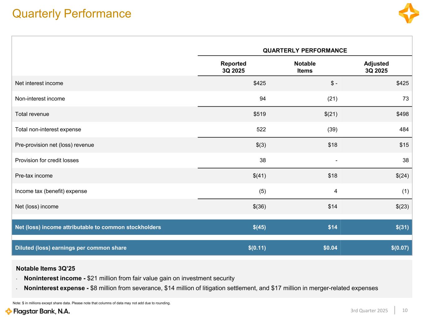 23rd Quarter 2025 Cautionary Statement Forward-Looking Information This earnings presentation and the associated conference call may include forward‐looking statements by us and our authorized officers pertaining to such matters as our goals, beliefs, intentions, and expectations regarding, among other things: (a) revenues, earnings, loan production, asset quality, liquidity position, capital levels, risk analysis, divestitures, acquisitions, and other material transactions, among other matters; (b) the future costs and benefits of the actions we may take; (c) our assessments of credit risk and probable losses on loans and associated allowances and reserves; (d) our assessments of interest rate and other market risks; (e) our ability to achieve profitability goals within projected timeframes and to execute on our strategic plan, including the sufficiency of our internal resources, procedures and systems; (f) our ability to attract, incentivize, and retain key personnel and the roles of key personnel; (g) our ability to achieve our financial and other strategic goals, including those related to the Reorganization, our merger with Flagstar Bancorp, Inc., which was completed in December 2022, our acquisition of substantial portions of the former Signature Bank through an FDIC-assisted transaction, which was completed in March 2023, and our ability to comply with the heightened regulatory standards with respect to governance and risk management which we are subject to as a national bank with assets of $50 billion or more; (h) the impact of the $1.05 billion capital raise we completed in March 2024; (i) our previously disclosed material weaknesses in internal control over financial reporting; (j) the conversion or exchange of shares of our preferred stock; (k) the payment of dividends on shares of our capital stock, including adjustments to the amount of dividends payable on shares of our preferred stock; (l) the availability of equity and dilution of existing equity holders associated with future equity awards and stock issuances; (m) the effects of the reverse stock split we effected in July 2024; and (n) the impact of the recent sale of our mortgage servicing operations, third party mortgage loan origination business, and mortgage warehouse business. Forward‐looking statements are typically identified by such words as “believe,” “expect,” “anticipate,” “intend,” “outlook,” “estimate,” “forecast,” “project,” “should,” "confident," and other similar words and expressions, and are subject to numerous assumptions, risks, and uncertainties, which change over time. Additionally, forward‐looking statements speak only as of the date they are made; we do not assume any duty, and do not undertake, to update our forward‐looking statements. Furthermore, because forward‐looking statements are subject to assumptions and uncertainties, actual results or future events could differ, possibly materially, from those anticipated in our statements, and our future performance could differ materially from our historical results. Our forward‐looking statements are subject to, among others, the following principal risks and uncertainties: general economic conditions and trends, either nationally or locally; conditions in the securities, credit and financial markets; changes in interest rates; changes in deposit flows, and in the demand for deposit, loan, and investment products and other financial services; changes in real estate values; changes in the quality or composition of our loan or investment portfolios, including associated allowances and reserves; changes in future allowance for credit losses, including changes required under relevant accounting and regulatory requirements; the ability to pay future dividends; changes in our capital management and balance sheet strategies and our ability to successfully implement such strategies; our ability to achieve the anticipated benefits of the Reorganization; recent turnover in our Board of Directors and our executive management team; changes in our strategic plan, including changes in our internal resources, procedures and systems, and our ability to successfully implement such plan; our ability to successfully remediate our previously disclosed material weaknesses in internal control over financial reporting; changes in competitive pressures among financial institutions or from non‐financial institutions; changes in legislation, regulations, and policies; the impacts of tariffs, sanctions and other trade policies of the United States and its global trading counterparts; the outcome of federal, state, and local elections and the resulting economic and other impact on the areas in which we conduct business; the impact of changing political conditions or federal government shutdowns; the imposition of restrictions on our operations by bank regulators; the outcome of pending or threatened litigation, or of investigations or any other matters before regulatory agencies, whether currently existing or commencing in the future; our ability to comply with heightened regulatory standards with respect to governance and risk management which we are subject to as a national bank with assets $50 billion or more; the restructuring of our mortgage business; our ability to recognize anticipated cost savings and enhanced efficiencies with respect to our balance sheet and expense reduction strategies; the impact of failures or disruptions in or breaches of our operational or security systems, data or infrastructure, or those of third parties, including as a result of cyberattacks or campaigns; the impact of natural disasters, extreme weather events, civil unrest, international military conflict, terrorism or other geopolitical events; and a variety of other matters which, by their nature, are subject to significant uncertainties and/or are beyond our control. Our forward-looking statements are also subject to the following principa