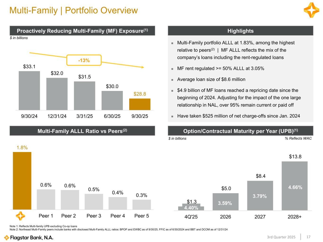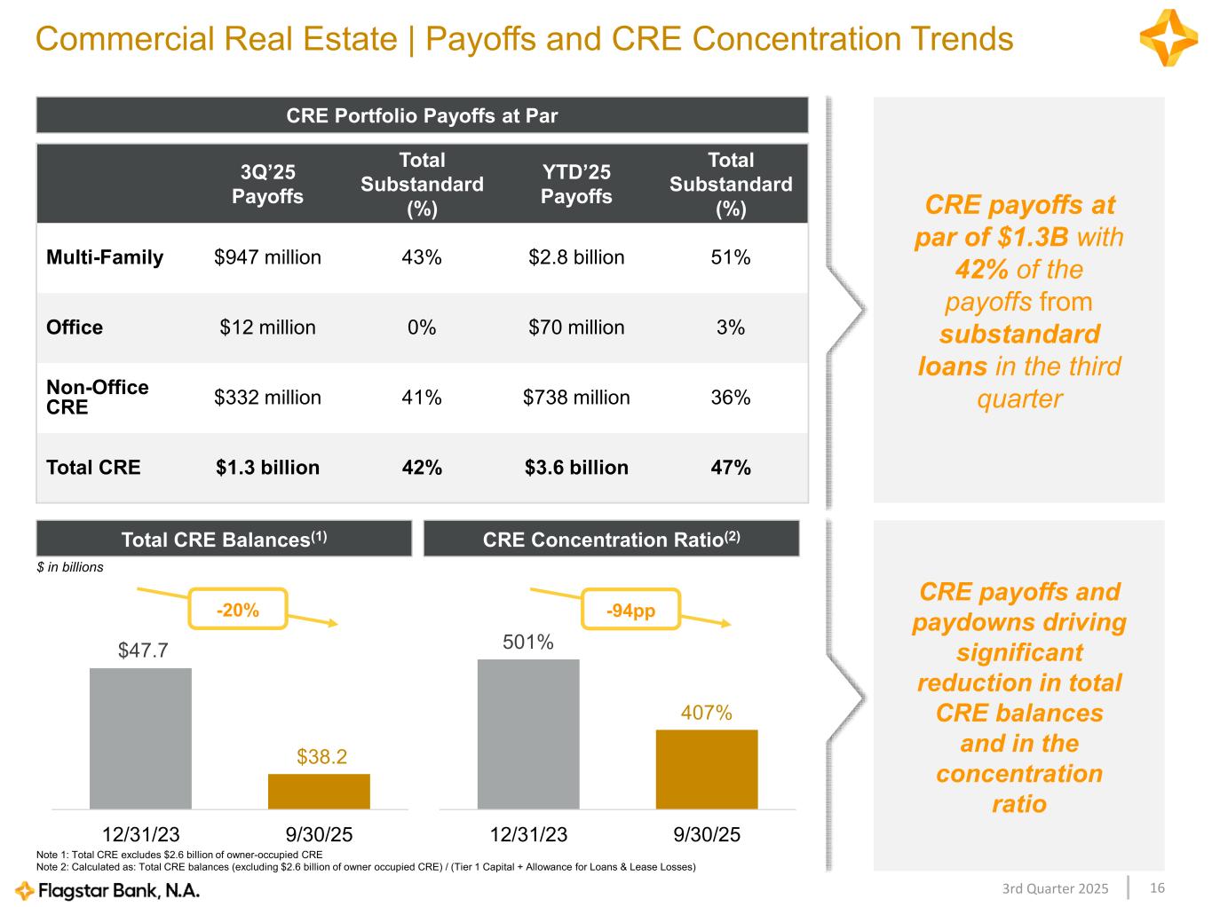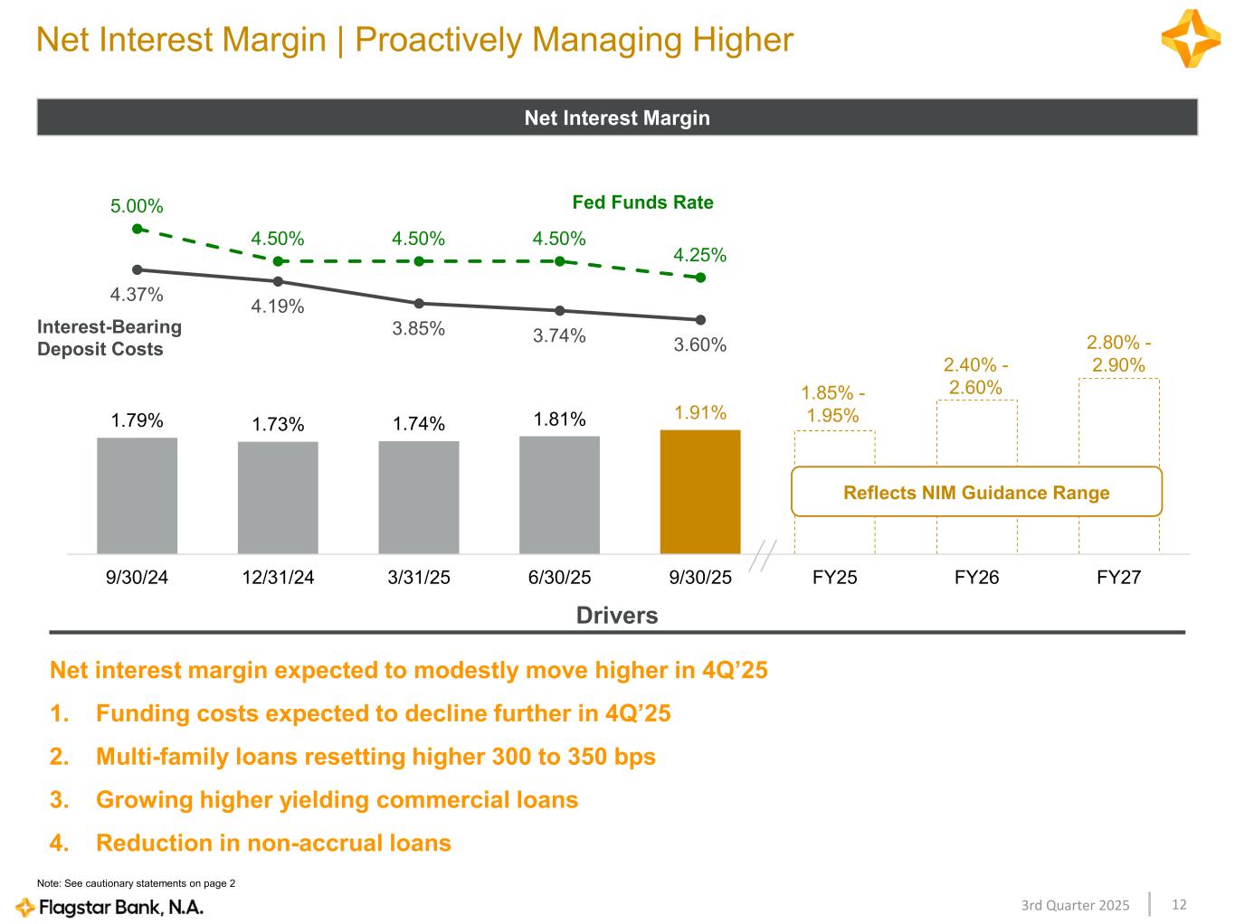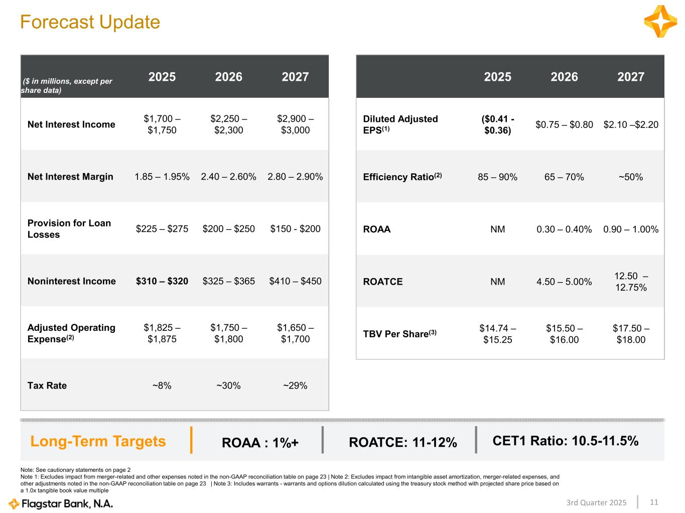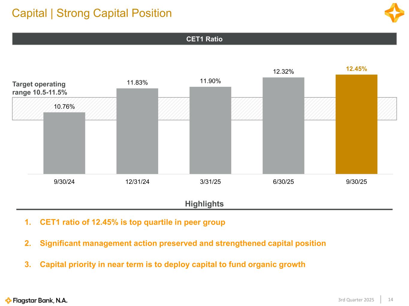 23rd Quarter 2025 Cautionary Statement Forward-Looking Information This earnings presentation and the associated conference call may include forward‐looking statements by us and our authorized officers pertaining to such matters as our goals, beliefs, intentions, and expectations regarding, among other things: (a) revenues, earnings, loan production, asset quality, liquidity position, capital levels, risk analysis, divestitures, acquisitions, and other material transactions, among other matters; (b) the future costs and benefits of the actions we may take; (c) our assessments of credit risk and probable losses on loans and associated allowances and reserves; (d) our assessments of interest rate and other market risks; (e) our ability to achieve profitability goals within projected timeframes and to execute on our strategic plan, including the sufficiency of our internal resources, procedures and systems; (f) our ability to attract, incentivize, and retain key personnel and the roles of key personnel; (g) our ability to achieve our financial and other strategic goals, including those related to the Reorganization, our merger with Flagstar Bancorp, Inc., which was completed in December 2022, our acquisition of substantial portions of the former Signature Bank through an FDIC-assisted transaction, which was completed in March 2023, and our ability to comply with the heightened regulatory standards with respect to governance and risk management which we are subject to as a national bank with assets of $50 billion or more; (h) the impact of the $1.05 billion capital raise we completed in March 2024; (i) our previously disclosed material weaknesses in internal control over financial reporting; (j) the conversion or exchange of shares of our preferred stock; (k) the payment of dividends on shares of our capital stock, including adjustments to the amount of dividends payable on shares of our preferred stock; (l) the availability of equity and dilution of existing equity holders associated with future equity awards and stock issuances; (m) the effects of the reverse stock split we effected in July 2024; and (n) the impact of the recent sale of our mortgage servicing operations, third party mortgage loan origination business, and mortgage warehouse business. Forward‐looking statements are typically identified by such words as “believe,” “expect,” “anticipate,” “intend,” “outlook,” “estimate,” “forecast,” “project,” “should,” "confident," and other similar words and expressions, and are subject to numerous assumptions, risks, and uncertainties, which change over time. Additionally, forward‐looking statements speak only as of the date they are made; we do not assume any duty, and do not undertake, to update our forward‐looking statements. Furthermore, because forward‐looking statements are subject to assumptions and uncertainties, actual results or future events could differ, possibly materially, from those anticipated in our statements, and our future performance could differ materially from our historical results. Our forward‐looking statements are subject to, among others, the following principal risks and uncertainties: general economic conditions and trends, either nationally or locally; conditions in the securities, credit and financial markets; changes in interest rates; changes in deposit flows, and in the demand for deposit, loan, and investment products and other financial services; changes in real estate values; changes in the quality or composition of our loan or investment portfolios, including associated allowances and reserves; changes in future allowance for credit losses, including changes required under relevant accounting and regulatory requirements; the ability to pay future dividends; changes in our capital management and balance sheet strategies and our ability to successfully implement such strategies; our ability to achieve the anticipated benefits of the Reorganization; recent turnover in our Board of Directors and our executive management team; changes in our strategic plan, including changes in our internal resources, procedures and systems, and our ability to successfully implement such plan; our ability to successfully remediate our previously disclosed material weaknesses in internal control over financial reporting; changes in competitive pressures among financial institutions or from non‐financial institutions; changes in legislation, regulations, and policies; the impacts of tariffs, sanctions and other trade policies of the United States and its global trading counterparts; the outcome of federal, state, and local elections and the resulting economic and other impact on the areas in which we conduct business; the impact of changing political conditions or federal government shutdowns; the imposition of restrictions on our operations by bank regulators; the outcome of pending or threatened litigation, or of investigations or any other matters before regulatory agencies, whether currently existing or commencing in the future; our ability to comply with heightened regulatory standards with respect to governance and risk management which we are subject to as a national bank with assets $50 billion or more; the restructuring of our mortgage business; our ability to recognize anticipated cost savings and enhanced efficiencies with respect to our balance sheet and expense reduction strategies; the impact of failures or disruptions in or breaches of our operational or security systems, data or infrastructure, or those of third parties, including as a result of cyberattacks or campaigns; the impact of natural disasters, extreme weather events, civil unrest, international military conflict, terrorism or other geopolitical events; and a variety of other matters which, by their nature, are subject to significant uncertainties and/or are beyond our control. Our forward-looking statements are also subject to the following principa