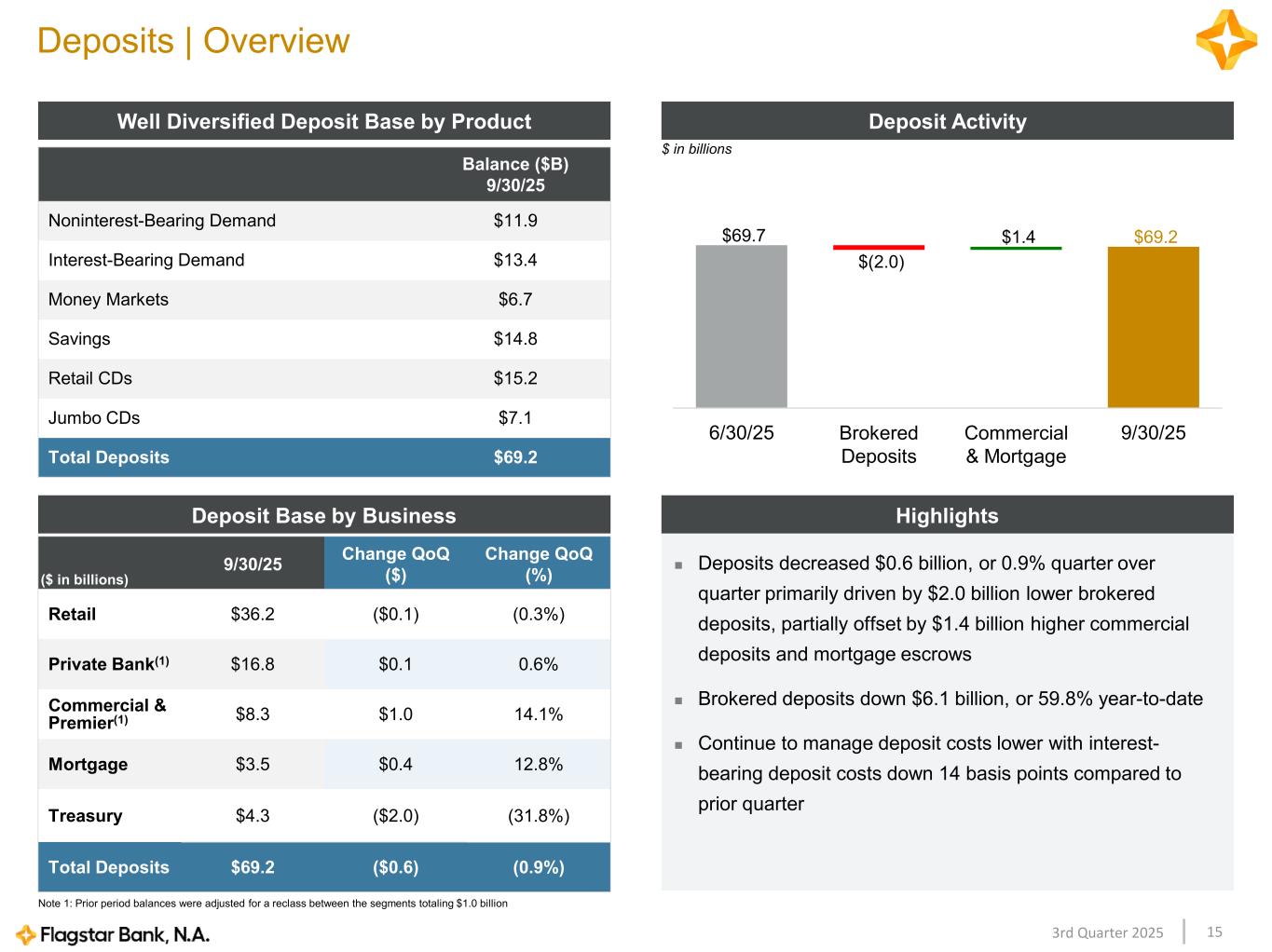 153rd Quarter 2025 Balance ($B) 9/30/25 Noninterest-Bearing Demand $11.9 Interest-Bearing Demand $13.4 Money Markets $6.7 Savings $14.8 Retail CDs $15.2 Jumbo CDs $7.1 Total Deposits $69.2 Deposits | Overview Deposit ActivityWell Diversified Deposit Base by Product Deposits decreased $0.6 billion, or 0.9% quarter over quarter primarily driven by $2.0 billion lower brokered deposits, partially offset by $1.4 billion higher commercial deposits and mortgage escrows Brokered deposits down $6.1 billion, or 59.8% year-to-date Continue to manage deposit costs lower with interest- bearing deposit costs down 14 basis points compared to prior quarter HighlightsDeposit Base by Business ($ in billions) 9/30/25 Change QoQ ($) Change QoQ (%) Retail $36.2 ($0.1) (0.3%) Private Bank(1) $16.8 $0.1 0.6% Commercial & Premier(1) $8.3 $1.0 14.1% Mortgage $3.5 $0.4 12.8% Treasury $4.3 ($2.0) (31.8%) Total Deposits $69.2 ($0.6) (0.9%) $ in billions $69.7 $(2.0) $1.4 $69.2 6/30/25 Brokered Deposits Commercial & Mortgage 9/30/25 Note 1: Prior period balances were adjusted for a reclass between the segments totaling $1.0 billion