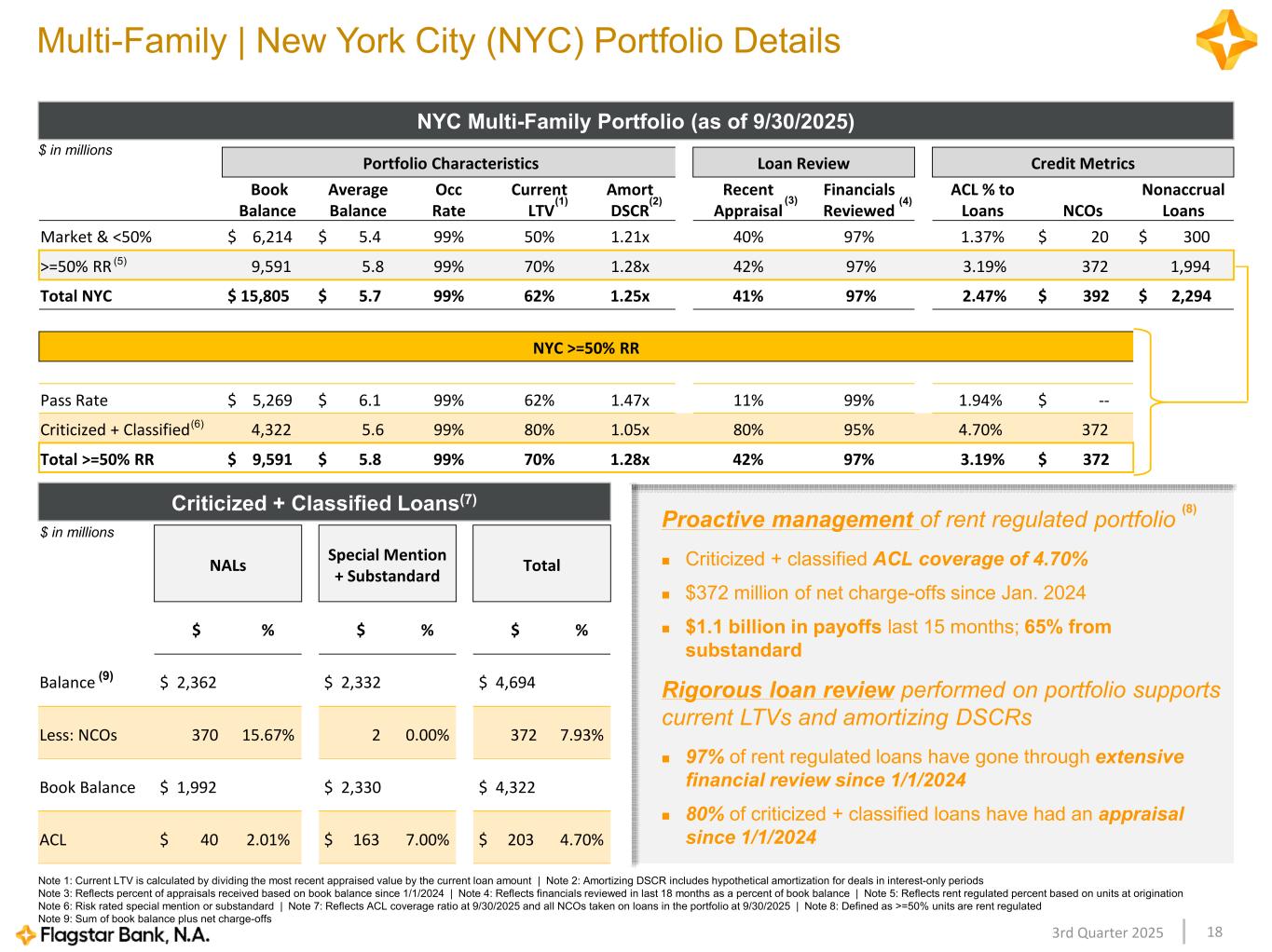 183rd Quarter 2025 Portfolio Characteristics Loan Review Credit Metrics Book Balance Average Balance Occ Rate Current LTV Amort DSCR Recent Appraisal Financials Reviewed ACL % to Loans NCOs Nonaccrual Loans Market & <50% $ 6,214 $ 5.4 99% 50% 1.21x 40% 97% 1.37% $ 20 $ 300 >=50% RR 9,591 5.8 99% 70% 1.28x 42% 97% 3.19% 372 1,994 Total NYC $ 15,805 $ 5.7 99% 62% 1.25x 41% 97% 2.47% $ 392 $ 2,294 NYC >=50% RR Pass Rate $ 5,269 $ 6.1 99% 62% 1.47x 11% 99% 1.94% $ -- Criticized + Classified 4,322 5.6 99% 80% 1.05x 80% 95% 4.70% 372 Total >=50% RR $ 9,591 $ 5.8 99% 70% 1.28x 42% 97% 3.19% $ 372 Multi-Family | New York City (NYC) Portfolio Details NYC Multi-Family Portfolio (as of 9/30/2025) $ in millions (5) (1) (2) (3) (4) Proactive management of rent regulated portfolio Criticized + classified ACL coverage of 4.70% $372 million of net charge-offs since Jan. 2024 $1.1 billion in payoffs last 15 months; 65% from substandard Rigorous loan review performed on portfolio supports current LTVs and amortizing DSCRs 97% of rent regulated loans have gone through extensive financial review since 1/1/2024 80% of criticized + classified loans have had an appraisal since 1/1/2024 Criticized + Classified Loans(7) $ in millions (6) Note 1: Current LTV is calculated by dividing the most recent appraised value by the current loan amount | Note 2: Amortizing DSCR includes hypothetical amortization for deals in interest-only periods Note 3: Reflects percent of appraisals received based on book balance since 1/1/2024 | Note 4: Reflects financials reviewed in last 18 months as a percent of book balance | Note 5: Reflects rent regulated percent based on units at origination Note 6: Risk rated special mention or substandard | Note 7: Reflects ACL coverage ratio at 9/30/2025 and all NCOs taken on loans in the portfolio at 9/30/2025 | Note 8: Defined as >=50% units are rent regulated Note 9: Sum of book balance plus net charge-offs (8) NALs Special Mention + Substandard Total $ % $ % $ % Balance $ 2,362 $ 2,332 $ 4,694 Less: NCOs 370 15.67% 2 0.00% 372 7.93% Book Balance $ 1,992 $ 2,330 $ 4,322 ACL $ 40 2.01% $ 163 7.00% $ 203 4.70% (9)