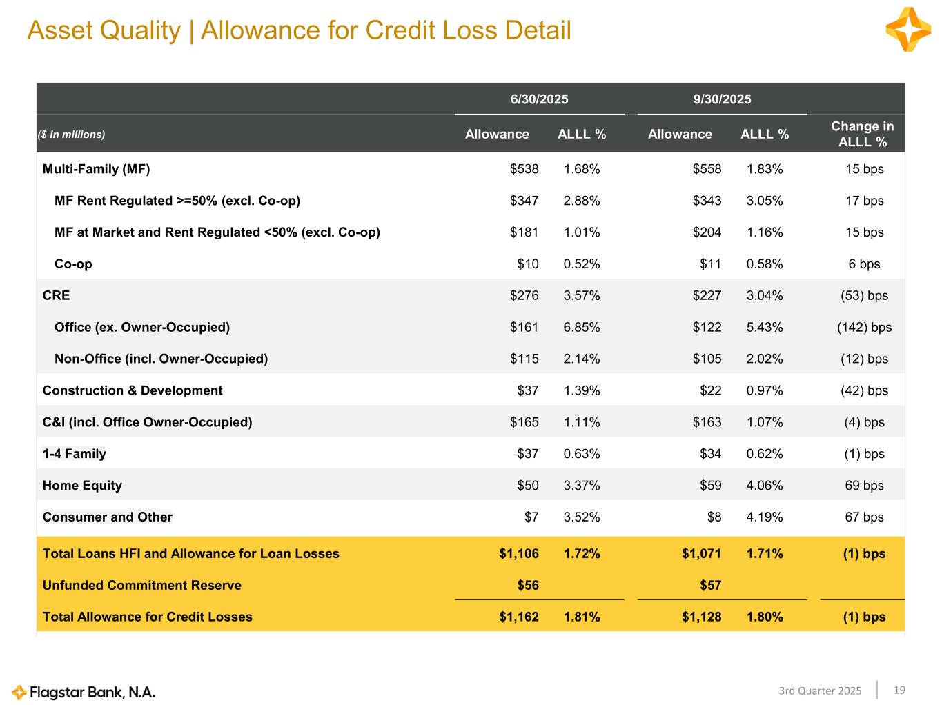 193rd Quarter 2025 6/30/2025 9/30/2025 ($ in millions) Allowance ALLL % Allowance ALLL % Change in ALLL % Multi-Family (MF) $538 1.68% $558 1.83% 15 bps MF Rent Regulated >=50% (excl. Co-op) $347 2.88% $343 3.05% 17 bps MF at Market and Rent Regulated <50% (excl. Co-op) $181 1.01% $204 1.16% 15 bps Co-op $10 0.52% $11 0.58% 6 bps CRE $276 3.57% $227 3.04% (53) bps Office (ex. Owner-Occupied) $161 6.85% $122 5.43% (142) bps Non-Office (incl. Owner-Occupied) $115 2.14% $105 2.02% (12) bps Construction & Development $37 1.39% $22 0.97% (42) bps C&I (incl. Office Owner-Occupied) $165 1.11% $163 1.07% (4) bps 1-4 Family $37 0.63% $34 0.62% (1) bps Home Equity $50 3.37% $59 4.06% 69 bps Consumer and Other $7 3.52% $8 4.19% 67 bps Total Loans HFI and Allowance for Loan Losses $1,106 1.72% $1,071 1.71% (1) bps Unfunded Commitment Reserve $56 $57 Total Allowance for Credit Losses $1,162 1.81% $1,128 1.80% (1) bps Asset Quality | Allowance for Credit Loss Detail