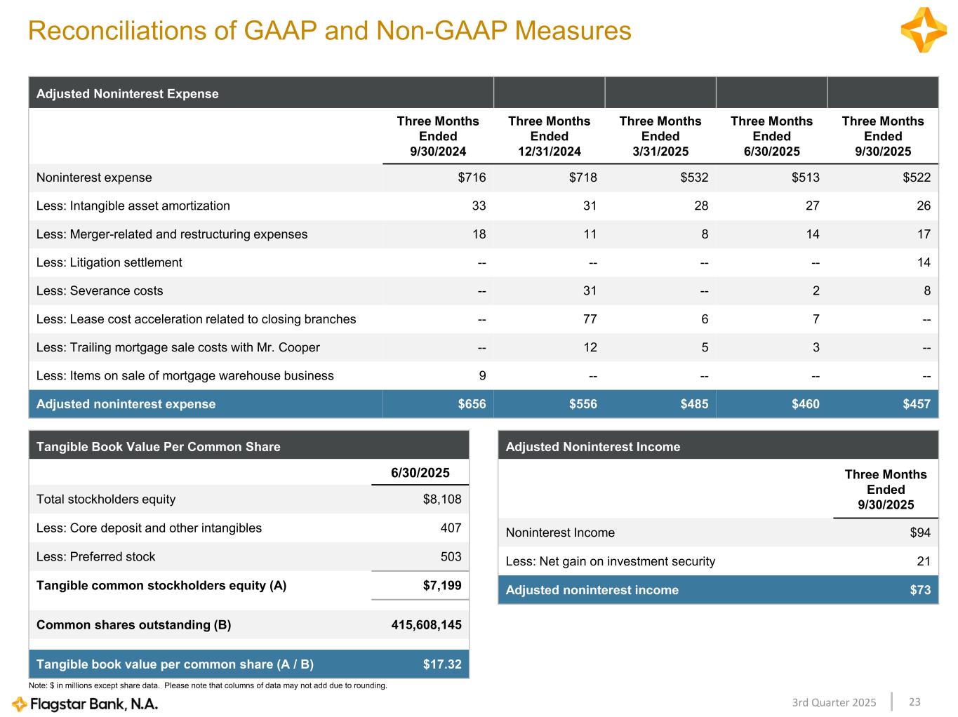 233rd Quarter 2025 Note: $ in millions except share data. Please note that columns of data may not add due to rounding. Reconciliations of GAAP and Non-GAAP Measures Tangible Book Value Per Common Share 6/30/2025 Total stockholders equity $8,108 Less: Core deposit and other intangibles 407 Less: Preferred stock 503 Tangible common stockholders equity (A) $7,199 Common shares outstanding (B) 415,608,145 Tangible book value per common share (A / B) $17.32 Adjusted Noninterest Expense Three Months Ended 9/30/2024 Three Months Ended 12/31/2024 Three Months Ended 3/31/2025 Three Months Ended 6/30/2025 Three Months Ended 9/30/2025 Noninterest expense $716 $718 $532 $513 $522 Less: Intangible asset amortization 33 31 28 27 26 Less: Merger-related and restructuring expenses 18 11 8 14 17 Less: Litigation settlement -- -- -- -- 14 Less: Severance costs -- 31 -- 2 8 Less: Lease cost acceleration related to closing branches -- 77 6 7 -- Less: Trailing mortgage sale costs with Mr. Cooper -- 12 5 3 -- Less: Items on sale of mortgage warehouse business 9 -- -- -- -- Adjusted noninterest expense $656 $556 $485 $460 $457 Adjusted Noninterest Income Three Months Ended 9/30/2025 Noninterest Income $94 Less: Net gain on investment security 21 Adjusted noninterest income $73