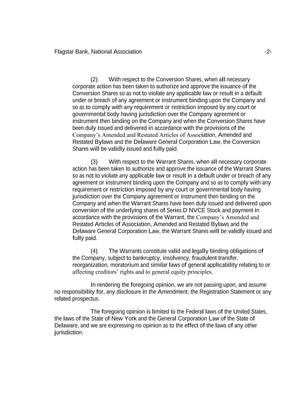 Flagstar Bank, National Association -2- (2) With respect to the Conversion Shares, when all necessary corporate action has been taken to authorize and approve the issuance of the Conversion Shares so as not to violate any applicable law or result in a default under or breach of any agreement or instrument binding upon the Company and so as to comply with any requirement or restriction imposed by any court or governmental body having jurisdiction over the Company agreement or instrument then binding on the Company and when the Conversion Shares have been duly issued and delivered in accordance with the provisions of the Company’s Amended and Restated Articles of Association, Amended and Restated Bylaws and the Delaware General Corporation Law, the Conversion Shares will be validly issued and fully paid. (3) With respect to the Warrant Shares, when all necessary corporate action has been taken to authorize and approve the issuance of the Warrant Shares so as not to violate any applicable law or result in a default under or breach of any agreement or instrument binding upon the Company and so as to comply with any requirement or restriction imposed by any court or governmental body having jurisdiction over the Company agreement or instrument then binding on the Company and when the Warrant Shares have been duly issued and delivered upon conversion of the underlying shares of Series D NVCE Stock and payment in accordance with the provisions of the Warrant, the Company’s Amended and Restated Articles of Association, Amended and Restated Bylaws and the Delaware General Corporation Law, the Warrant Shares will be validly issued and fully paid. (4) The Warrants constitute valid and legally binding obligations of the Company, subject to bankruptcy, insolvency, fraudulent transfer, reorganization, moratorium and similar laws of general applicability relating to or affecting creditors’ rights and to general equity principles. In rendering the foregoing opinion, we are not passing upon, and assume no responsibility for, any disclosure in the Amendment, the Registration Statement or any related prospectus. The foregoing opinion is limited to the Federal laws of the United States, the laws of the State of New York and the General Corporation Law of the State of Delaware, and we are expressing no opinion as to the effect of the laws of any other jurisdiction.