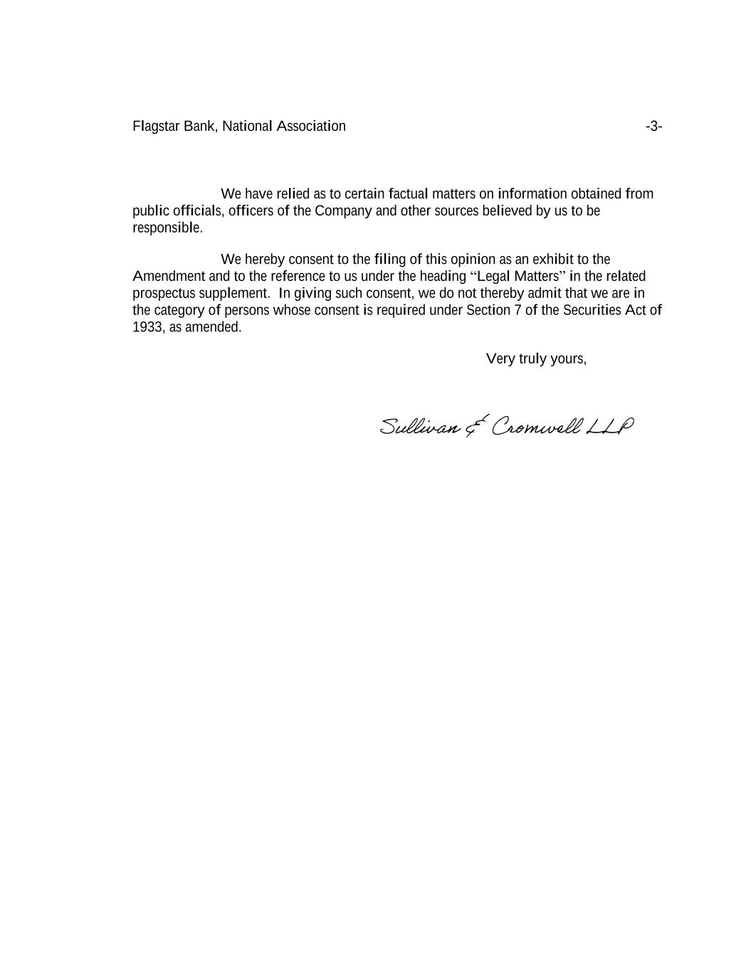 Flagstar Bank, National Association -3- We have relied as to certain factual matters on information obtained from public officials, officers of the Company and other sources believed by us to be responsible. We hereby consent to the filing of this opinion as an exhibit to the Amendment and to the reference to us under the heading “Legal Matters” in the related prospectus supplement. In giving such consent, we do not thereby admit that we are in the category of persons whose consent is required under Section 7 of the Securities Act of 1933, as amended. Very truly yours,