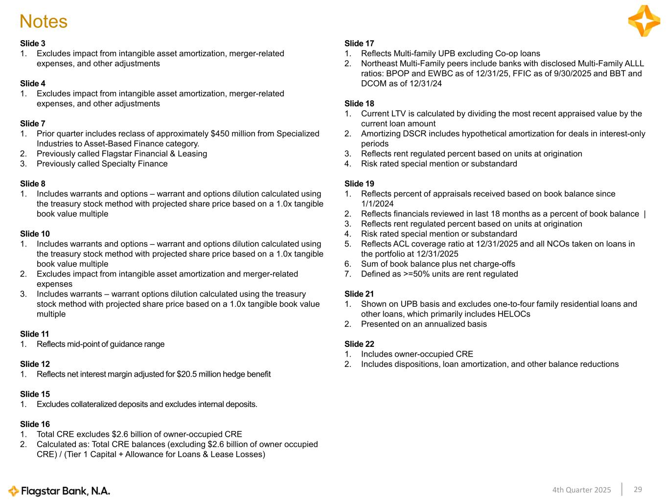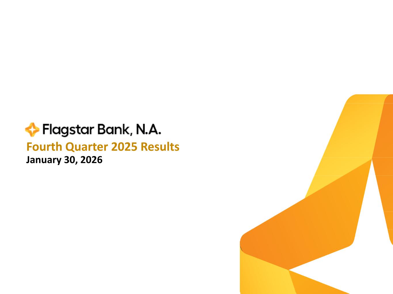 294th Quarter 2025 Notes Slide 3 1. Excludes impact from intangible asset amortization, merger-related expenses, and other adjustments Slide 4 1. Excludes impact from intangible asset amortization, merger-related expenses, and other adjustments Slide 7 1. Prior quarter includes reclass of approximately $450 million from Specialized Industries to Asset-Based Finance category. 2. Previously called Flagstar Financial & Leasing 3. Previously called Specialty Finance Slide 8 1. Includes warrants and options – warrant and options dilution calculated using the treasury stock method with projected share price based on a 1.0x tangible book value multiple Slide 10 1. Includes warrants and options – warrant and options dilution calculated using the treasury stock method with projected share price based on a 1.0x tangible book value multiple 2. Excludes impact from intangible asset amortization and merger-related expenses 3. Includes warrants – warrant options dilution calculated using the treasury stock method with projected share price based on a 1.0x tangible book value multiple Slide 11 1. Reflects mid-point of guidance range Slide 12 1. Reflects net interest margin adjusted for $20.5 million hedge benefit Slide 15 1. Excludes collateralized deposits and excludes internal deposits. Slide 16 1. Total CRE excludes $2.6 billion of owner-occupied CRE 2. Calculated as: Total CRE balances (excluding $2.6 billion of owner occupied CRE) / (Tier 1 Capital + Allowance for Loans & Lease Losses) Slide 17 1. Reflects Multi-family UPB excluding Co-op loans 2. Northeast Multi-Family peers include banks with disclosed Multi-Family ALLL ratios: BPOP and EWBC as of 12/31/25, FFIC as of 9/30/2025 and BBT and DCOM as of 12/31/24 Slide 18 1. Current LTV is calculated by dividing the most recent appraised value by the current loan amount 2. Amortizing DSCR includes hypothetical amortization for deals in interest-only periods 3. Reflects rent regulated percent based on units at origination 4. Risk rated special mention or substandard Slide 19 1. Reflects percent of appraisals received based on book balance since 1/1/2024 2. Reflects financials reviewed in last 18 months as a percent of book balance | 3. Reflects rent regulated percent based on units at origination 4. Risk rated special mention or substandard 5. Reflects ACL coverage ratio at 12/31/2025 and all NCOs taken on loans in the portfolio at 12/31/2025 6. Sum of book balance plus net charge-offs 7. Defined as >=50% units are rent regulated Slide 21 1. Shown on UPB basis and excludes one-to-four family residential loans and other loans, which primarily includes HELOCs 2. Presented on an annualized basis Slide 22 1. Includes owner-occupied CRE 2. Includes dispositions, loan amortization, and other balance reductions