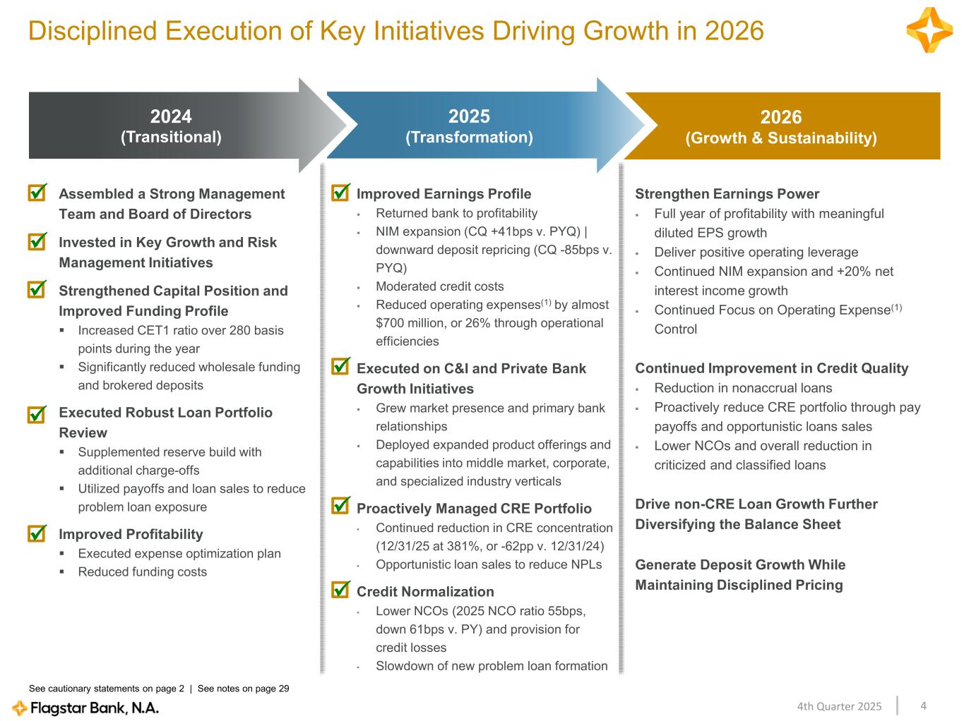 44th Quarter 2025 Improved Earnings Profile Returned bank to profitability NIM expansion (CQ +41bps v. PYQ) | downward deposit repricing (CQ -85bps v. PYQ) Moderated credit costs Reduced operating expenses(1) by almost $700 million, or 26% through operational efficiencies Executed on C&I and Private Bank Growth Initiatives Grew market presence and primary bank relationships Deployed expanded product offerings and capabilities into middle market, corporate, and specialized industry verticals Proactively Managed CRE Portfolio • Continued reduction in CRE concentration (12/31/25 at 381%, or -62pp v. 12/31/24) • Opportunistic loan sales to reduce NPLs Credit Normalization • Lower NCOs (2025 NCO ratio 55bps, down 61bps v. PY) and provision for credit losses • Slowdown of new problem loan formation Assembled a Strong Management Team and Board of Directors Invested in Key Growth and Risk Management Initiatives Strengthened Capital Position and Improved Funding Profile Increased CET1 ratio over 280 basis points during the year Significantly reduced wholesale funding and brokered deposits Executed Robust Loan Portfolio Review Supplemented reserve build with additional charge-offs Utilized payoffs and loan sales to reduce problem loan exposure Improved Profitability Executed expense optimization plan Reduced funding costs Disciplined Execution of Key Initiatives Driving Growth in 2026 See cautionary statements on page 2 | See notes on page 29 2026 (Growth & Sustainability) 2025 (Transformation) 2024 (Transitional) Strengthen Earnings Power Full year of profitability with meaningful diluted EPS growth Deliver positive operating leverage Continued NIM expansion and +20% net interest income growth Continued Focus on Operating Expense(1) Control Continued Improvement in Credit Quality Reduction in nonaccrual loans Proactively reduce CRE portfolio through pay payoffs and opportunistic loans sales Lower NCOs and overall reduction in criticized and classified loans Drive non-CRE Loan Growth Further Diversifying the Balance Sheet Generate Deposit Growth While Maintaining Disciplined Pricing