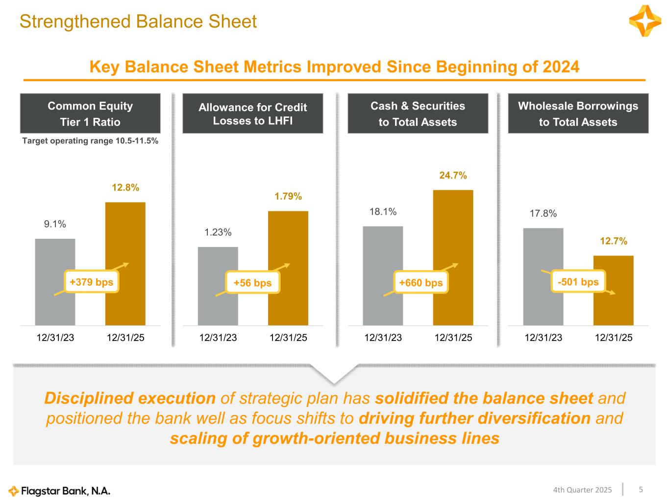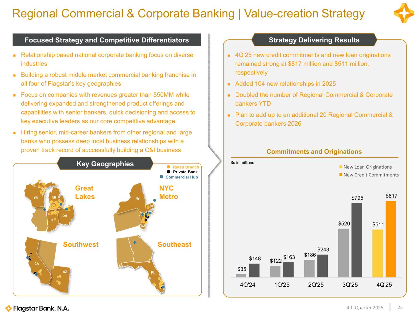 254th Quarter 2025 Regional Commercial & Corporate Banking | Value-creation Strategy Focused Strategy and Competitive Differentiators Strategy Delivering Results NY CT NJ WI MI IN OH Relationship based national corporate banking focus on diverse industries Building a robust middle market commercial banking franchise in all four of Flagstar’s key geographies Focus on companies with revenues greater than $50MM while delivering expanded and strengthened product offerings and capabilities with senior bankers, quick decisioning and access to key executive leaders as our core competitive advantage Hiring senior, mid-career bankers from other regional and large banks who possess deep local business relationships with a proven track record of successfully building a C&I business 4Q’25 new credit commitments and new loan originations remained strong at $817 million and $511 million, respectively Added 104 new relationships in 2025 Doubled the number of Regional Commercial & Corporate bankers YTD Plan to add up to an additional 20 Regional Commercial & Corporate bankers 2026 $35 $122 $186 $520 $511 $148 $163 $243 $795 $817 4Q'24 1Q'25 2Q'25 3Q'25 4Q'25 New Loan Originations New Credit Commitments Great Lakes NYC Metro Southwest Southeast Key Geographies Retail Branch Private Bank Commitments and Originations CA AZ Commercial Hub $s in millions