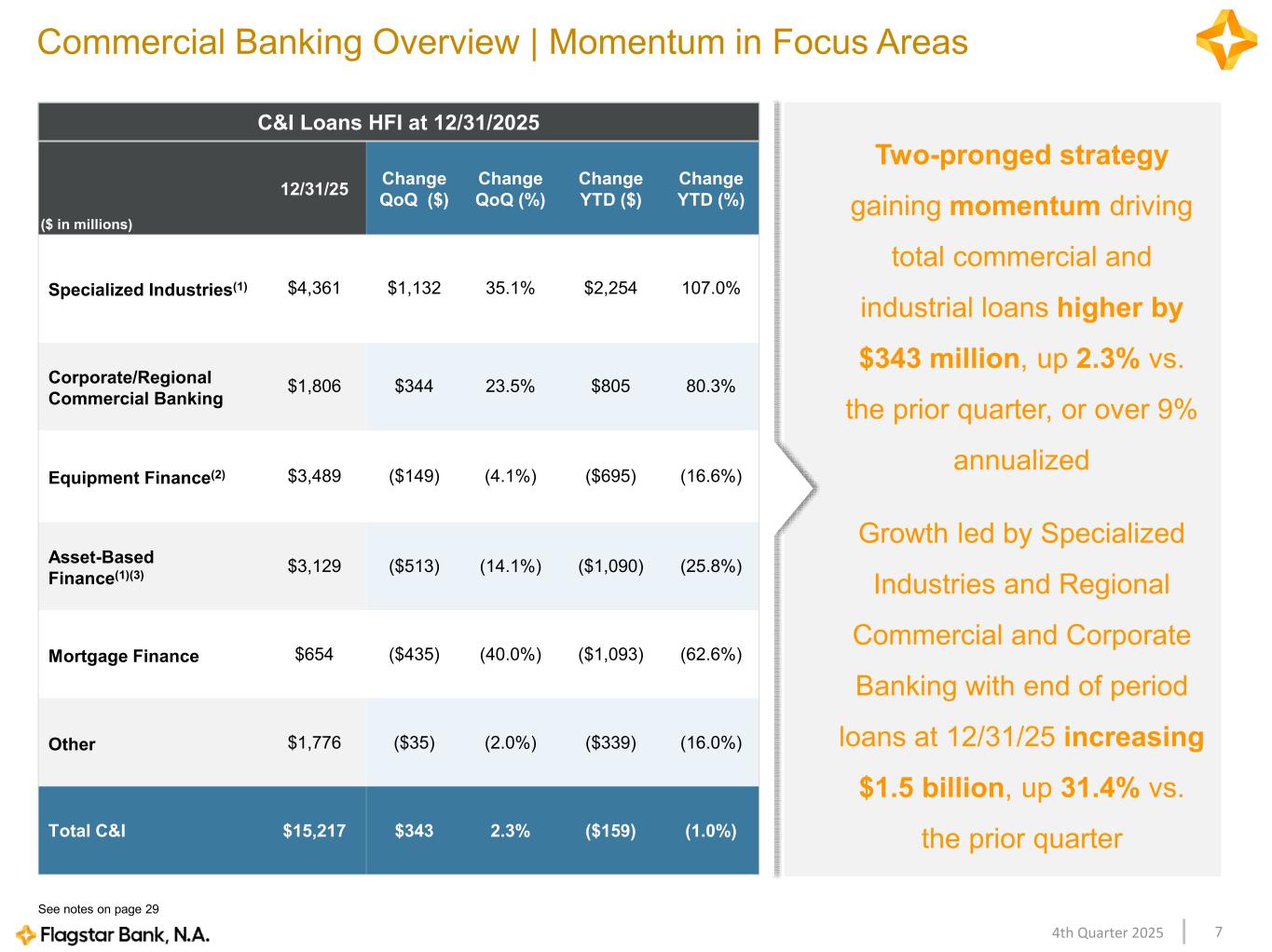 74th Quarter 2025 Commercial Banking Overview | Momentum in Focus Areas Two-pronged strategy gaining momentum driving total commercial and industrial loans higher by $343 million, up 2.3% vs. the prior quarter, or over 9% annualized Growth led by Specialized Industries and Regional Commercial and Corporate Banking with end of period loans at 12/31/25 increasing $1.5 billion, up 31.4% vs. the prior quarter C&I Loans HFI at 12/31/2025 ($ in millions) 12/31/25 Change QoQ ($) Change QoQ (%) Change YTD ($) Change YTD (%) Specialized Industries(1) $4,361 $1,132 35.1% $2,254 107.0% Corporate/Regional Commercial Banking $1,806 $344 23.5% $805 80.3% Equipment Finance(2) $3,489 ($149) (4.1%) ($695) (16.6%) Asset-Based Finance(1)(3) $3,129 ($513) (14.1%) ($1,090) (25.8%) Mortgage Finance $654 ($435) (40.0%) ($1,093) (62.6%) Other $1,776 ($35) (2.0%) ($339) (16.0%) Total C&I $15,217 $343 2.3% ($159) (1.0%) See notes on page 29