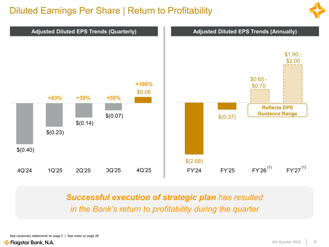 84th Quarter 2025 $(0.40) $(0.23) $(0.14) $(0.07) $0.06 Diluted Earnings Per Share | Return to Profitability Adjusted Diluted EPS Trends (Quarterly) Reflects EPS Guidance Range $0.65 - $0.70 $1.90 - $2.00 +43% +39% +50% 4Q’24 1Q’25 2Q’25 3Q’25 4Q’25 FY’26 FY’27 +186% FY’25 $(0.37) See cautionary statements on page 2 | See notes on page 29 Adjusted Diluted EPS Trends (Annually) FY’24 $(2.68) Successful execution of strategic plan has resulted in the Bank’s return to profitability during the quarter (1) (1)