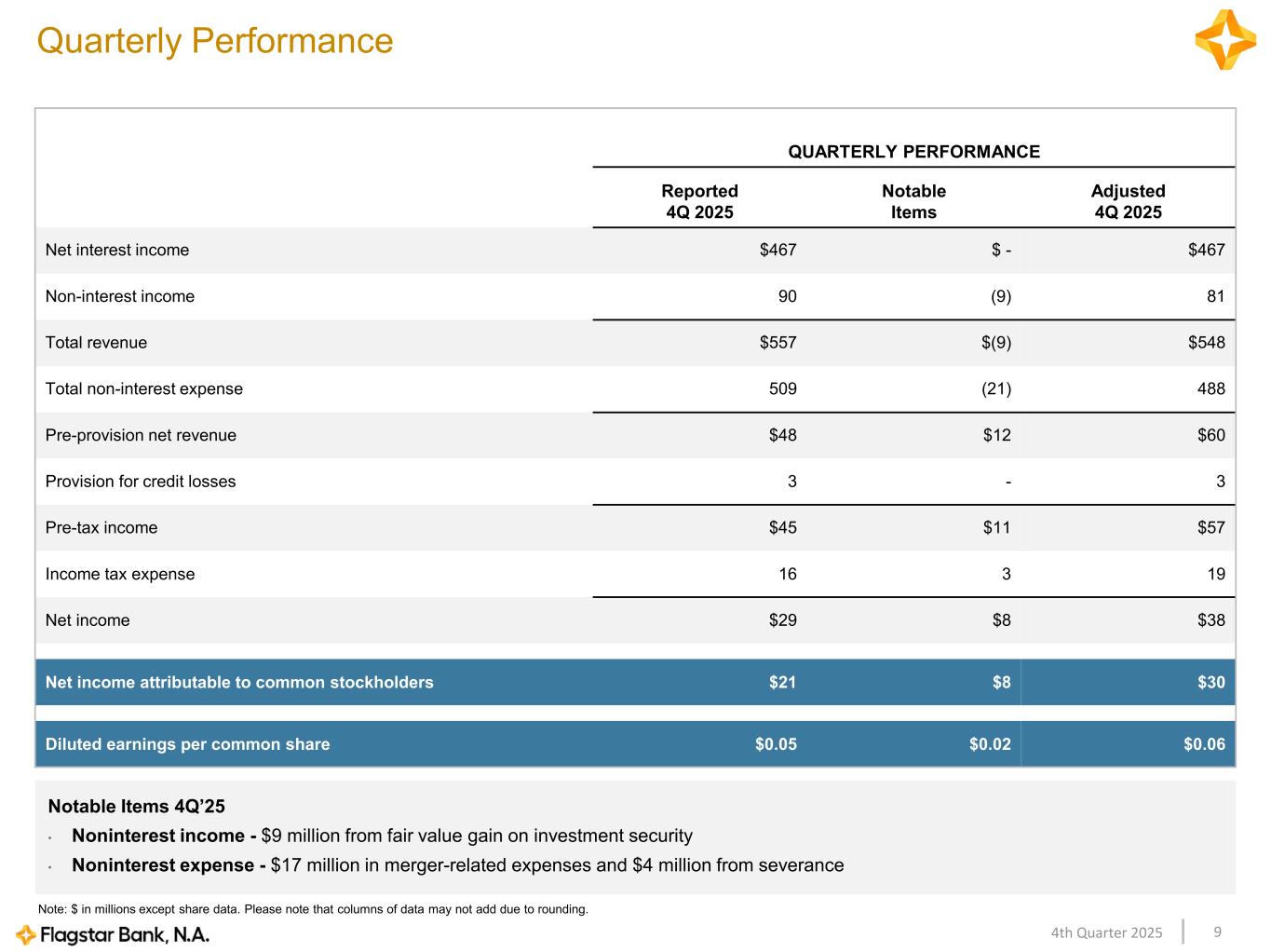 94th Quarter 2025 Note: $ in millions except share data. Please note that columns of data may not add due to rounding. Quarterly Performance QUARTERLY PERFORMANCE Reported 4Q 2025 Notable Items Adjusted 4Q 2025 Net interest income $467 $ - $467 Non-interest income 90 (9) 81 Total revenue $557 $(9) $548 Total non-interest expense 509 (21) 488 Pre-provision net revenue $48 $12 $60 Provision for credit losses 3 - 3 Pre-tax income $45 $11 $57 Income tax expense 16 3 19 Net income $29 $8 $38 Net income attributable to common stockholders $21 $8 $30 Diluted earnings per common share $0.05 $0.02 $0.06 Notable Items 4Q’25 • Noninterest income - $9 million from fair value gain on investment security • Noninterest expense - $17 million in merger-related expenses and $4 million from severance