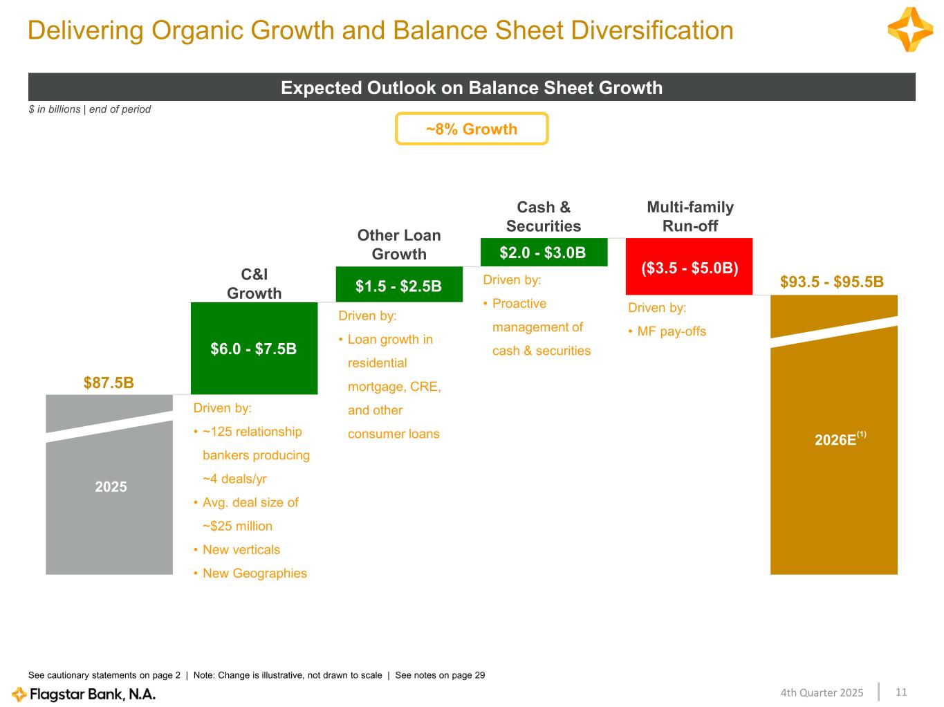 114th Quarter 2025 Delivering Organic Growth and Balance Sheet Diversification Expected Outlook on Balance Sheet Growth See cautionary statements on page 2 | Note: Change is illustrative, not drawn to scale | See notes on page 29 $87.5B ~8% Growth (1) $93.5 - $95.5B 2026E 2025 Driven by: • ~125 relationship bankers producing ~4 deals/yr • Avg. deal size of ~$25 million • New verticals • New Geographies $ in billions | end of period $6.0 - $7.5B ($3.5 - $5.0B) $2.0 - $3.0B $1.5 - $2.5B Driven by: • Loan growth in residential mortgage, CRE, and other consumer loans Driven by: • Proactive management of cash & securities Driven by: • MF pay-offs C&I Growth Other Loan Growth Cash & Securities Multi-family Run-off