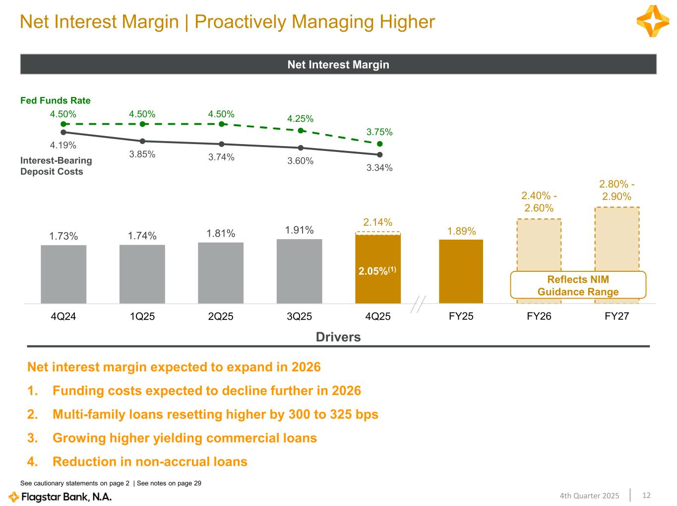124th Quarter 2025 1.73% 1.74% 1.81% 1.91% 2.14% 4Q24 1Q25 2Q25 3Q25 4Q25 FY25 FY26 FY27 4.19% 3.85% 3.74% 3.60% 3.34% 4.50% 4.50% 4.50% 4.25% 3.75% Net Interest Margin | Proactively Managing Higher Net Interest Margin Net interest margin expected to expand in 2026 1. Funding costs expected to decline further in 2026 2. Multi-family loans resetting higher by 300 to 325 bps 3. Growing higher yielding commercial loans 4. Reduction in non-accrual loans Drivers See cautionary statements on page 2 | See notes on page 29 Interest-Bearing Deposit Costs Fed Funds Rate Reflects NIM Guidance Range 1.89% 2.40% - 2.60% 2.80% - 2.90% 2.05%(1)