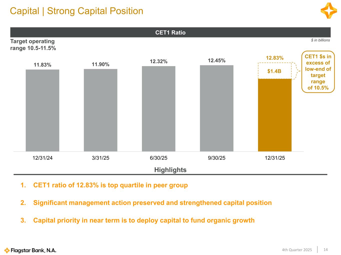 144th Quarter 2025 11.83% 11.90% 12.32% 12.45% 12.83% 12/31/24 3/31/25 6/30/25 9/30/25 12/31/25 Capital | Strong Capital Position CET1 Ratio Target operating range 10.5-11.5% 1. CET1 ratio of 12.83% is top quartile in peer group 2. Significant management action preserved and strengthened capital position 3. Capital priority in near term is to deploy capital to fund organic growth Highlights $1.4B $ in billions CET1 $s in excess of low-end of target range of 10.5%