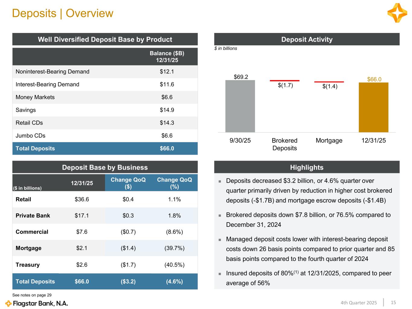 154th Quarter 2025 Balance ($B) 12/31/25 Noninterest-Bearing Demand $12.1 Interest-Bearing Demand $11.6 Money Markets $6.6 Savings $14.9 Retail CDs $14.3 Jumbo CDs $6.6 Total Deposits $66.0 Deposits | Overview Deposit ActivityWell Diversified Deposit Base by Product Deposits decreased $3.2 billion, or 4.6% quarter over quarter primarily driven by reduction in higher cost brokered deposits (-$1.7B) and mortgage escrow deposits (-$1.4B) Brokered deposits down $7.8 billion, or 76.5% compared to December 31, 2024 Managed deposit costs lower with interest-bearing deposit costs down 26 basis points compared to prior quarter and 85 basis points compared to the fourth quarter of 2024 Insured deposits of 80%(1) at 12/31/2025, compared to peer average of 56% HighlightsDeposit Base by Business ($ in billions) 12/31/25 Change QoQ ($) Change QoQ (%) Retail $36.6 $0.4 1.1% Private Bank $17.1 $0.3 1.8% Commercial $7.6 ($0.7) (8.6%) Mortgage $2.1 ($1.4) (39.7%) Treasury $2.6 ($1.7) (40.5%) Total Deposits $66.0 ($3.2) (4.6%) $ in billions $69.2 $(1.7) $(1.4) $66.0 9/30/25 Brokered Deposits Mortgage 12/31/25 See notes on page 29