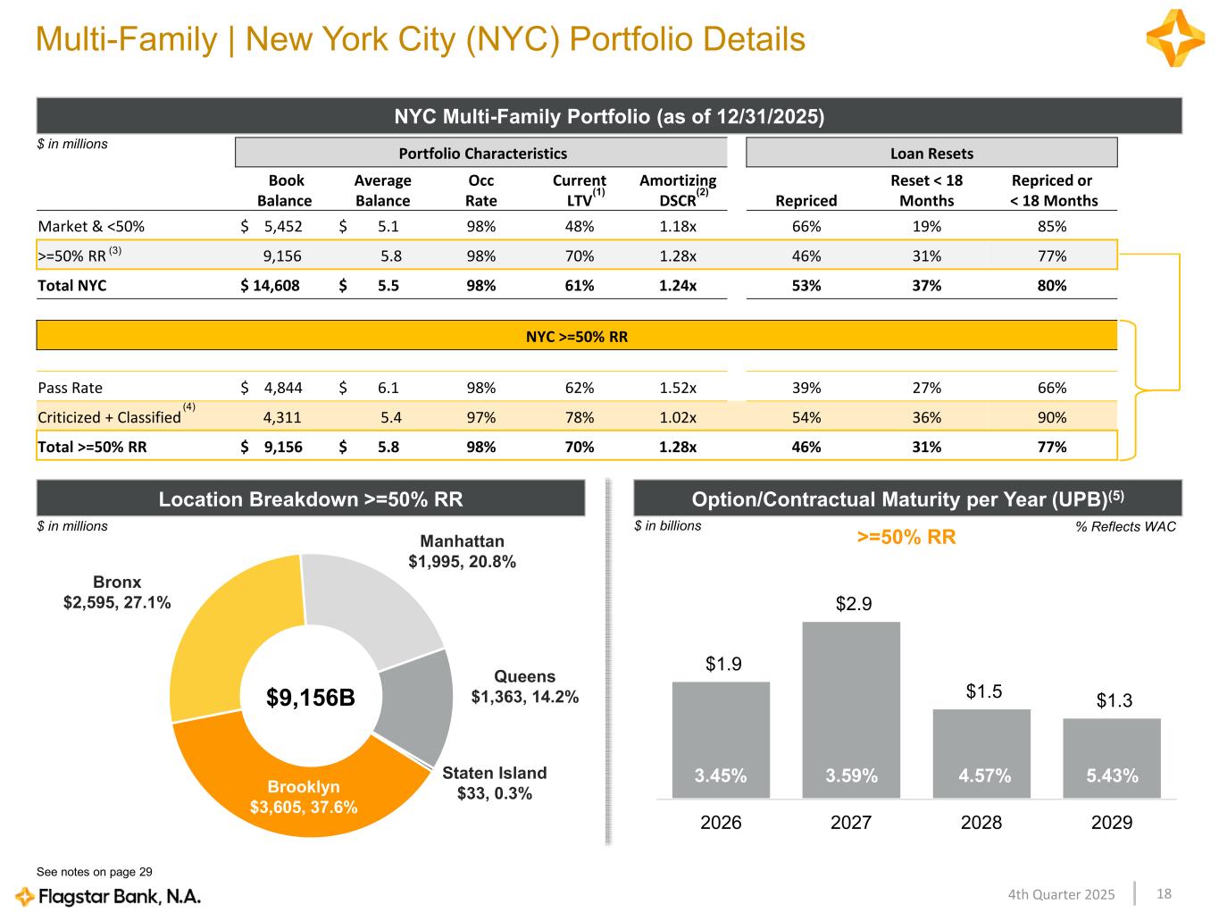 184th Quarter 2025 Portfolio Characteristics Loan Resets Book Balance Average Balance Occ Rate Current LTV Amortizing DSCR Repriced Reset < 18 Months Repriced or < 18 Months Market & <50% $ 5,452 $ 5.1 98% 48% 1.18x 66% 19% 85% >=50% RR 9,156 5.8 98% 70% 1.28x 46% 31% 77% Total NYC $ 14,608 $ 5.5 98% 61% 1.24x 53% 37% 80% NYC >=50% RR Pass Rate $ 4,844 $ 6.1 98% 62% 1.52x 39% 27% 66% Criticized + Classified 4,311 5.4 97% 78% 1.02x 54% 36% 90% Total >=50% RR $ 9,156 $ 5.8 98% 70% 1.28x 46% 31% 77% Multi-Family | New York City (NYC) Portfolio Details NYC Multi-Family Portfolio (as of 12/31/2025) $ in millions (3) (1) (2) Location Breakdown >=50% RR $ in millions (4) $9,156B Manhattan $1,995, 20.8% Queens $1,363, 14.2% Staten Island $33, 0.3% Brooklyn $3,605, 37.6% Bronx $2,595, 27.1% $1.9 $2.9 $1.5 $1.3 2026 2027 2028 2029 Option/Contractual Maturity per Year (UPB)(5) $ in billions % Reflects WAC >=50% RR See notes on page 29 3.45% 3.59% 5.43%4.57%