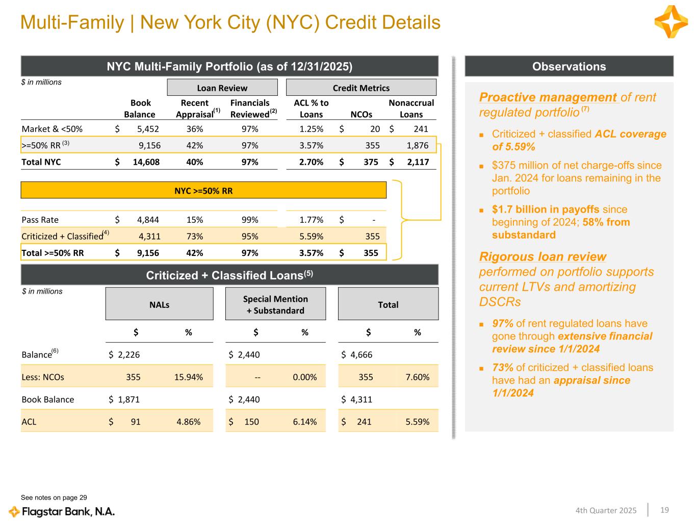 174th Quarter 2025 Multi-Family | Portfolio Overview Highlights Multi-Family portfolio ALLL at 1.89%, among the highest relative to peers(2) | MF ALLL reflects the mix of the company’s loans including the rent-regulated loans MF rent regulated >= 50% ALLL at 3.44% Average loan size of $8.6 million $5.9 billion of MF loans reached a repricing date since the beginning of 2024. Adjusting for the impact of the one large relationship in NAL, close to 90% remain current or paid off Have taken $538 million of net charge-offs since Jan. 2024 $32.0 $31.5 $30.0 $28.8 $27.1 12/31/24 3/31/25 6/30/25 9/30/25 12/31/25 Proactively Reducing Multi-Family (MF) Exposure(1) -15% $ in billions 1.9% 1.3% 0.7% 0.6% 0.5% 0.3% Peer 1 Peer 2 Peer 3 Peer 4 Peer 5 Multi-Family ALLL Ratio vs Peers(2) $4.7 $8.2 $5.4 $3.5 2026 2027 2028 2029 Option/Contractual Maturity per Year (UPB)(1) $ in billions % Reflects WAC See notes on page 29 3.53% 3.73% 4.66%4.26%