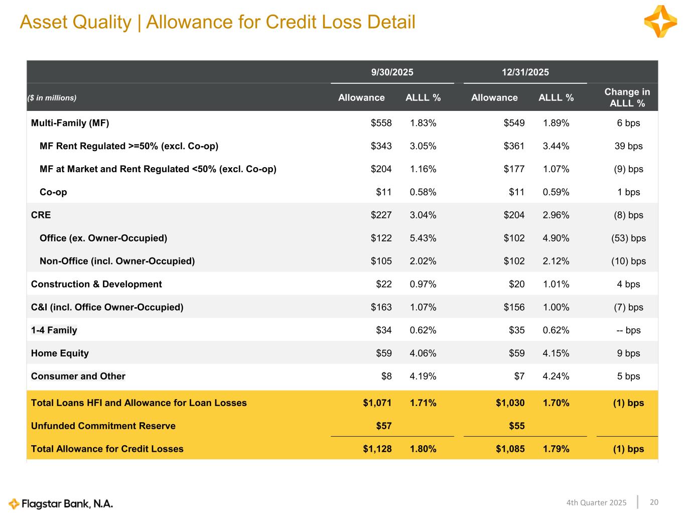 204th Quarter 2025 9/30/2025 12/31/2025 ($ in millions) Allowance ALLL % Allowance ALLL % Change in ALLL % Multi-Family (MF) $558 1.83% $549 1.89% 6 bps MF Rent Regulated >=50% (excl. Co-op) $343 3.05% $361 3.44% 39 bps MF at Market and Rent Regulated <50% (excl. Co-op) $204 1.16% $177 1.07% (9) bps Co-op $11 0.58% $11 0.59% 1 bps CRE $227 3.04% $204 2.96% (8) bps Office (ex. Owner-Occupied) $122 5.43% $102 4.90% (53) bps Non-Office (incl. Owner-Occupied) $105 2.02% $102 2.12% (10) bps Construction & Development $22 0.97% $20 1.01% 4 bps C&I (incl. Office Owner-Occupied) $163 1.07% $156 1.00% (7) bps 1-4 Family $34 0.62% $35 0.62% -- bps Home Equity $59 4.06% $59 4.15% 9 bps Consumer and Other $8 4.19% $7 4.24% 5 bps Total Loans HFI and Allowance for Loan Losses $1,071 1.71% $1,030 1.70% (1) bps Unfunded Commitment Reserve $57 $55 Total Allowance for Credit Losses $1,128 1.80% $1,085 1.79% (1) bps Asset Quality | Allowance for Credit Loss Detail