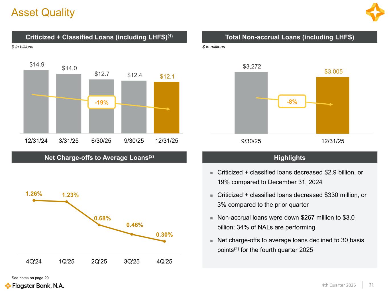 24th Quarter 2025 Cautionary Statement Forward-Looking Information This earnings presentation and the associated conference call may include forward‐looking statements by us and our authorized officers pertaining to such matters as our goals, beliefs, intentions, and expectations regarding, among other things: (a) revenues, earnings, loan production, asset quality, liquidity position, capital levels, risk analysis, divestitures, acquisitions, and other material transactions, among other matters; (b) the future costs and benefits of the actions we may take; (c) our assessments of credit risk and probable losses on loans and associated allowances and reserves; (d) our assessments of interest rate and other market risks; (e) our ability to achieve profitability goals within projected timeframes and to execute on our strategic plan, including the sufficiency of our internal resources, procedures and systems; (f) our ability to attract, incentivize, and retain key personnel and the roles of key personnel; (g) our ability to achieve our financial and other strategic goals, including those related to our recent holding company reorganization, which was completed in October 2025, our merger with Flagstar Bancorp, Inc., which was completed in December 2022, our acquisition of substantial portions of the former Signature Bank through an FDIC-assisted transaction, which was completed in March 2023, and our ability to comply with the heightened regulatory standards with respect to governance and risk management which we are subject to as a national bank with assets of $50 billion or more; (h) the impact of the $1.05 billion capital raise we completed in March 2024; (i) our previously disclosed material weaknesses in internal control over financial reporting; (j) the conversion or exchange of shares of our preferred stock; (k) the payment of dividends on shares of our capital stock, including adjustments to the amount of dividends payable on shares of our preferred stock; (l) the availability of equity and dilution of existing equity holders associated with future equity awards and stock issuances; (m) the effects of the reverse stock split we effected in July 2024; and (n) the impact of the recent sale of our mortgage servicing operations, third party mortgage loan origination business, and mortgage warehouse business. Forward‐looking statements are typically identified by such words as “believe,” “expect,” “anticipate,” “intend,” “outlook,” “estimate,” “forecast,” “project,” “should,” "confident," and other similar words and expressions, and are subject to numerous assumptions, risks, and uncertainties, which change over time. Additionally, forward‐looking statements speak only as of the date they are made; we do not assume any duty, and do not undertake, to update our forward‐looking statements. Furthermore, because forward‐looking statements are subject to assumptions and uncertainties, actual results or future events could differ, possibly materially, from those anticipated in our statements, and our future performance could differ materially from our historical results. Our forward‐looking statements are subject to, among others, the following principal risks and uncertainties: general economic conditions and trends, either nationally or locally; conditions in the securities, credit and financial markets; changes in interest rates; changes in deposit flows, and in the demand for deposit, loan, and investment products and other financial services; changes in real estate values; changes in the quality or composition of our loan or investment portfolios, including associated allowances and reserves; changes in future allowance for credit losses, including changes required under relevant accounting and regulatory requirements; the ability to pay future dividends; changes in our capital management and balance sheet strategies and our ability to successfully implement such strategies; our ability to achieve the anticipated benefits of our recently completed holding company reorganization transaction; changes in our Board of Directors or executive management team; changes in our strategic plan, including changes in our internal resources, procedures and systems, and our ability to successfully implement such plan; our ability to successfully remediate our previously disclosed material weaknesses in internal control over financial reporting; changes in competitive pressures among financial institutions or from non‐financial institutions; changes in legislation, regulations, and policies; the impacts of tariffs, sanctions and other trade policies of the United States and its global trading counterparts; the outcome of federal, state, and local elections and the resulting economic and other impact on the areas in which we conduct business; the impact of changing political conditions; the imposition of restrictions on our operations by bank regulators; the outcome of pending or threatened litigation, or of investigations or any other matters before regulatory agencies, whether currently existing or commencing in the future; our ability to comply with heightened regulatory standards with respect to governance and risk management which we are subject to as a national bank with assets $50 billion or more; the restructuring of our mortgage business; our ability to recognize anticipated cost savings and enhanced efficiencies with respect to our balance sheet and expense reduction strategies; the impact of failures or disruptions in or breaches of our operational or security systems, data or infrastructure, or those of third parties, including as a result of cyberattacks or campaigns; the impact of natural disasters, extreme weather events, civil unrest, international military conflict, terrorism or other geopolitical events; and a variety of other matters which, by their nature, are subject to significant uncertainties and/or are beyond our control. Our forward