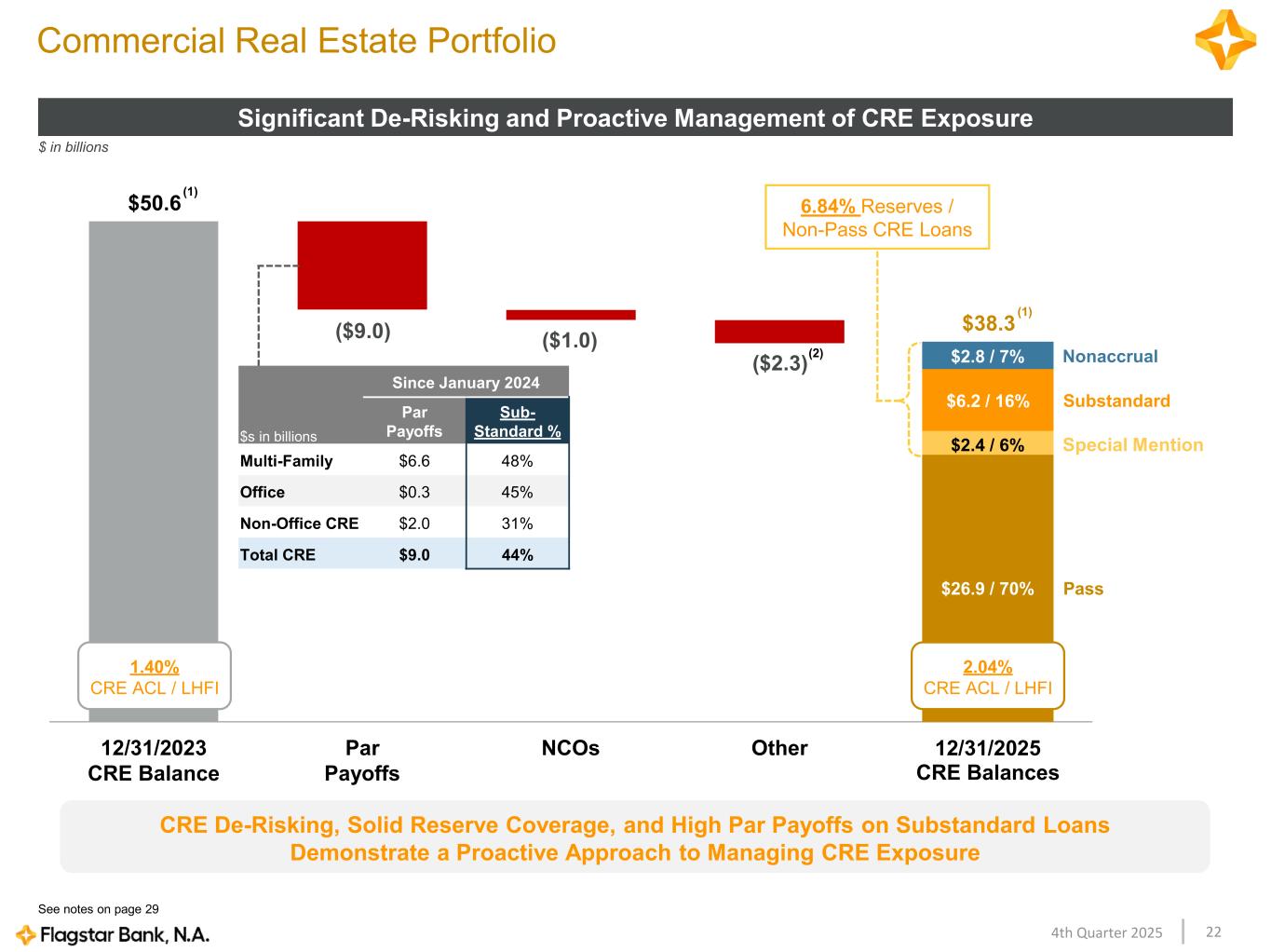 224th Quarter 2025 12/31/2023 CRE Balance Par Payoffs NCOs Other Commercial Real Estate Portfolio Significant De-Risking and Proactive Management of CRE Exposure See notes on page 29 CRE De-Risking, Solid Reserve Coverage, and High Par Payoffs on Substandard Loans Demonstrate a Proactive Approach to Managing CRE Exposure $50.6 ($9.0) $ in billions $38.3 ($1.0) ($2.3) Since January 2024 $s in billions Par Payoffs Sub- Standard % Multi-Family $6.6 48% Office $0.3 45% Non-Office CRE $2.0 31% Total CRE $9.0 44% 12/31/2025 CRE Balances $2.8 / 7% $26.9 / 70% $2.4 / 6% $6.2 / 16% (2) (1) (1) Pass Special Mention Substandard Nonaccrual 6.84% Reserves / Non-Pass CRE Loans 2.04% CRE ACL / LHFI 1.40% CRE ACL / LHFI