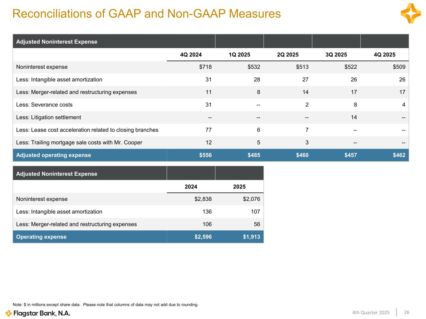 264th Quarter 2025 Note: $ in millions except share data. Please note that columns of data may not add due to rounding. Reconciliations of GAAP and Non-GAAP Measures Adjusted Noninterest Expense 4Q 2024 1Q 2025 2Q 2025 3Q 2025 4Q 2025 Noninterest expense $718 $532 $513 $522 $509 Less: Intangible asset amortization 31 28 27 26 26 Less: Merger-related and restructuring expenses 11 8 14 17 17 Less: Severance costs 31 -- 2 8 4 Less: Litigation settlement -- -- -- 14 -- Less: Lease cost acceleration related to closing branches 77 6 7 -- -- Less: Trailing mortgage sale costs with Mr. Cooper 12 5 3 -- -- Adjusted operating expense $556 $485 $460 $457 $462 Adjusted Noninterest Expense 2024 2025 Noninterest expense $2,838 $2,076 Less: Intangible asset amortization 136 107 Less: Merger-related and restructuring expenses 106 56 Operating expense $2,596 $1,913