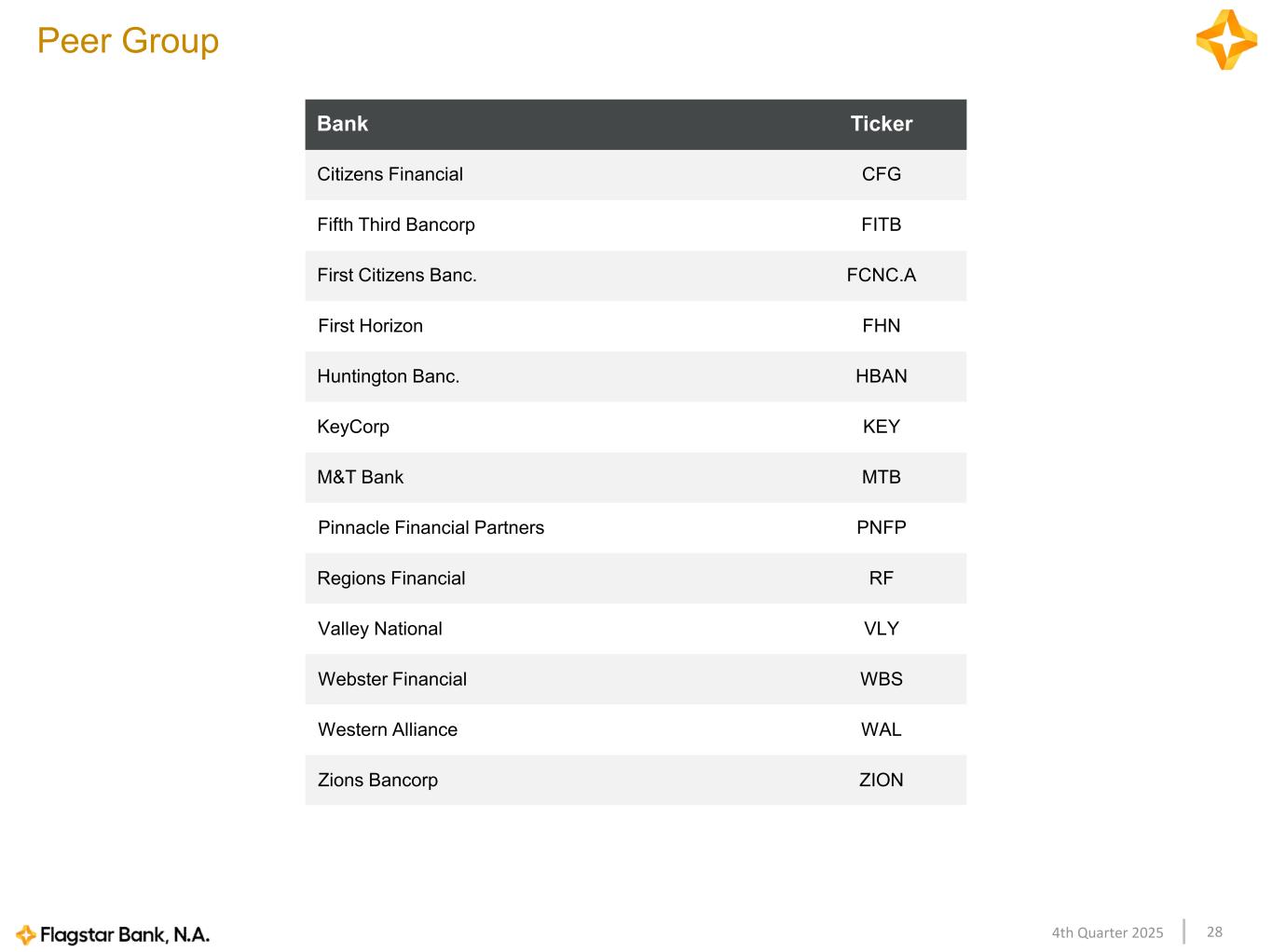 284th Quarter 2025 Bank Ticker Citizens Financial CFG Fifth Third Bancorp FITB First Citizens Banc. FCNC.A First Horizon FHN Huntington Banc. HBAN KeyCorp KEY M&T Bank MTB Pinnacle Financial Partners PNFP Regions Financial RF Valley National VLY Webster Financial WBS Western Alliance WAL Zions Bancorp ZION Peer Group